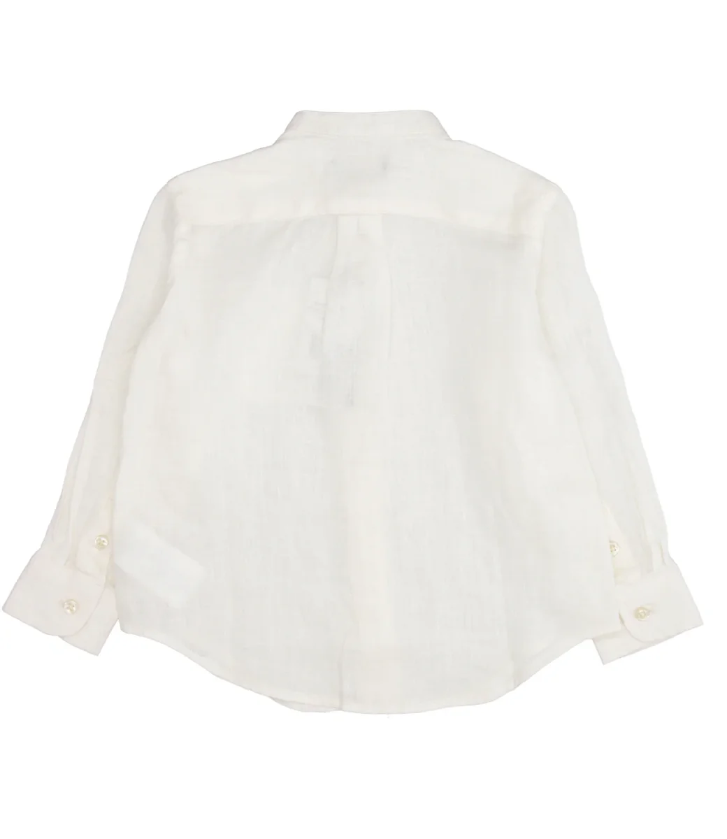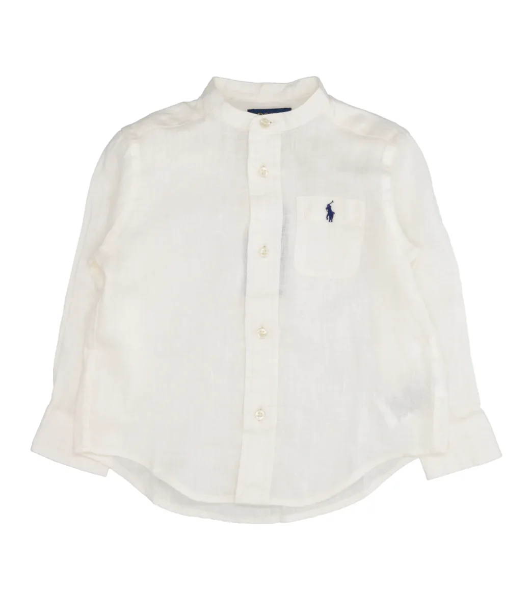 Camicia Ralph Lauren Childrenswear in lino, collo alla coreana, chiusura frontale integrale con bottoni, maniche lunghe con polsini e bottoni, carré posteriore con pieghe a cannoncino.