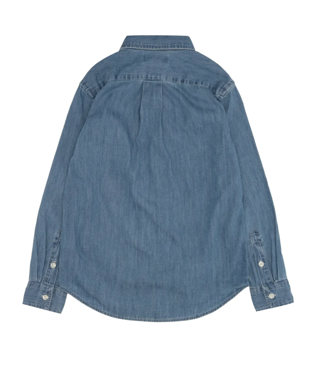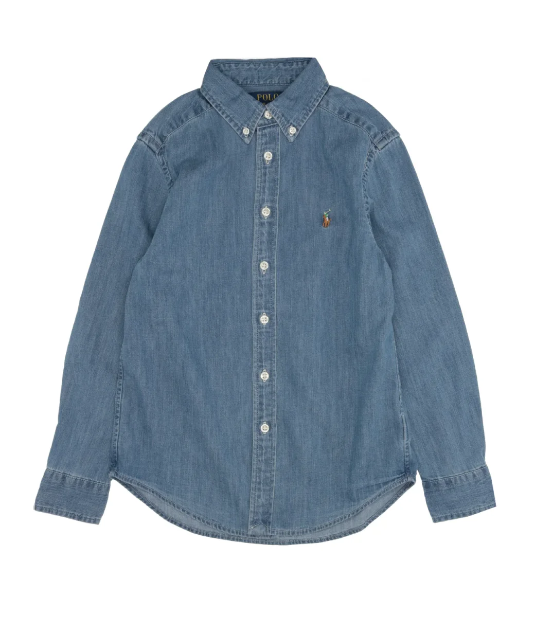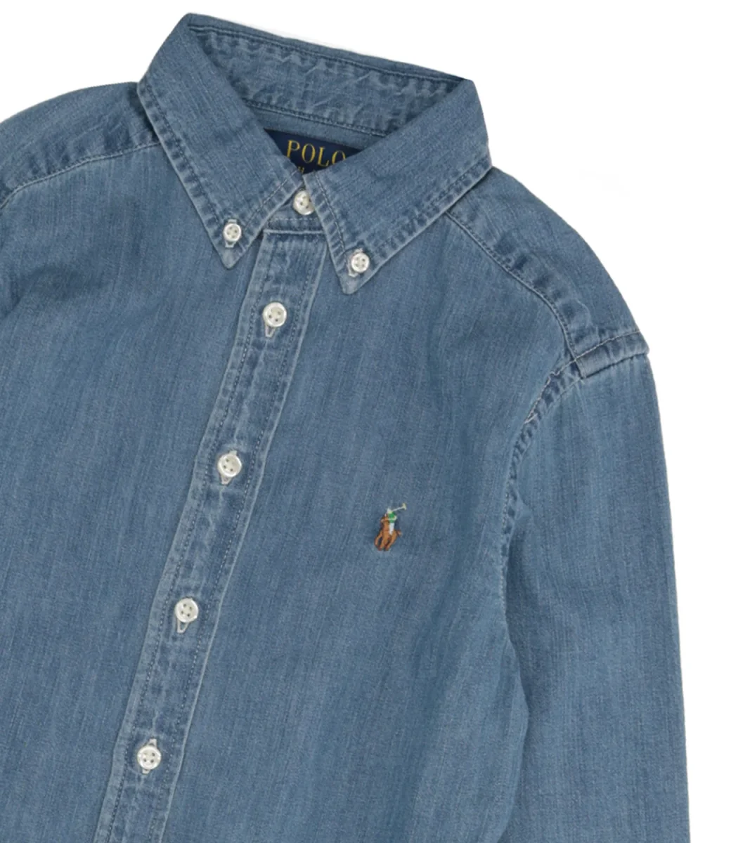 Camicia Ralph Lauren Childrenswear modello iconico della camicia sportiva in un denim leggero proprio dello stile Polo, Realizzata in denim di cotone, collo button-down, con Pony ricamato sul lato sinistro del torace, maniche lunghe con polsini, chiusura frontale con bottoni.