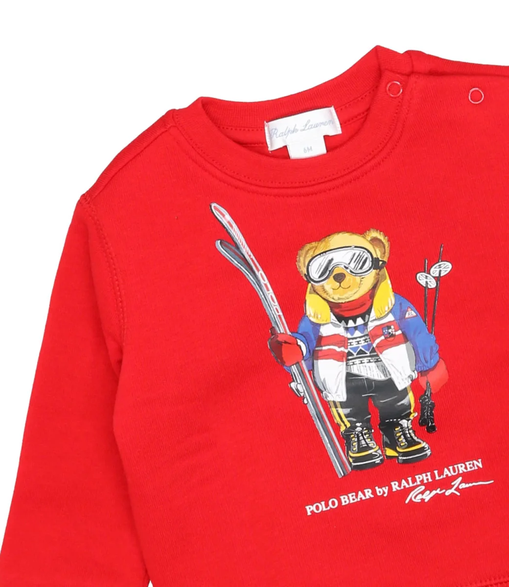 Felpa a maniche lunghe con polsini e fondo a costine. Chiusura sulla spalla sinistra con bottoni automatici e stampa frontale dell’iconico Polo Bear in tenuta da neve.