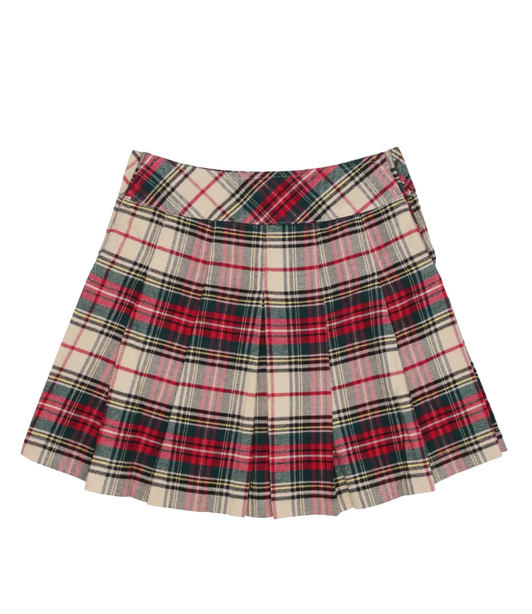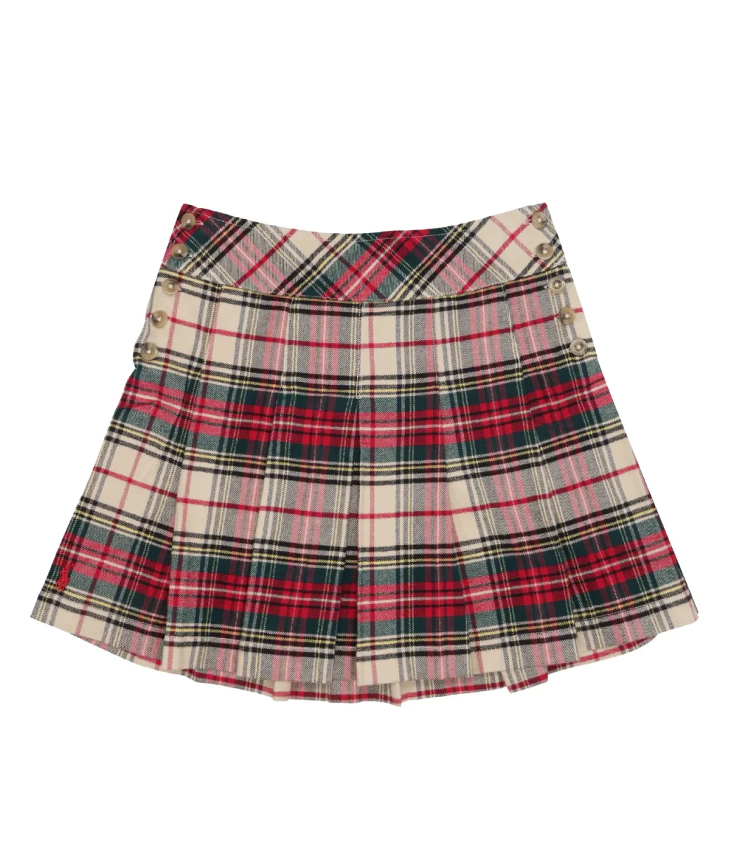 Gonna Ralph Lauren Childrenswear in twill di cotone tinto in filo in motivo scozzese, vita regolare, chiusura a cinque bottoni lungo entrambi i fianchi, modello svasato con pieghe, orlo dritto.