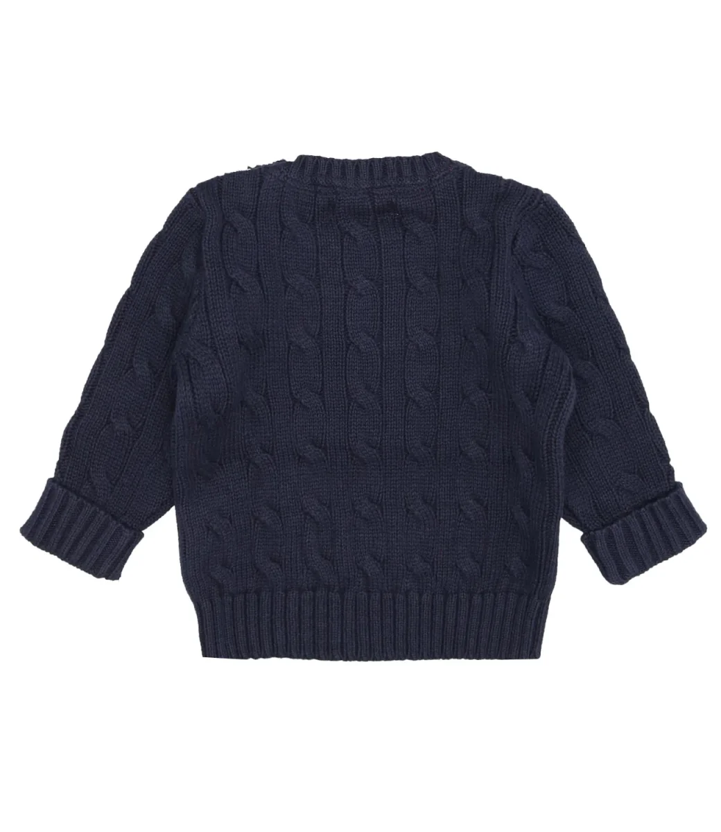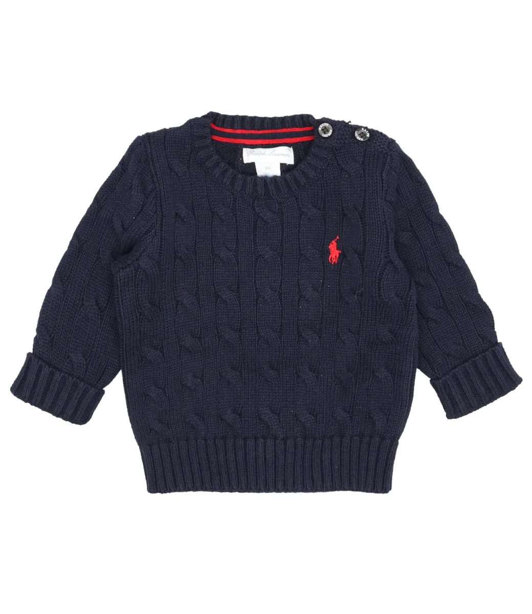 Maglia Ralph Lauren Childrenswear in cotone, modello classico con motivo a trecce, girocollo, chiusura con bottoni sulla spalla sinistra, esclusivo pony ricamato sul lato sinistro del torace, maniche lunghe con polsini ripiegati lavorati a coste, fondo con bordo a coste.