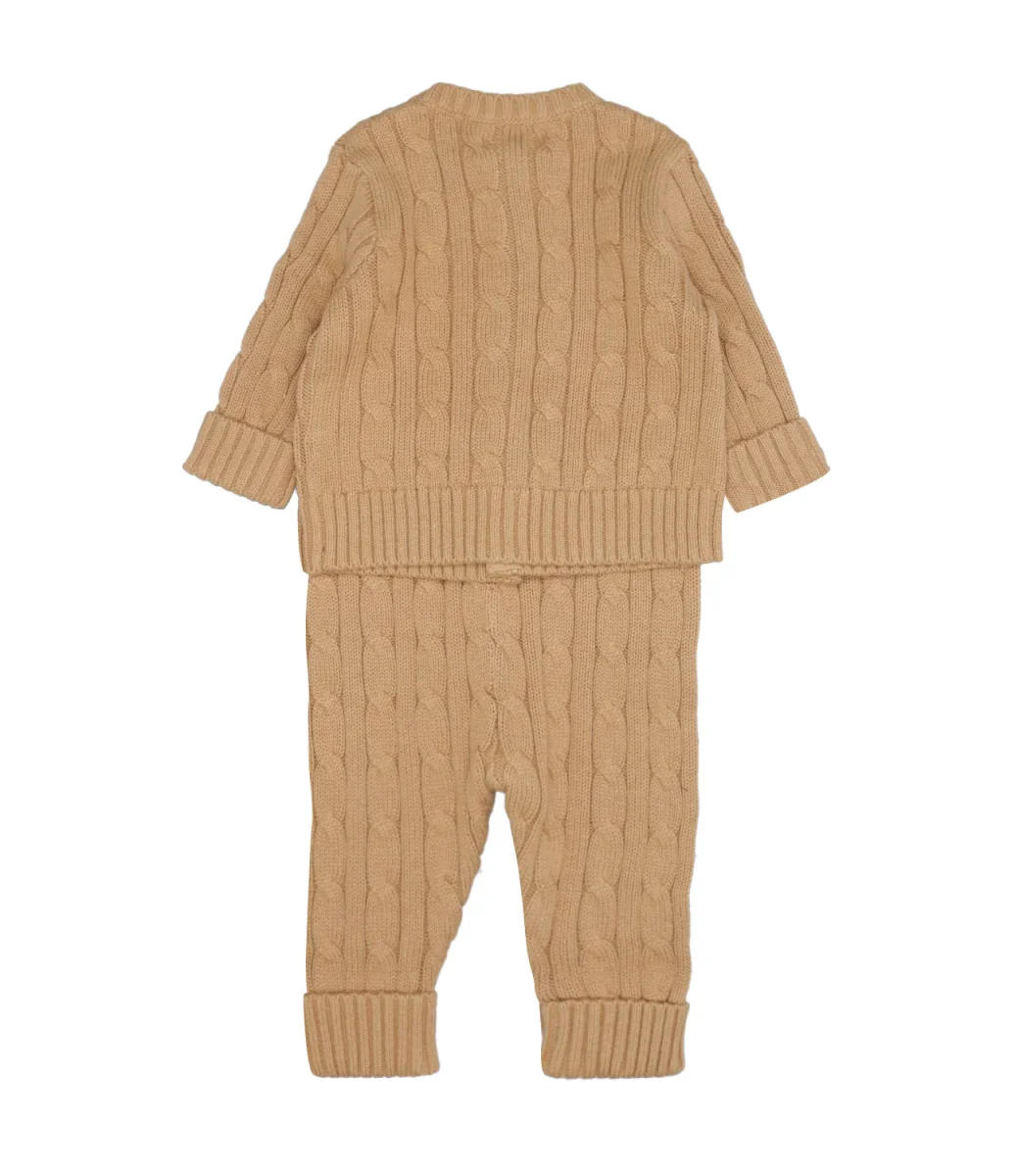 Set cardigan e pantalone Ralph Lauren Childrenswear in cotene con lavorazione a maglia con motivo a trecce all over. Struttura classica con bottoni sul davanti , profili a coste inglesi e logo sul petto. Pantalone comodo in tinta e struttura combinata.