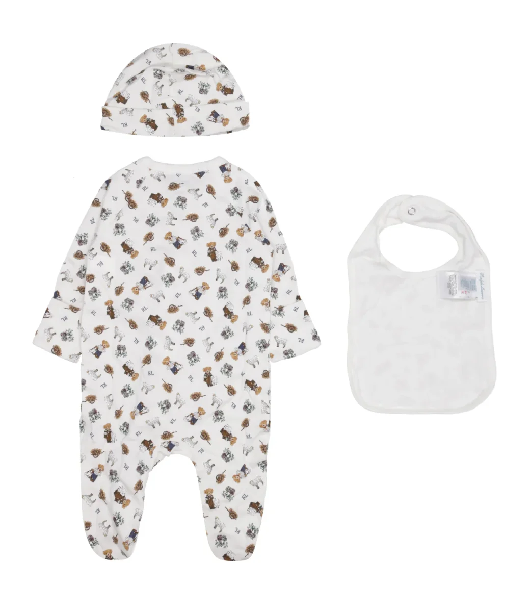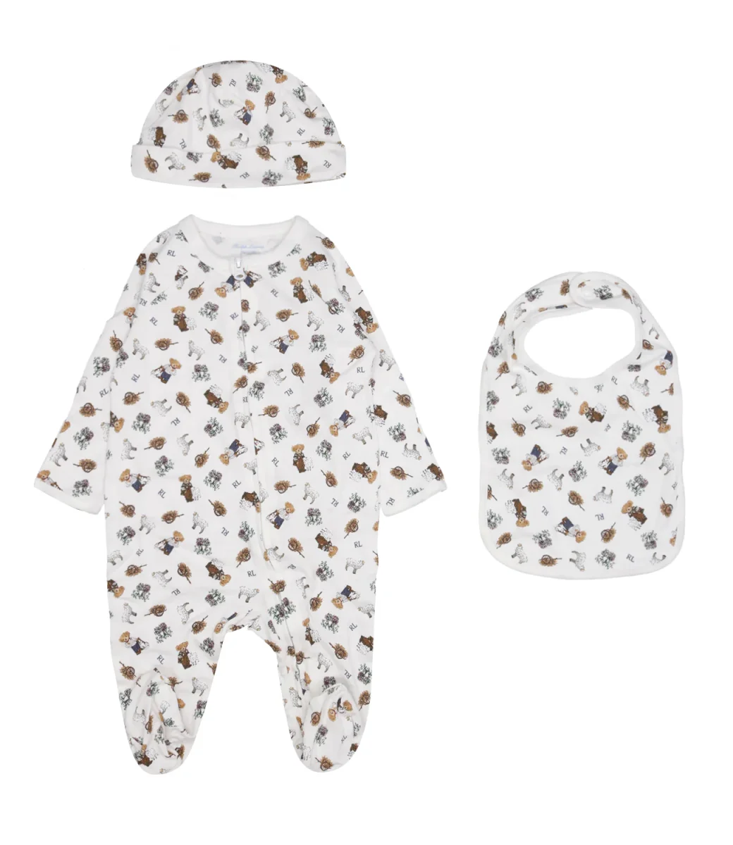 Set Nascita Ralph Lauren Childrenswear in cotone con motivo Polo Bear all-over, composto da tutina con piedini, cappello e bavaglino proposti in una unica confezione. – Scegliendo i nostri prodotti in cotone, si supporta il nostro impegno a favore dell’iniziativa Better Cotton™, a tutela dei coltivatori del settore e della protezione ambientale.