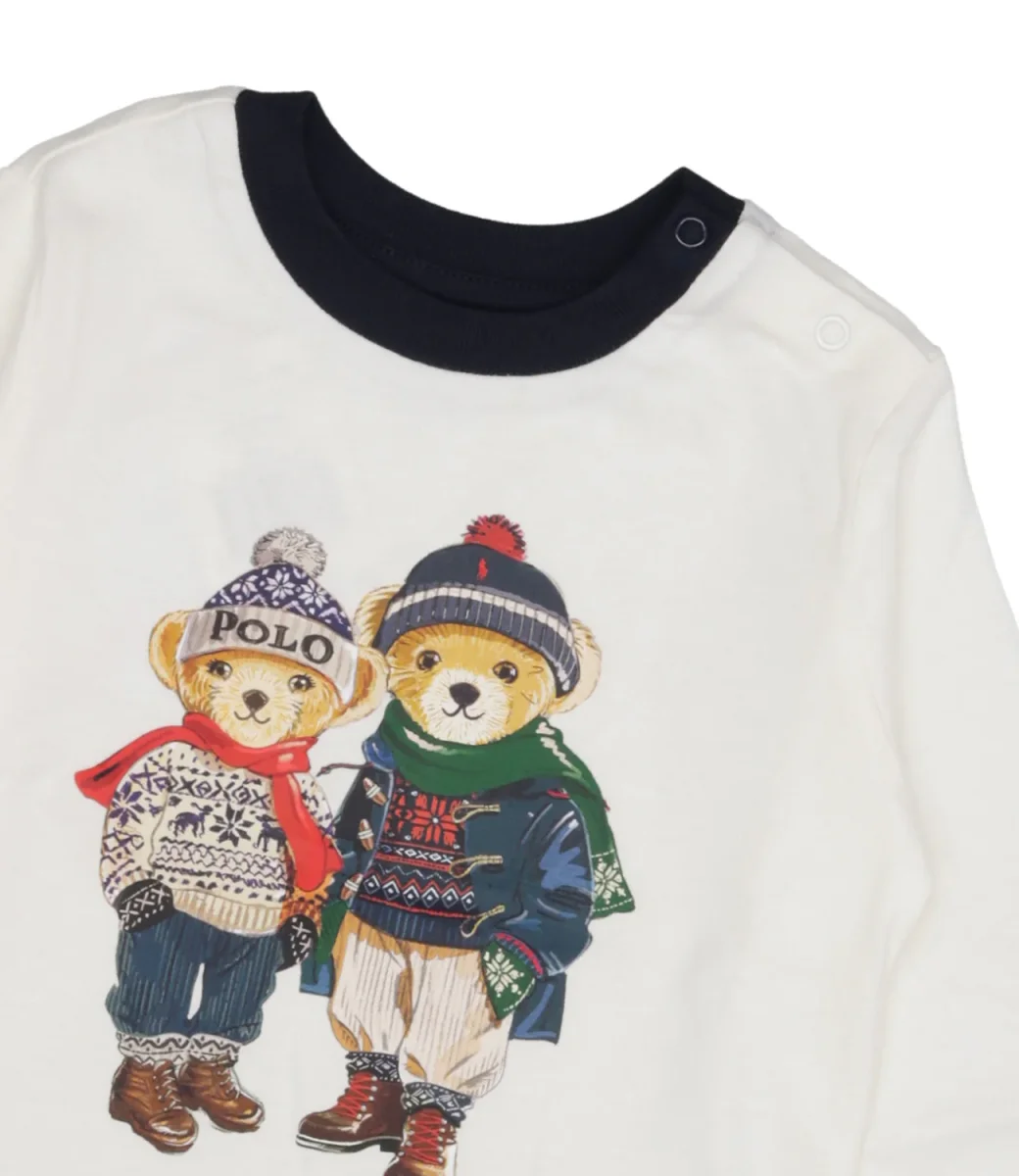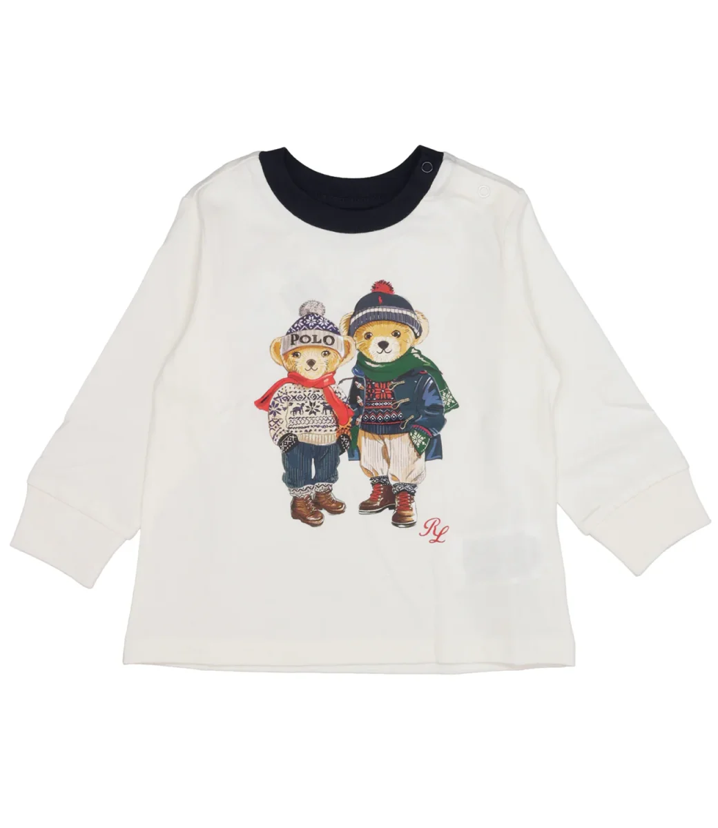 T-Shirt Ralph Lauren Childrenswear in jersey di cotone, esclusivo Polo Bears stampati sul torace, girocollo in tono a contrasto, maniche lunghe con polsino a costine, fondo con orlo dritto, chiusura con bottoncini automatici sulla spalla sinistra.