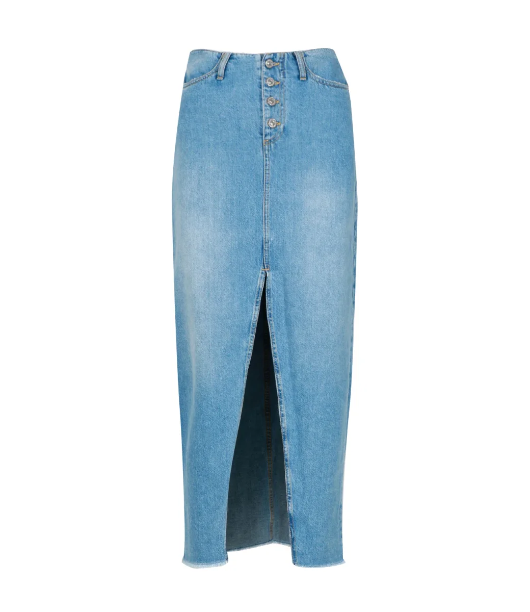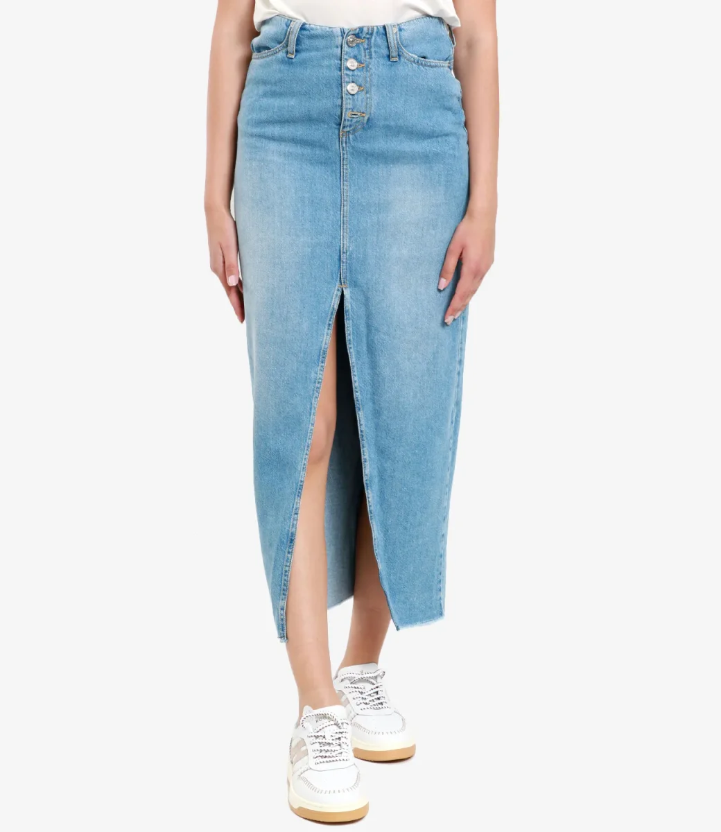 Dettagli:– Denim – Vita alta– Chiusura con bottoni– Spacco frontale– Tasche