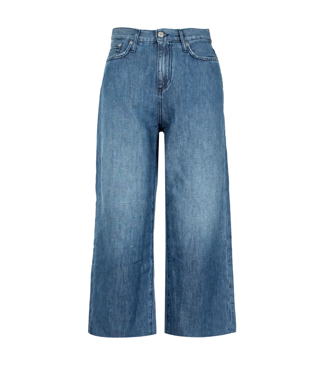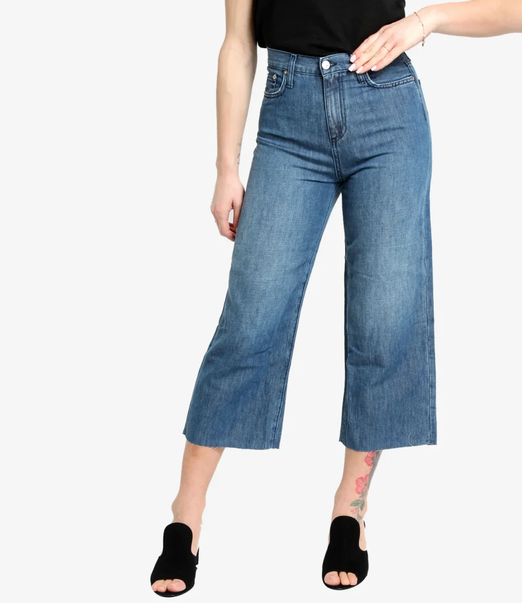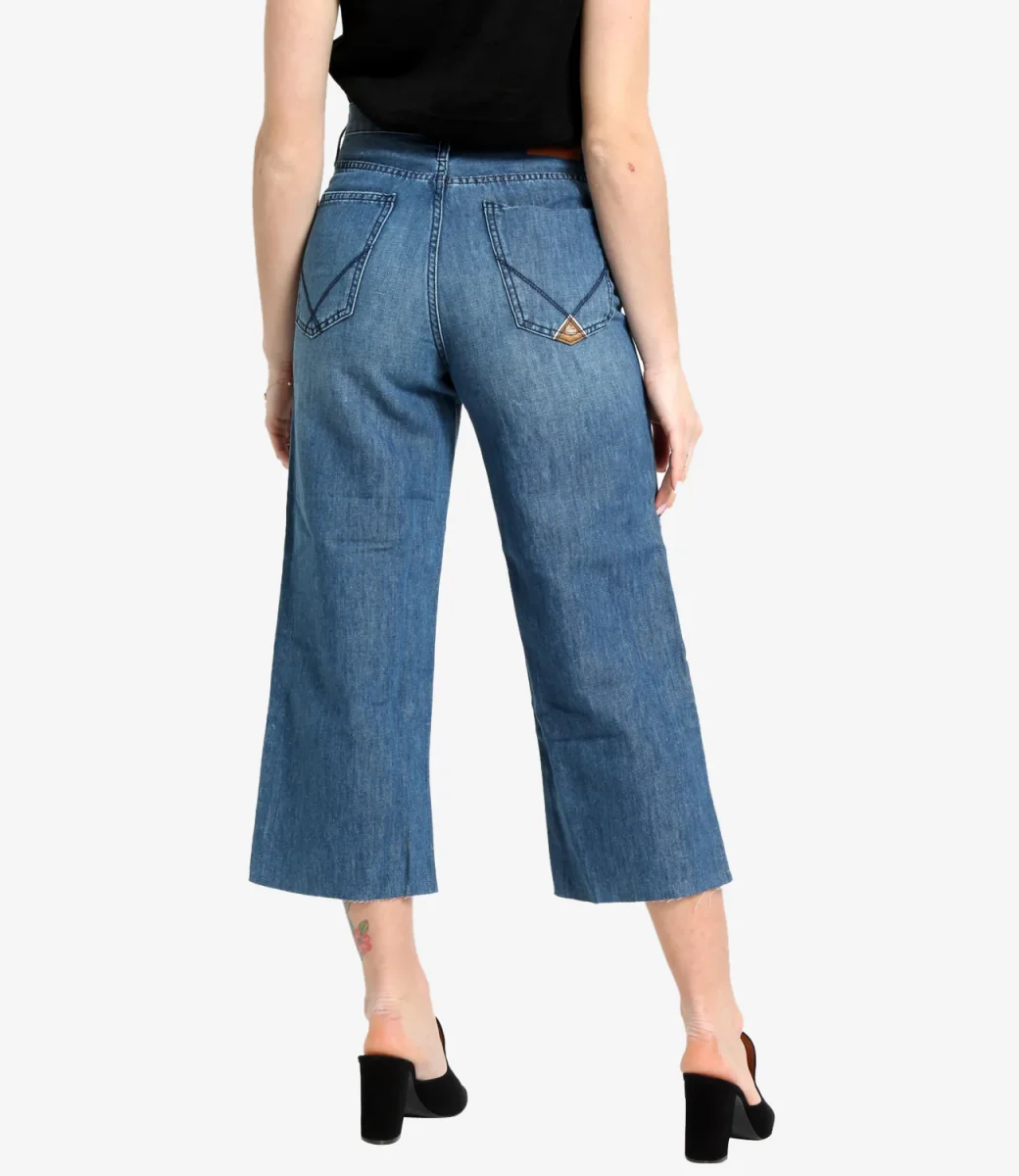Jeans Roy Roger’s Cropped in denim medio, vita alta con passanti e logo Roy Roger’s sul retro, con due tasche sul fronte e due tasche sul retro con label Roy Roger’s applicato,gamba ampia 3/4, con fondo a taglio vivo. Culotte fit.