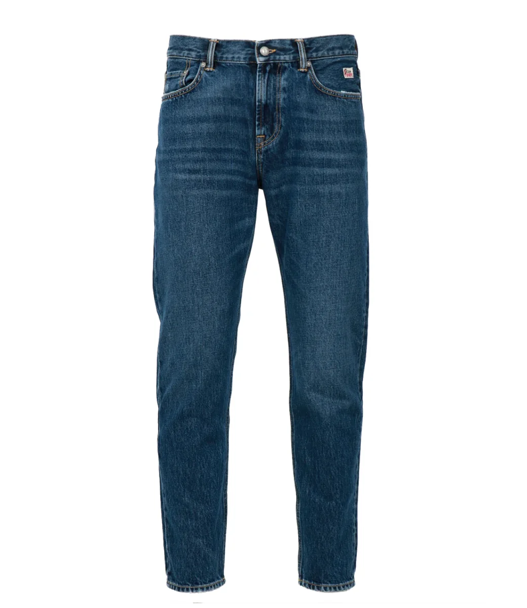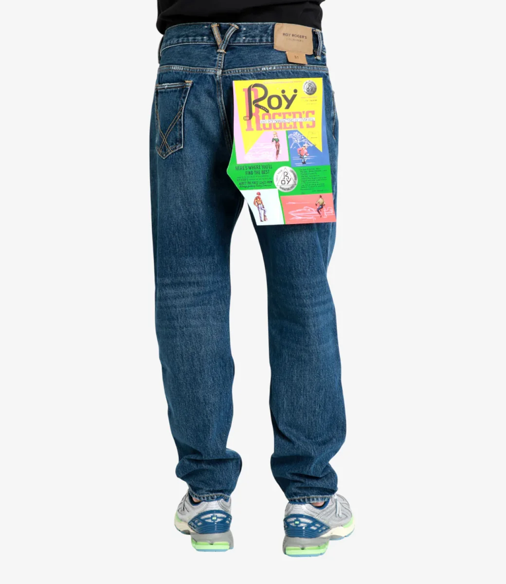 Jeans Roy Roger’s Dapper in denim used con lavaggio medio, modello con vita media e passanti, salpa posteriore stampata, chiusura con bottone logato e zip. Ttasche con label Roy Roger’s. Carrot fit.