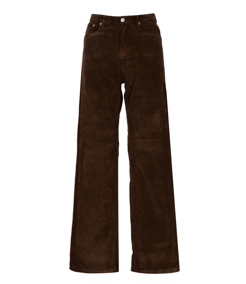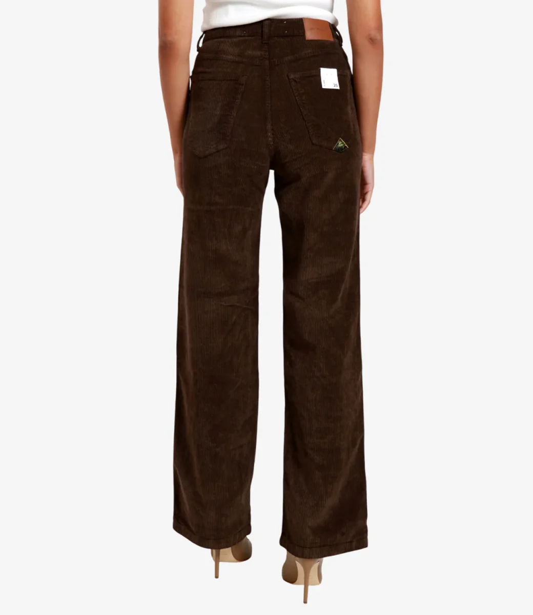 Pantalone Roy Roger’s Marta in velluto a coste tinta unita: vita media con passanti e salpa posteriore, chiusura con bottone logato e zip, tasche davanti e dietro con label Roy Roger’s. Silhouette flare con gamba svasata, apertura progressiva dal ginocchio al fondo. Finitura del fondo regolare