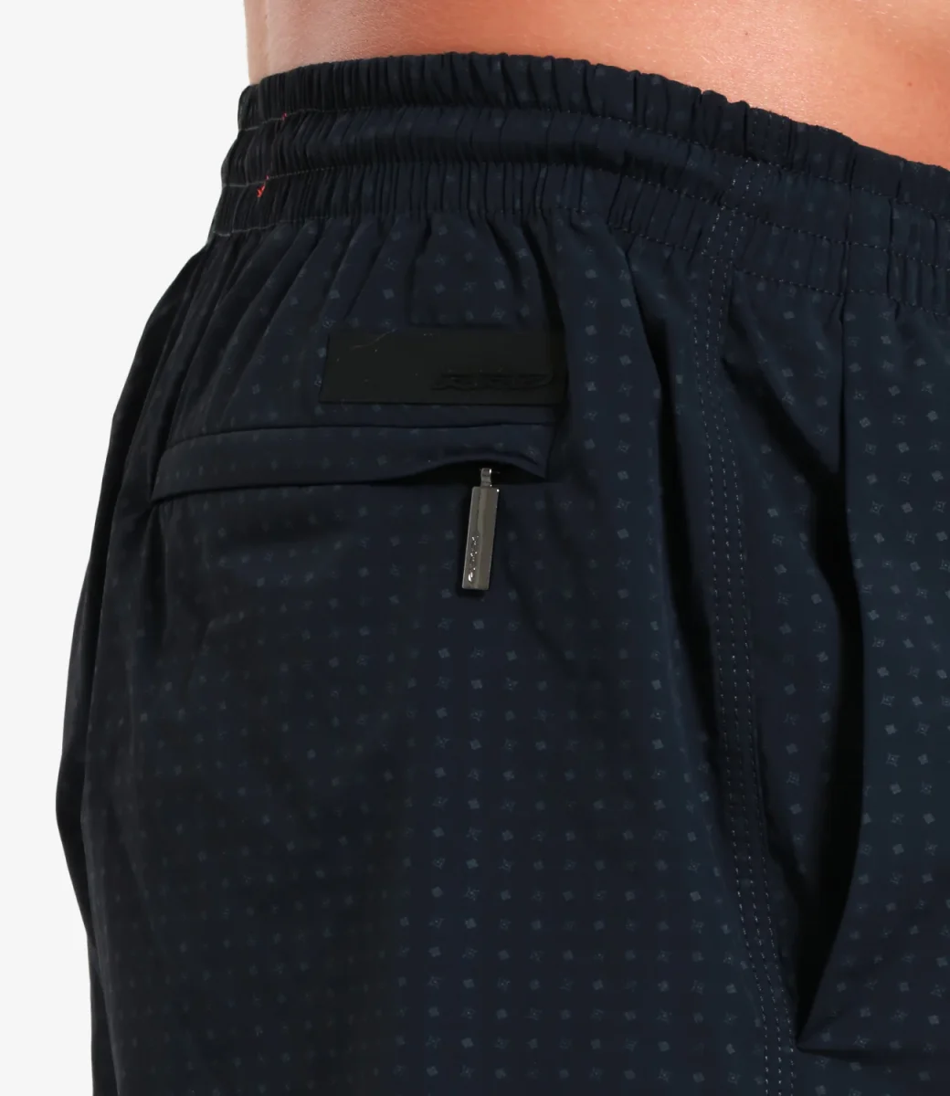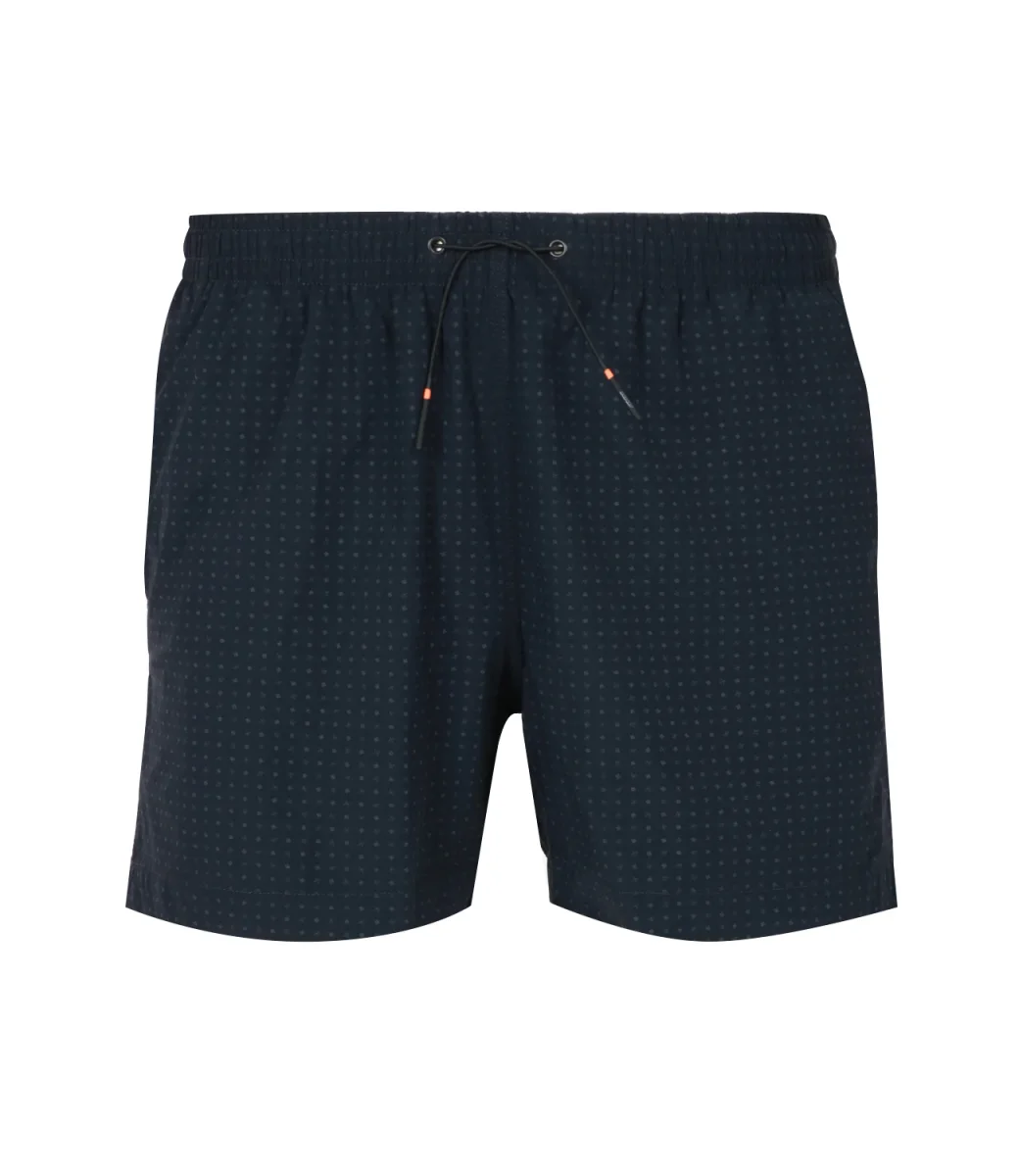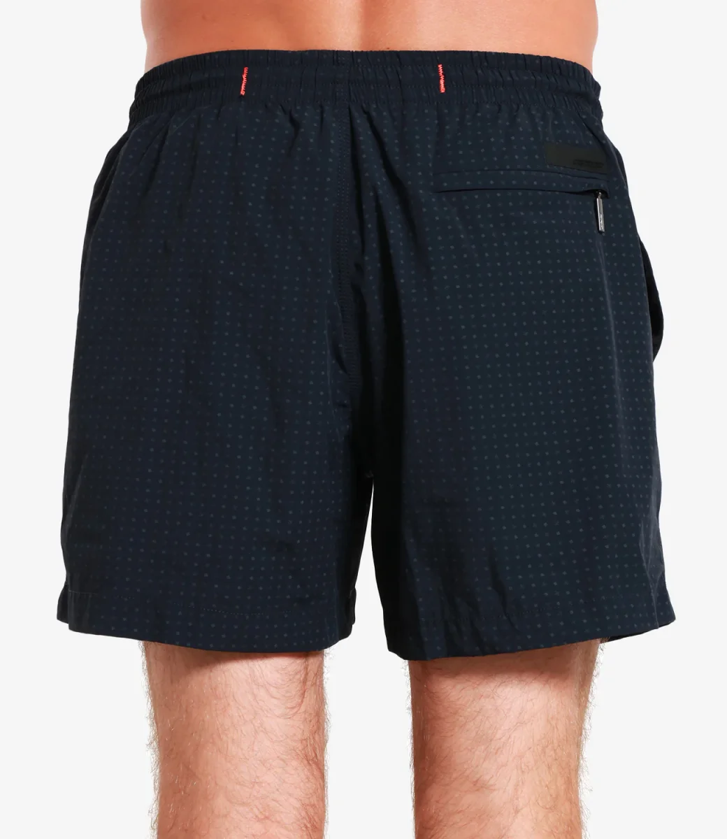Costume boxer RRD Micro Tramontana con motivi paisley e micro geometrici tono su tono stampati all over sul blu notte del tessuto elasticizzato leggero e ad asciugatura rapida. Il modello di media lunghezza è regolato in vita da un cordoncino con terminali gommati e puntini arancione fluo, con tasche laterali alla francese e micro spacchi laterali. Il logo nero micro-iniettato impreziosisce il taschino posteriore chiuso da una cerniera invisibile.