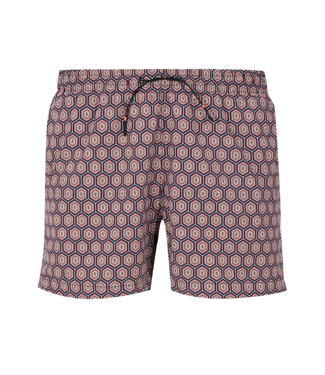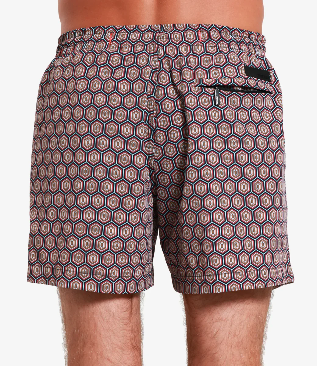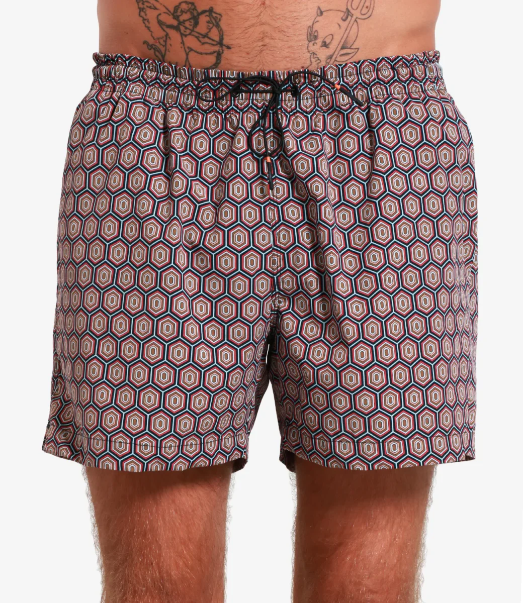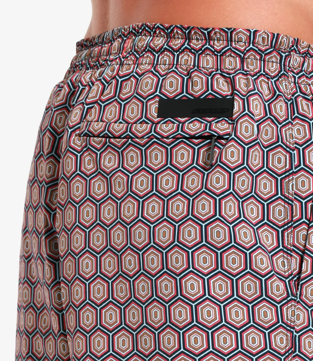 Costume boxer RRD Ucciucci Tramontana. L’esclusiva stampa all over dell’esclusivo motivo geometico Ucciucci evoca il glamour delle estati in Costa Azzurra degli anni 60, nel donare una nota distintiva a questo pantaloncino da mare di lunghezza media. Il modello è realizzato in tessuto elasticizzato leggero, traspirante e a rapida asciugatura. Presenta la regolazione in vita con coulisse a cordino dai finalini gommati e punto di arancio fluo. Tasche laterali alla francese e taschino posteriore chiuso dalla zip invisibile. Il logo a microiniezione nero completa la creazione con una nota iconica.