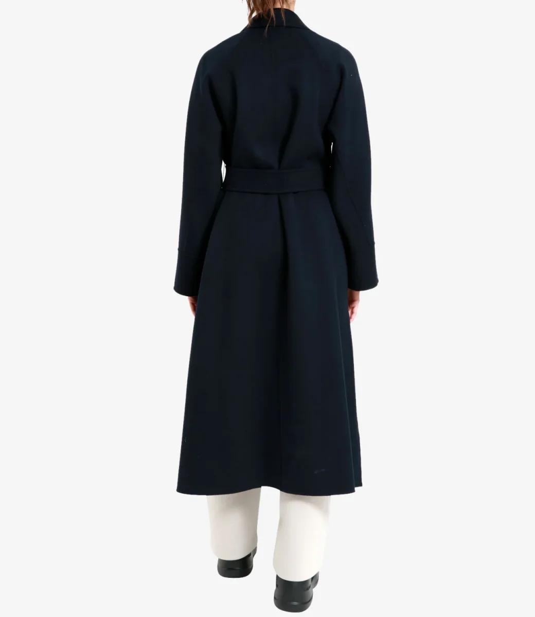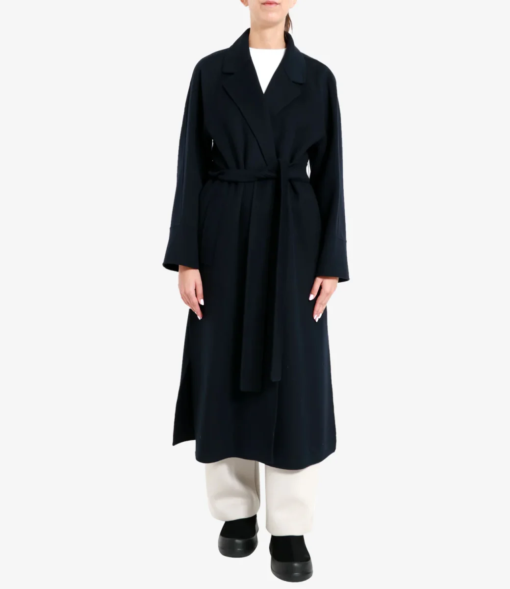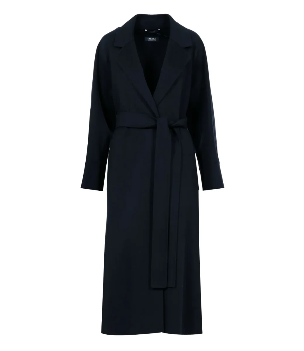 Cappotto S Max Mara Agata realizzato in doppio tessuto di pura lana, cucito a mano, collo rever, manche raglan, tasche a filetto sui fianchi, con cintura abbinata in tessuto che ne avidenzia il punto vita, profondi spacchi laterali, fondo dritto. Modello midi a vestaglia dalla vestibilità avvolgente.