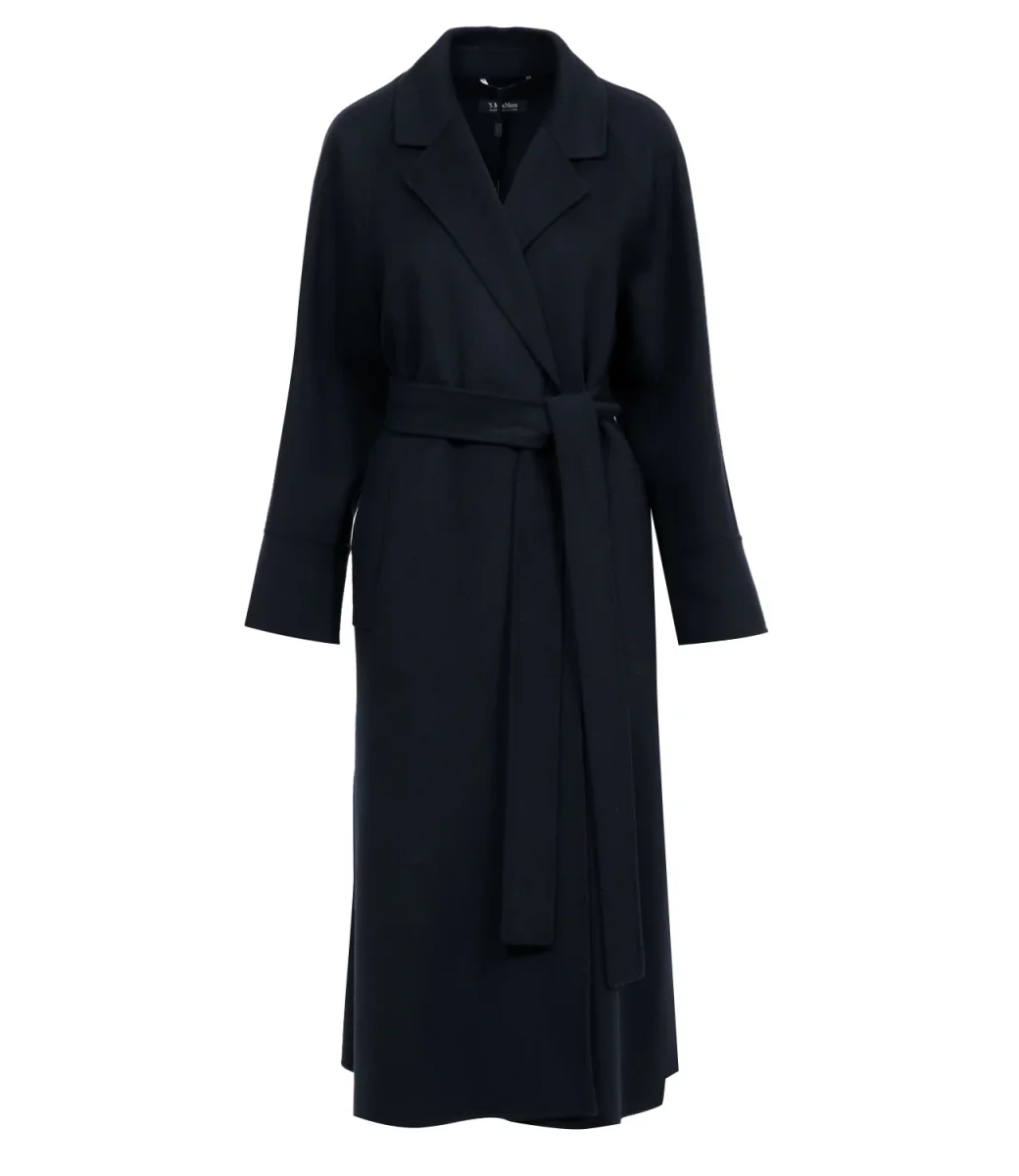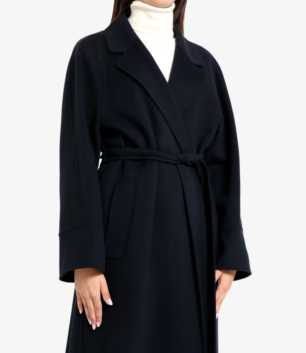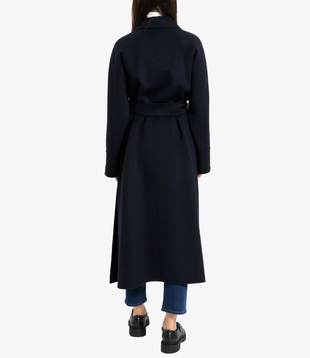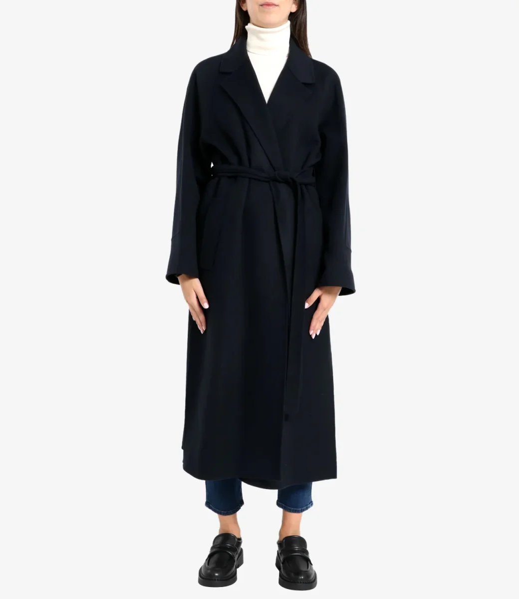 Cappotto S Max Mara Poldo modello lungo in pregiato doppio drap di pura lana cucito a mano, caratterizzato da una silhouette a vestaglia con collo a rever ampio, maniche a giro e tasche inserite nei fianchi. Modello sfoderato, rifinito con piccoli spacchi al fondo manica e spacco centrale sul retro. La chiusura con cintura abbinata permette di evidenziare la silhouette.