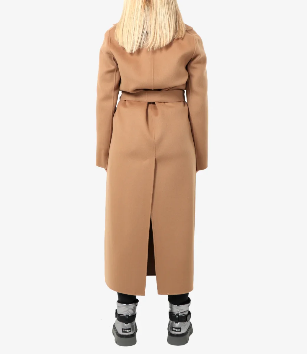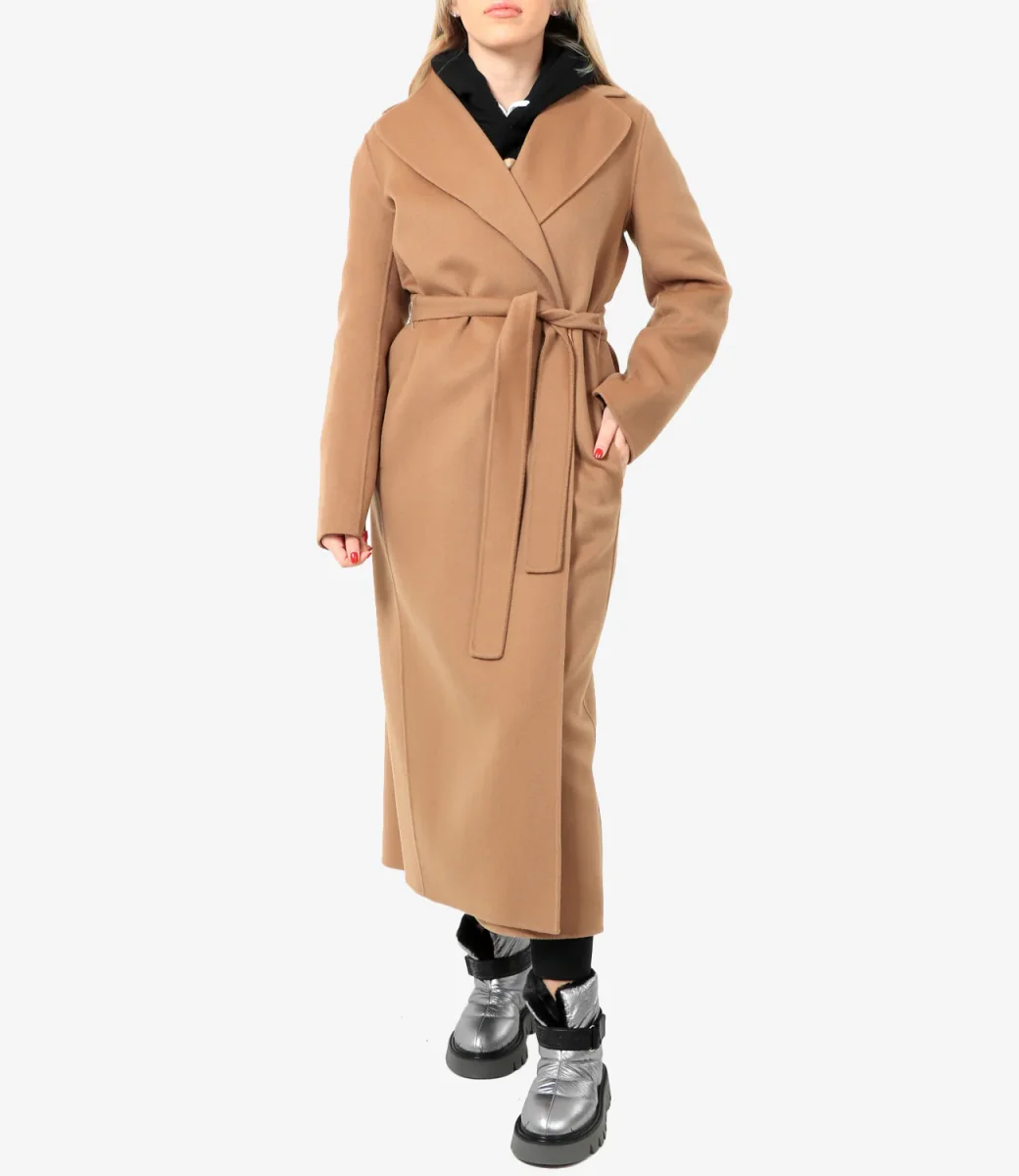 Cappotto S Max Mara Poldo modello lungo in pregiato doppio drap di pura lana cucito a mano, caratterizzato da una silhouette a vestaglia con collo a rever ampio, maniche a giro e tasche inserite nei fianchi. Modello sfoderato, rifinito con piccoli spacchi al fondo manica e spacco centrale sul retro. La chiusura con cintura abbinata permette di evidenziare la silhouette.