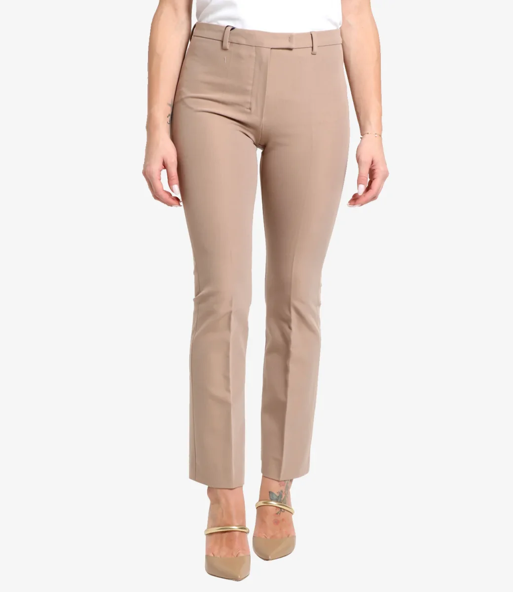 Pantaloni in doppio tessuto di cotone e viscosa stretch, con piega stirata sulla gamba e linea leggermente svasata al fondo. Chiusura con lampo coperta e piccolo gancio.