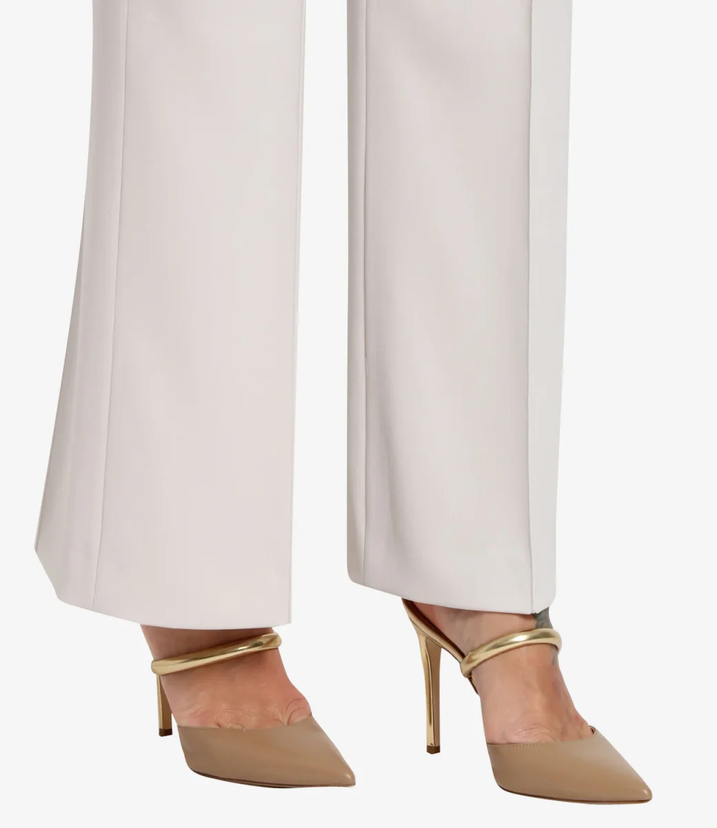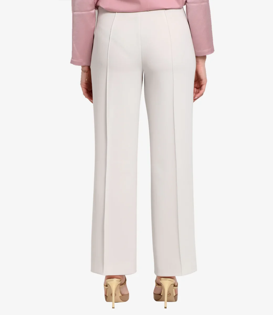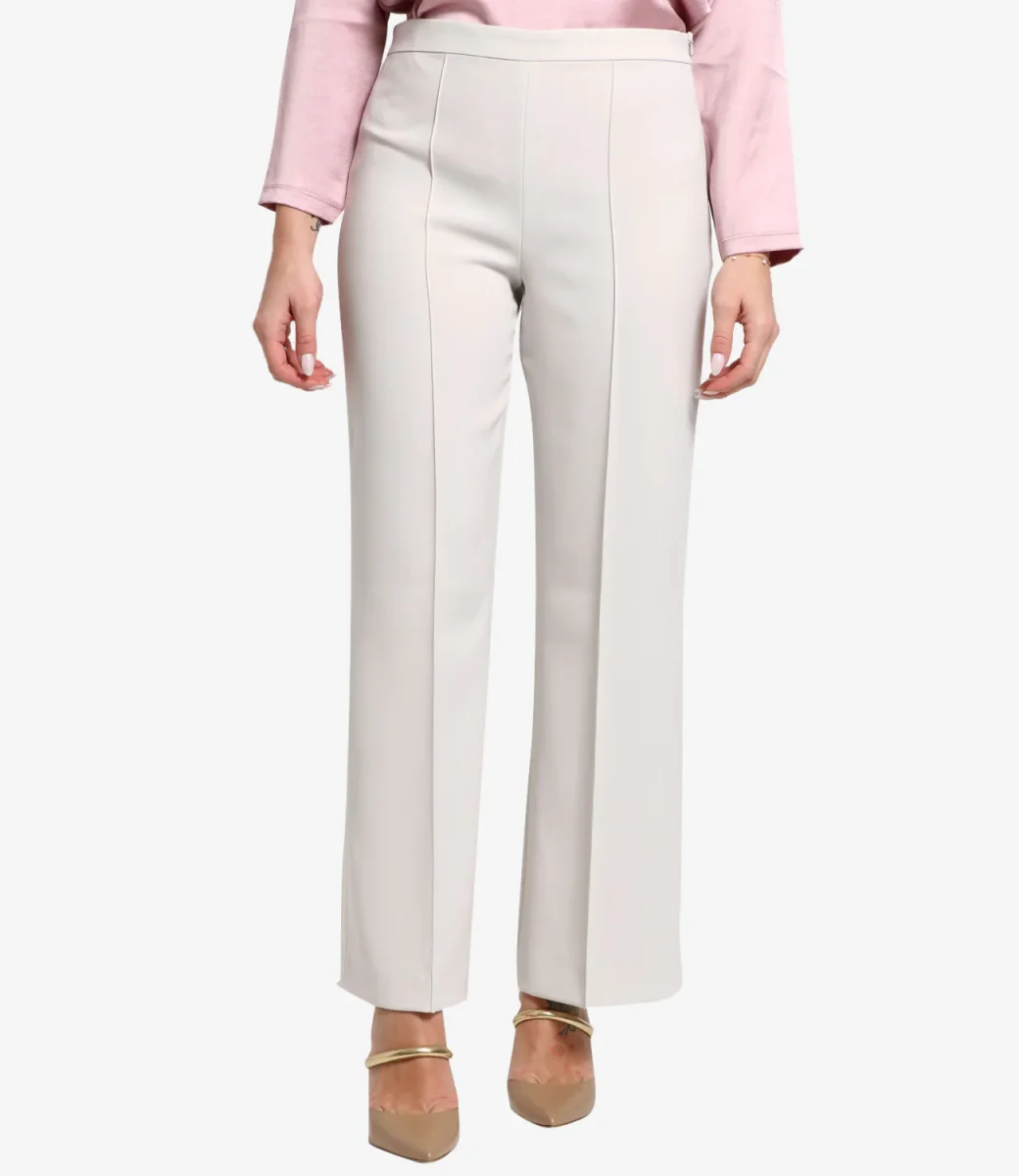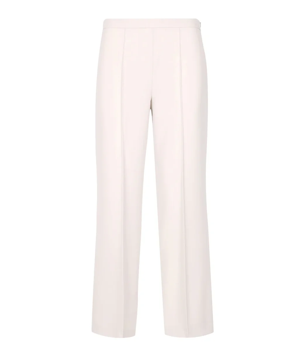 Pantalone in cady con piega stirata sulla gamba. Chiusura con lampo invisibile sul fianco.
