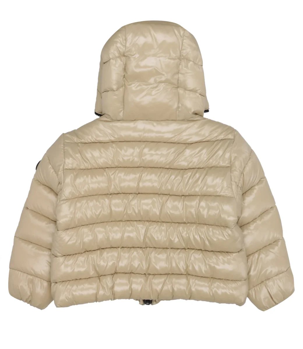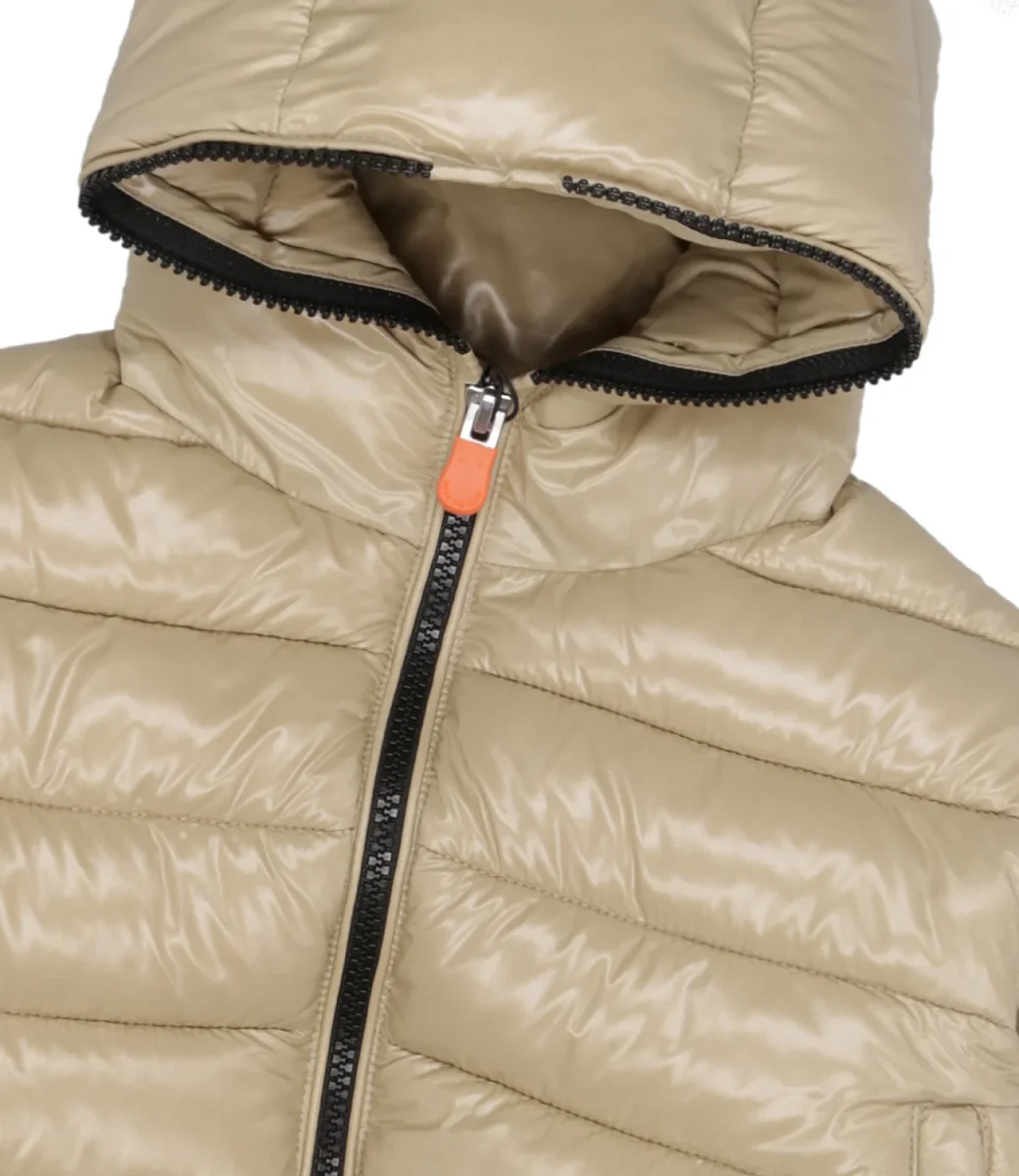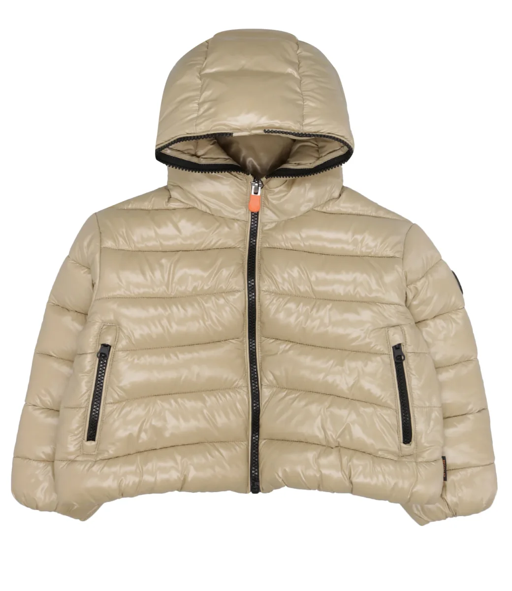 Giubbotto Save The Duck Kids Imara, in tessuto tecnico, linea trapuntata con imbottitura calda e priva di materiali di origine animale, con cappuccio, tasche laterali con zip, finiture in Lycra su polsi e fondo, chiusura con zip integrale al cappuccio, tirazip color arancione, logo in gomma applicato sulla manica sinistra, modello corto, la vestibilità ampia.