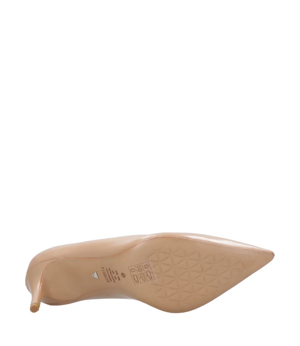 Decolleté Schutz in nappa, design classico ed essenziale con linee pulite, tacco a stiletto, punta a punta, suola con logo in metallo dorato.