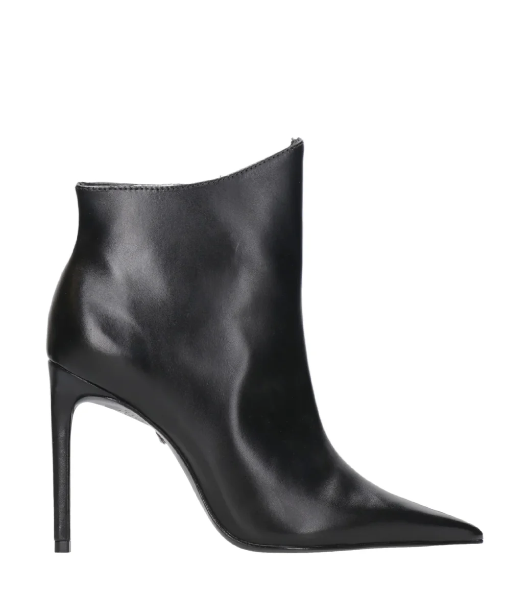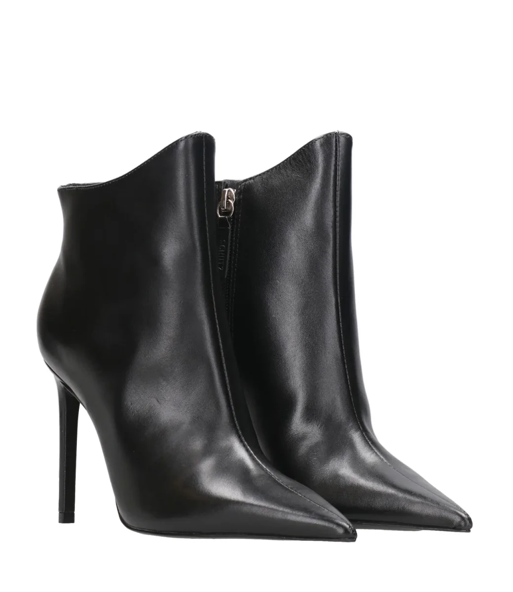 Tronchetto Schutz in nappa, linea essenziale con una punta a punta affusolata, gambale con finale superiore aasimetrico, chiusura nella parte interna con zip in metallo in tono con tirazip in pelle, tacco a stiletto in tono, suola con logo in metallo argentato.