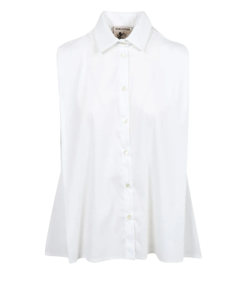 Camicia Semicouture Babs in popeline misto cotone. Colletto classico a punta, abbottonatura frontale. Modello smanicato e svasato al fondo.