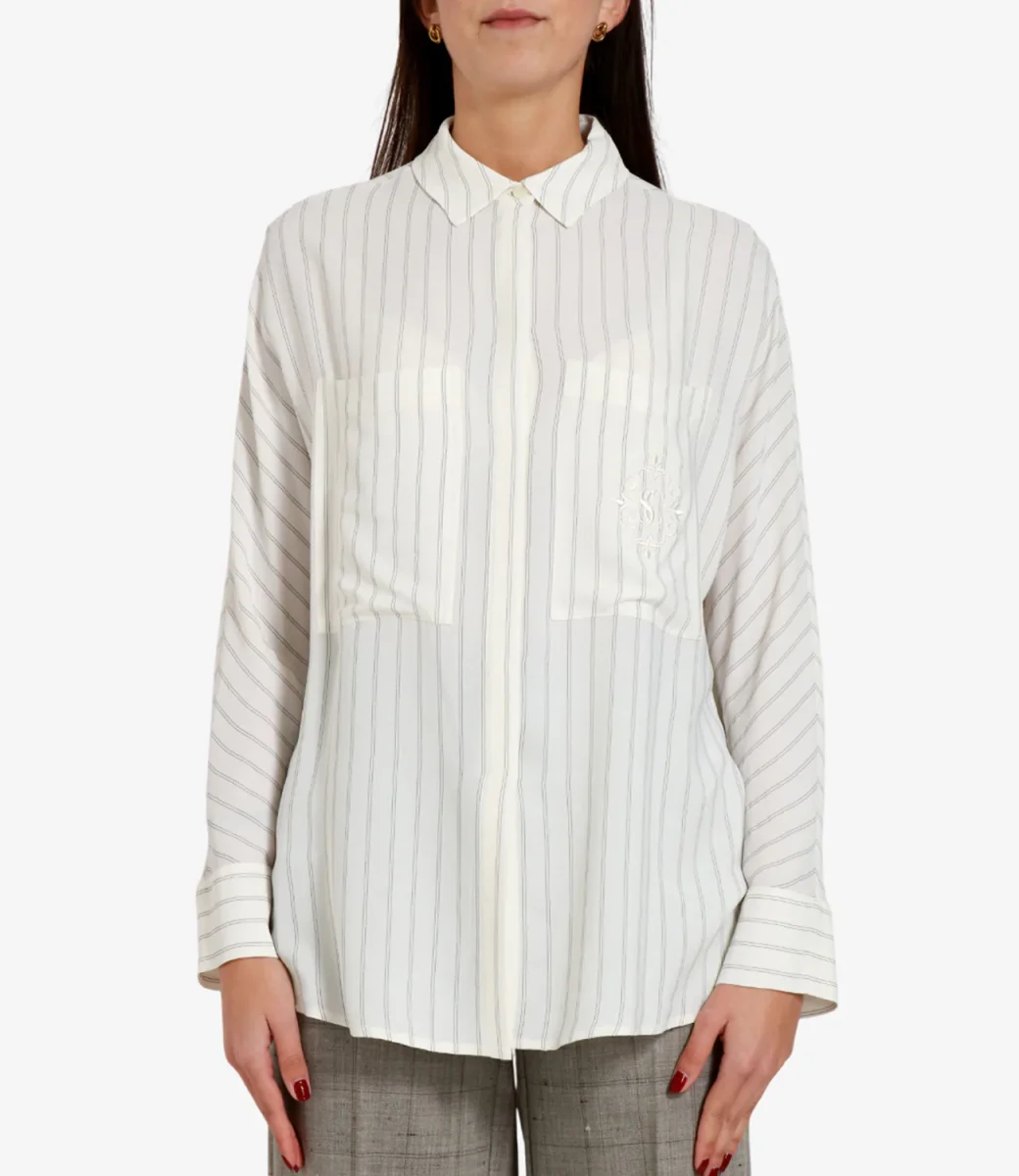 Camicia Semicouture Tiffany dal design essenziale e raffinato. Linee pulite e cromia neutra definiscono un capo contemporaneo e trasversale, facile da abbinare per look scelto in molte occasioni, per uno stile curato e discreto.