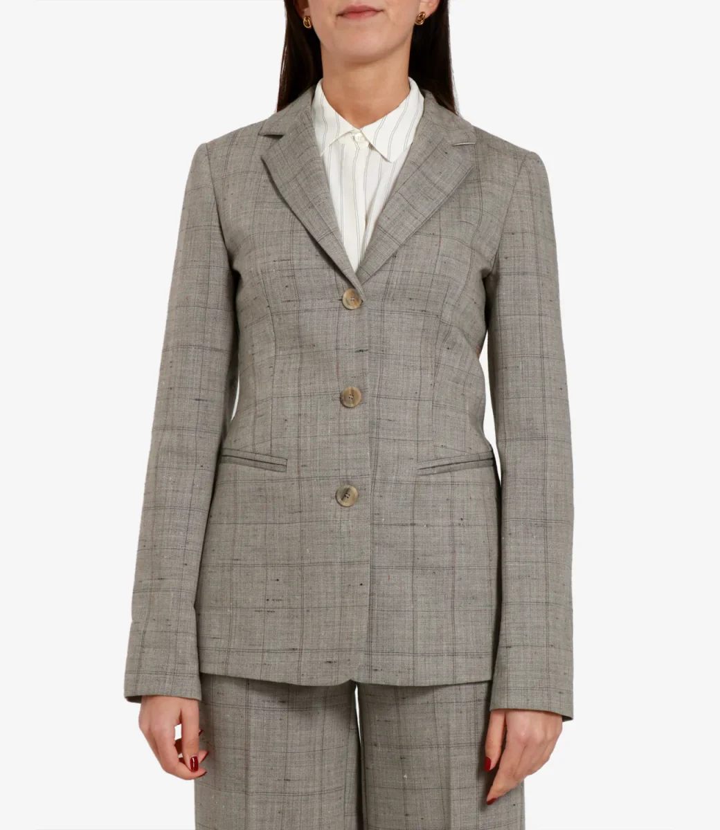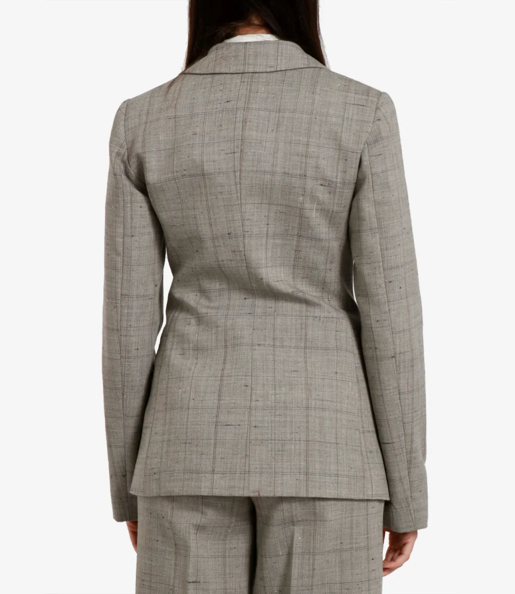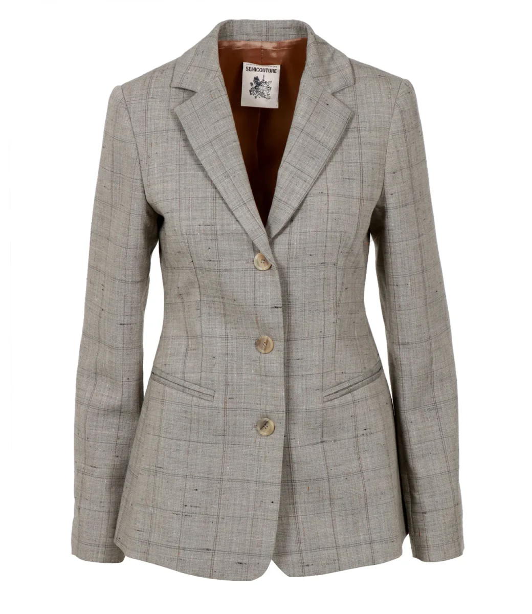 Giacca Semicouture Herminia in poly-lana a motivo finestrato. Silhouette classica con collo a revers, chiusura frontale con bottoni, tasche a filetto e fondo dritto. Vestibilità regular e lunghezza al bacino. Il capo immancabile nel guardaroba di una donna