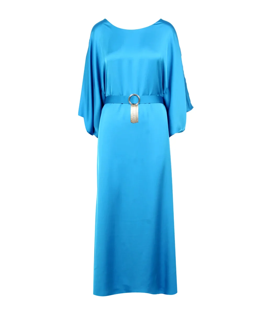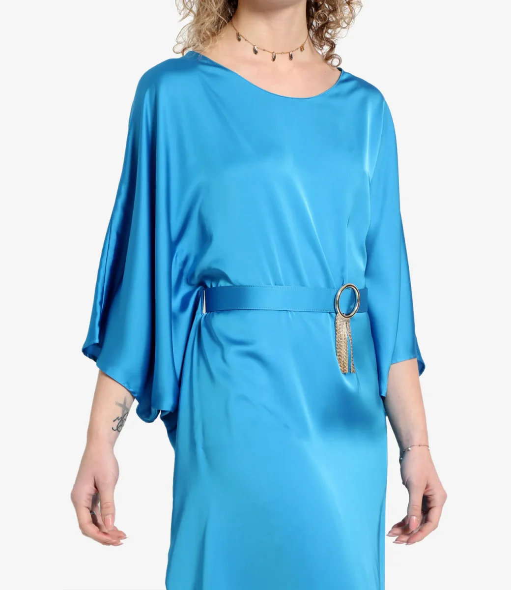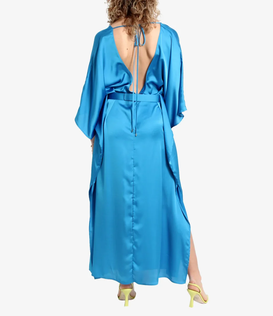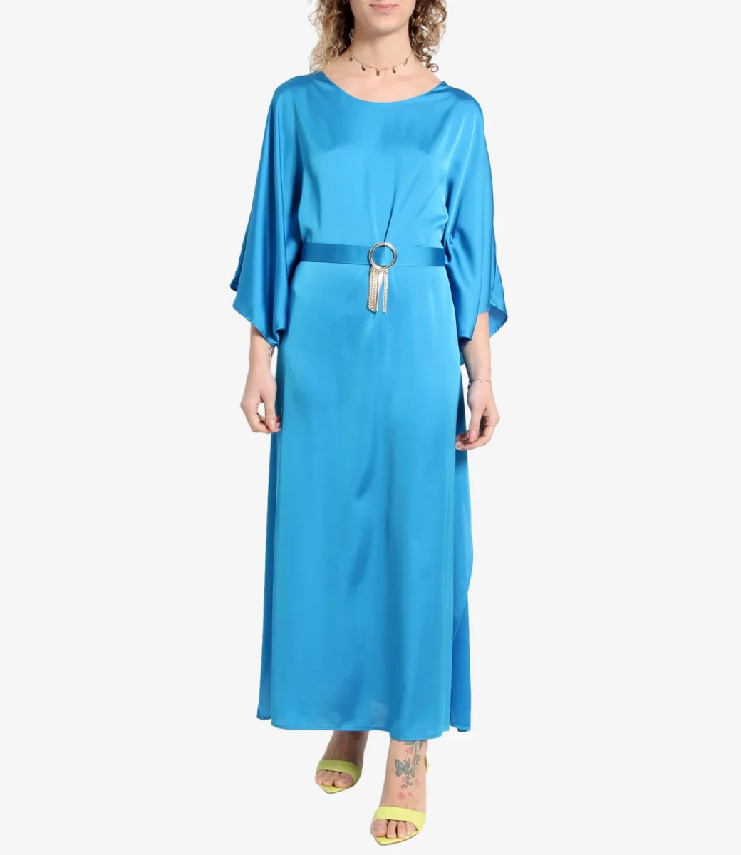 Abito Simona Corsellini in raso turchese con scollo rotondo, maniche a pipistrello asimmetriche, gonna lunga svasata con spacchi laterali. scollo posteriore e cintura in vita.