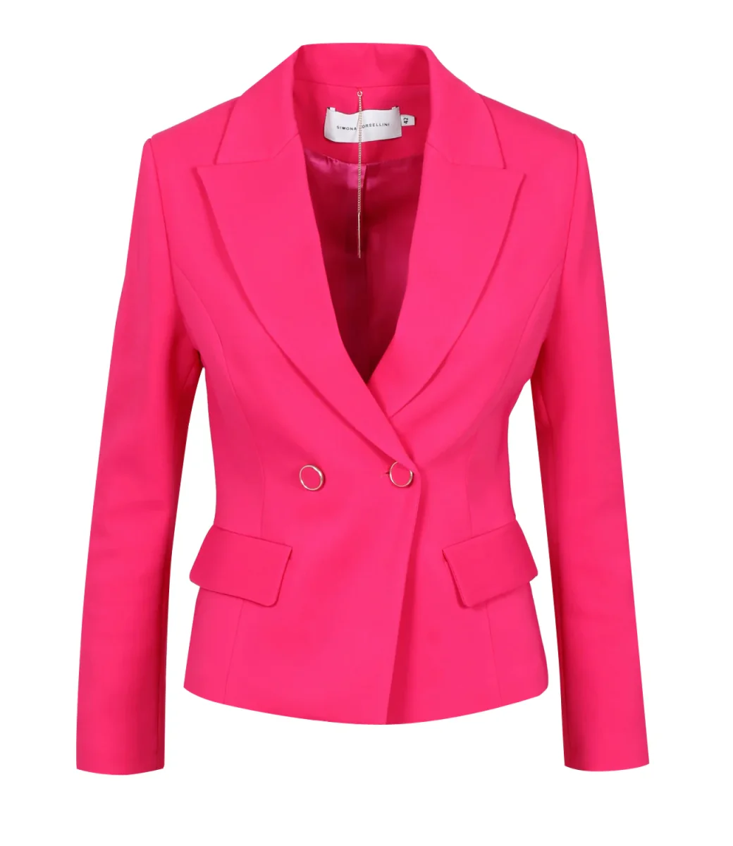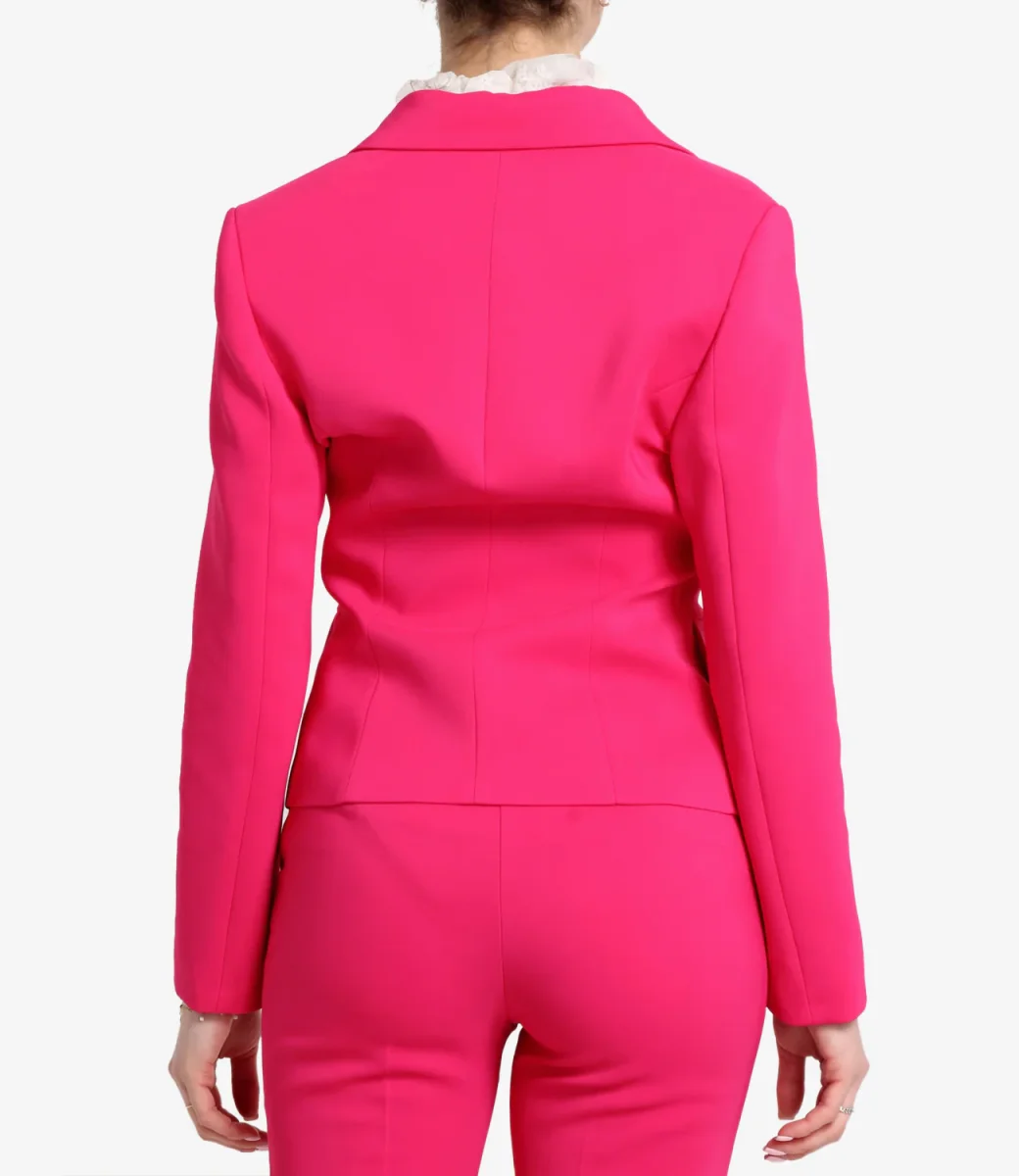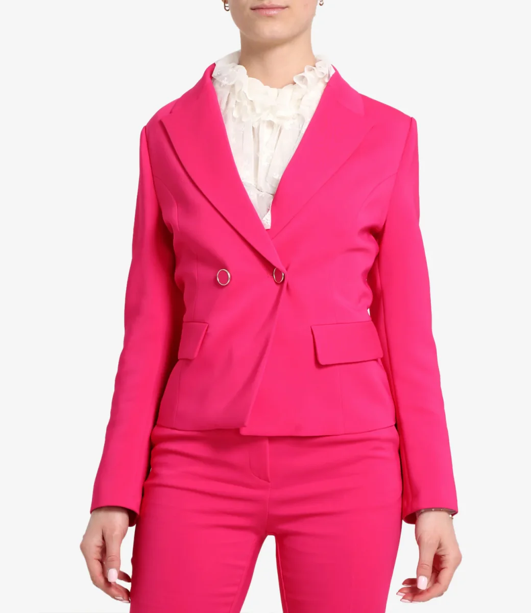 Giacca Simona Corsellini in viscosa fuxia, scollo a V con revers, abbottonatura doppiopetto con bottoni ricoperti con ghiera oro, tasche a patta applicate e maniche lunghe.