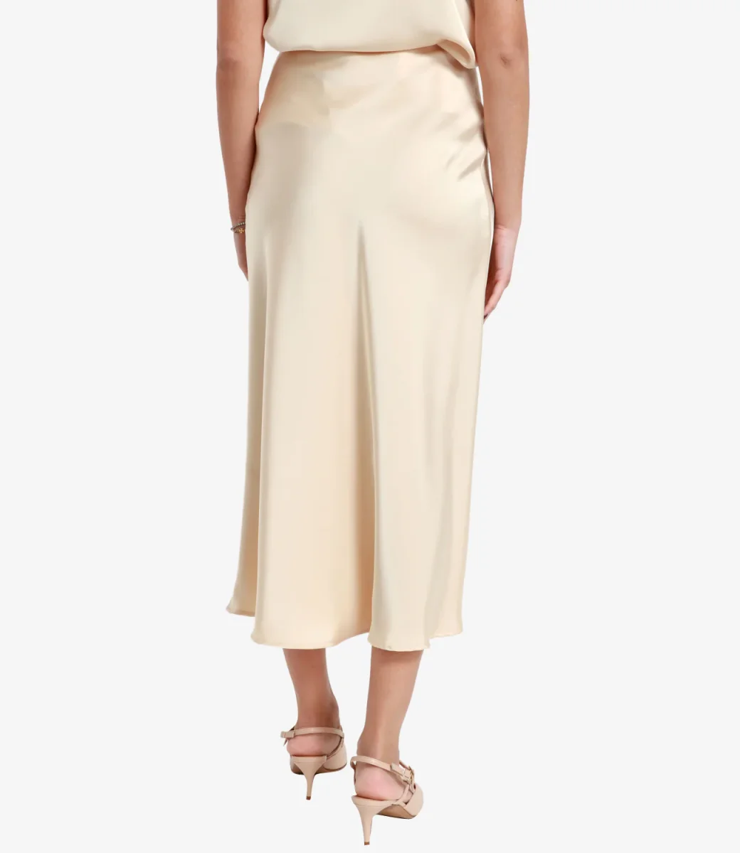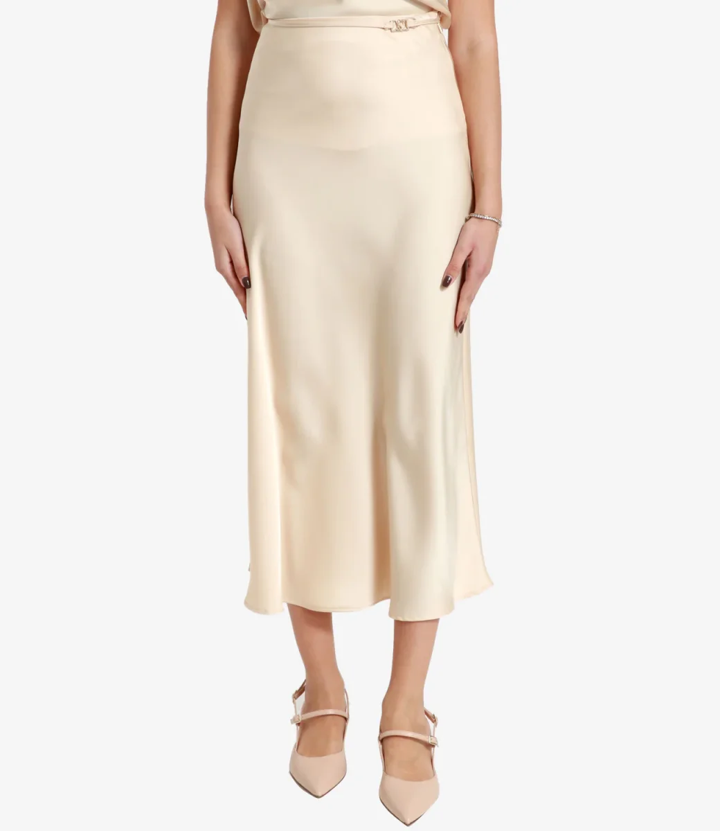 Gonna Simona Corsellini dal design liscio con logo dorato e chiusura laterale con zip a scomparsa. La modella è alta 1.75m ed indossa una 40.