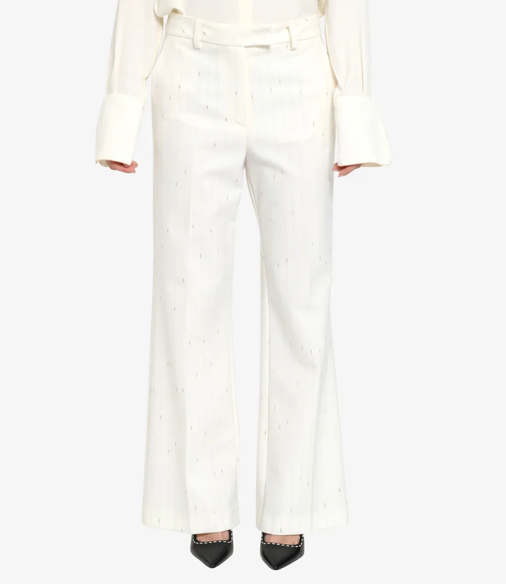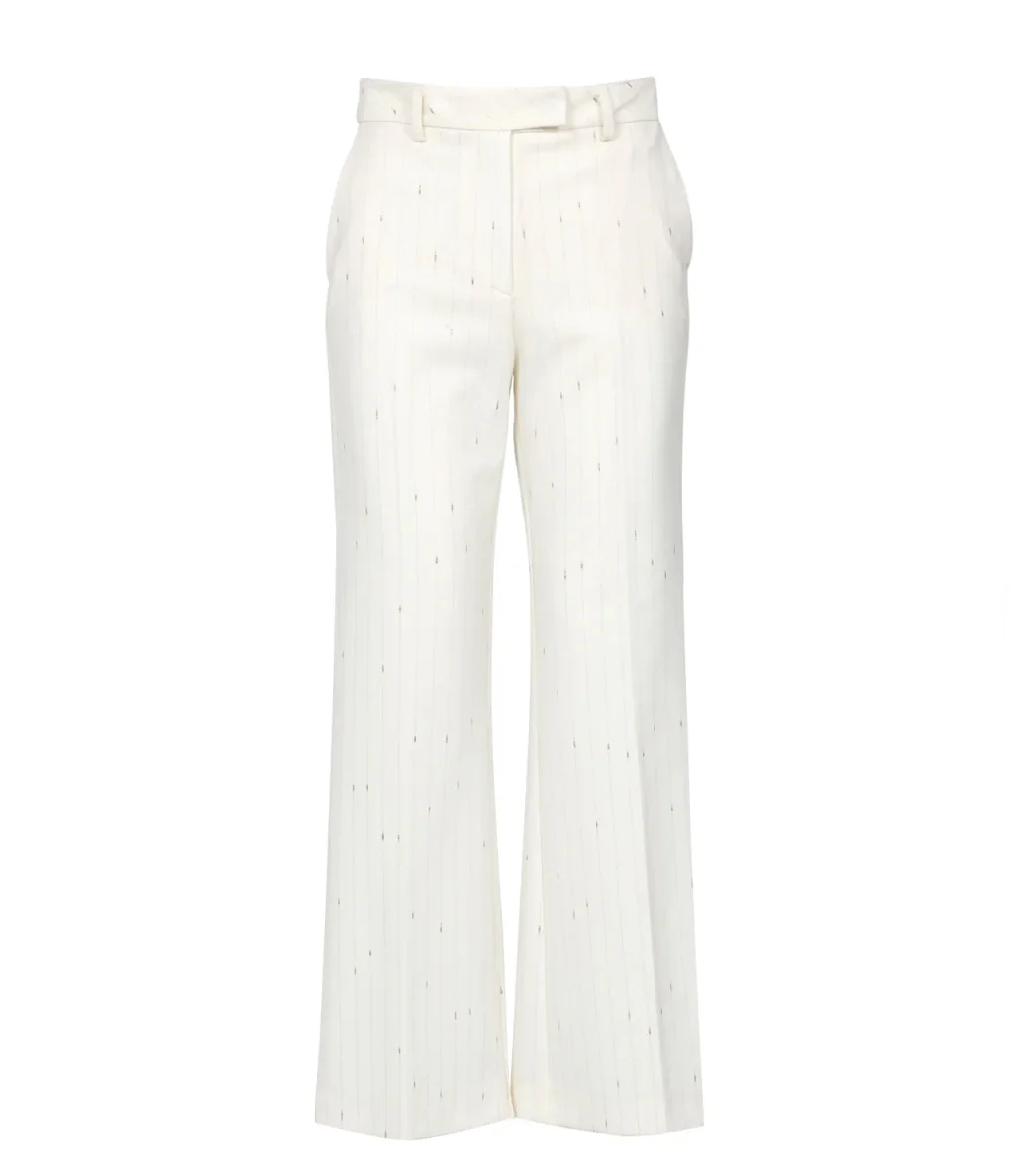 Pantalone Simona Corsellini in misto lana con motivo gessato con dettagli in lurex dorato, vita regolare con passanti, chiusura con gancio coperto zip con patta, tasche alla francese, gamba ampia con piega stirata sul davanti e sul retro,