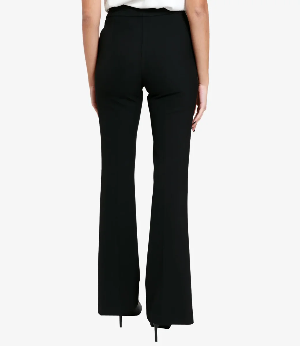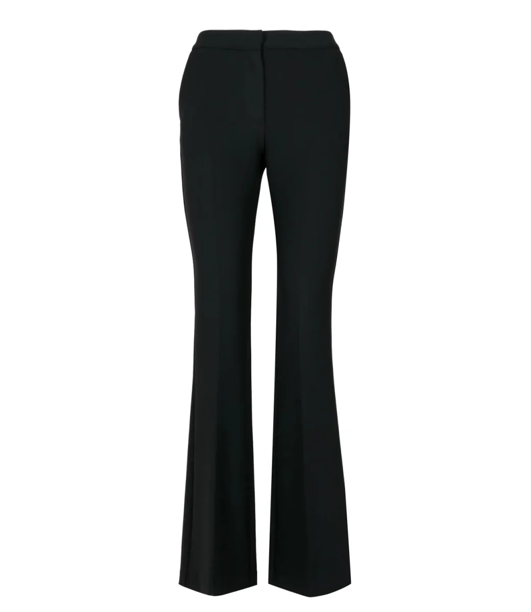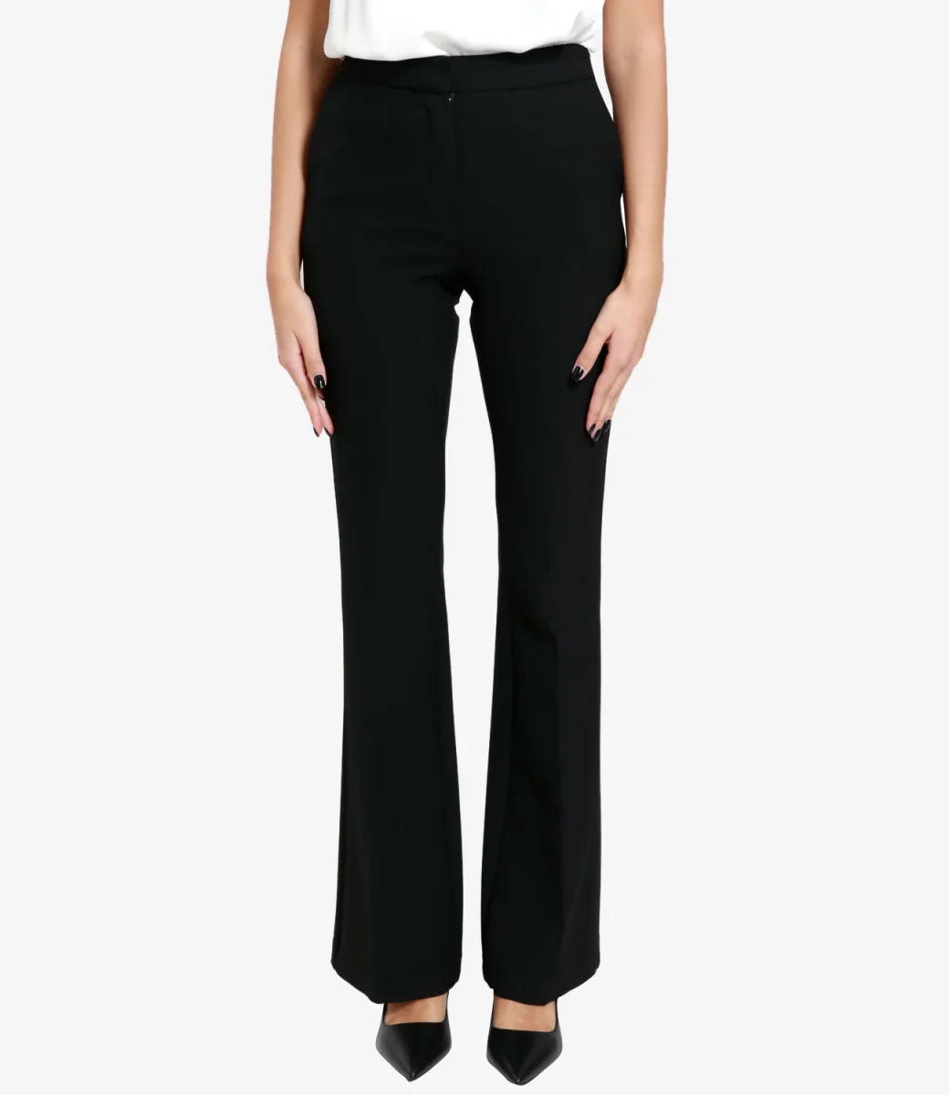 Pantalone Simona Corsellini modello flare in viscosa nero con tache a filo laterali e abbottonatura frontale.