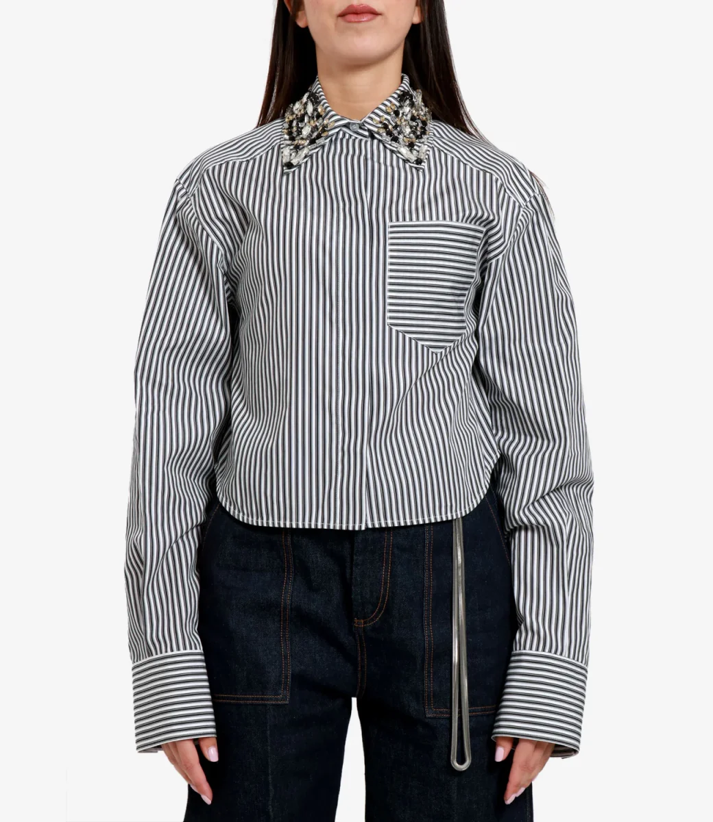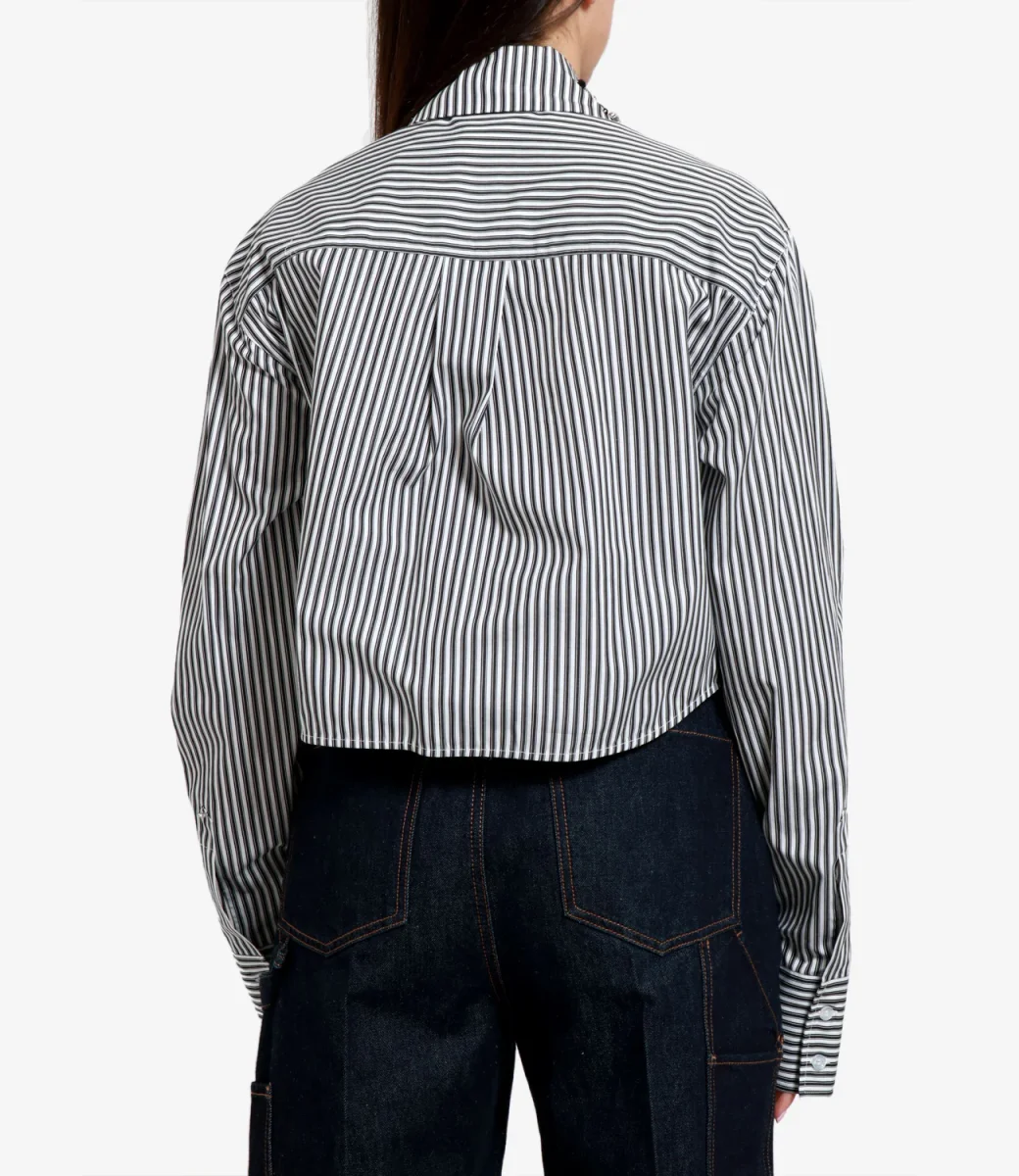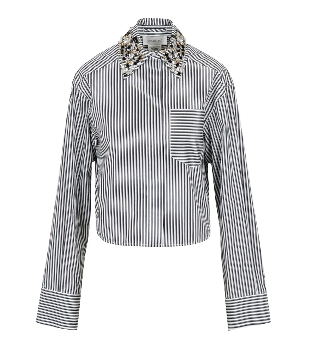 Camicia Sportmax Spxquagga in popeline di puro cotone con motivo a righe con taglio dritto e linea crop. Collo a camicia con ricamo gioiello, abbottonatura nascosta, taschino sul petto e fondo stondato.
