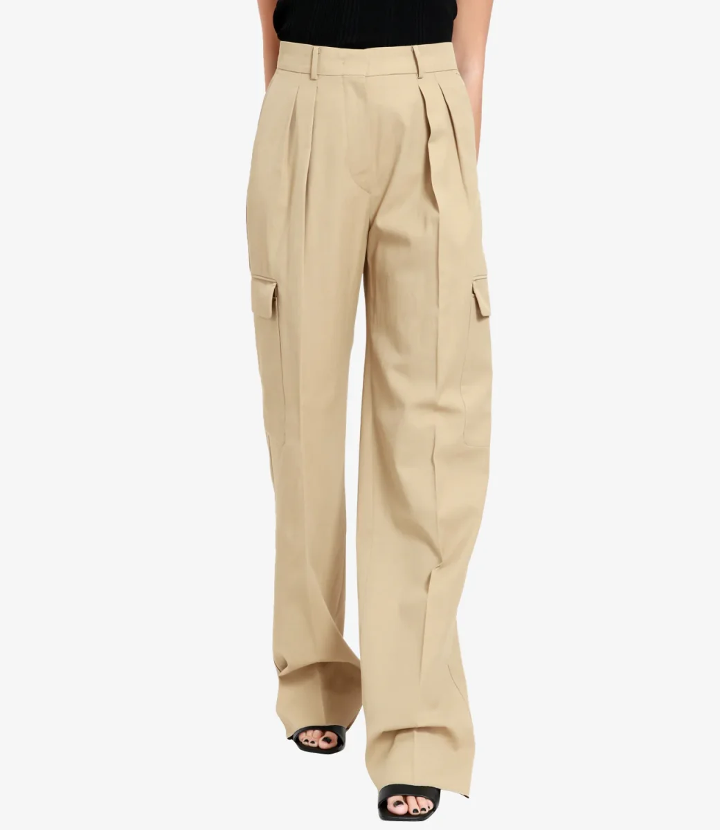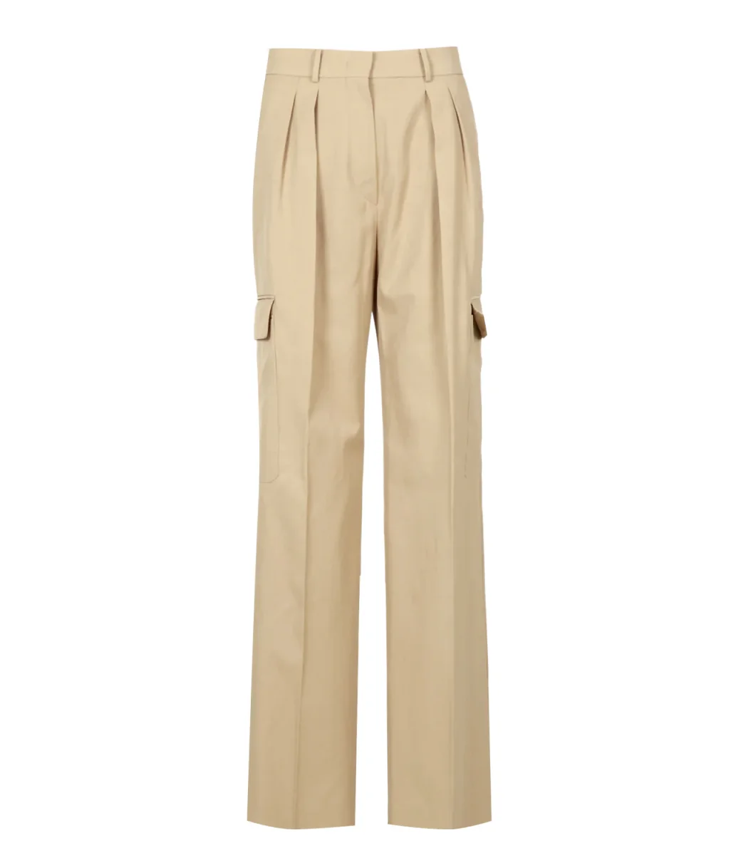 Pantalone Sportmax modello Jacopo in cotone a vita alta e pinces con chiusura con zip e bottone e tasche frontali e laterali. La modella è alta 1.75m ed indossa una 40.