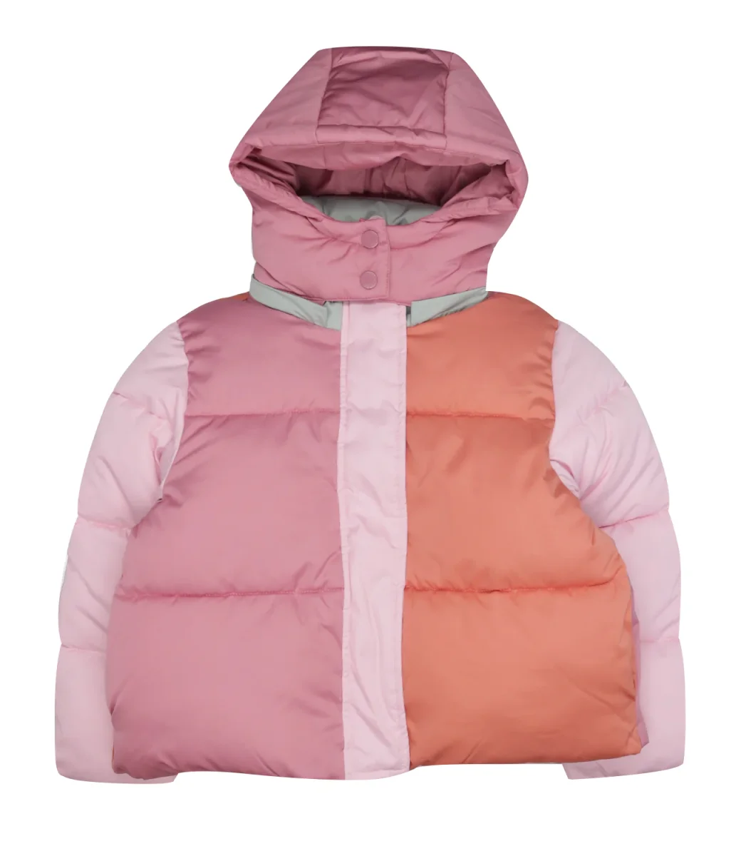 Piumino Stella McCartney Kids in tessuto tecnico ecosostenibile. Costruzione con pannelli uniformi e trapuntatura continua, superficie compatta e mano liscia. Collo con cappuccio integrato per copertura continua. Chiusura frontale a bottoni. Maniche lunghe a giro con bordo pulito. Silhouette diritta senza eccessi di volume. Finiture lineari e dettagli minimi.
