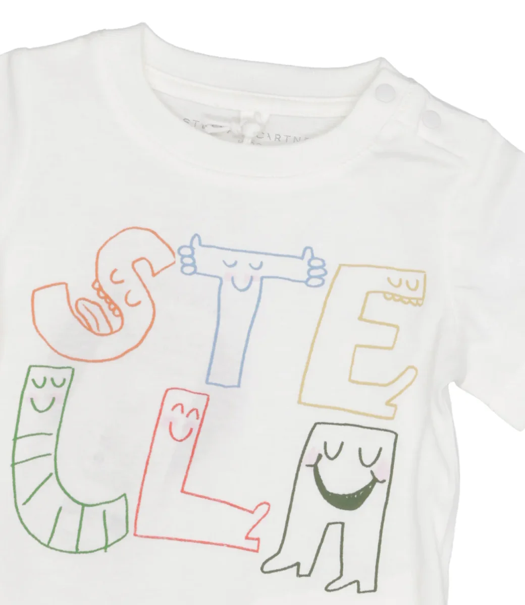 T-Shirt Stella McCartney Kids in morbido cotone organico, stampa con logo multicolor sul davanti. La t-shirt completa l’abbinamento con felpa e pantalone nella stessa fantasia.