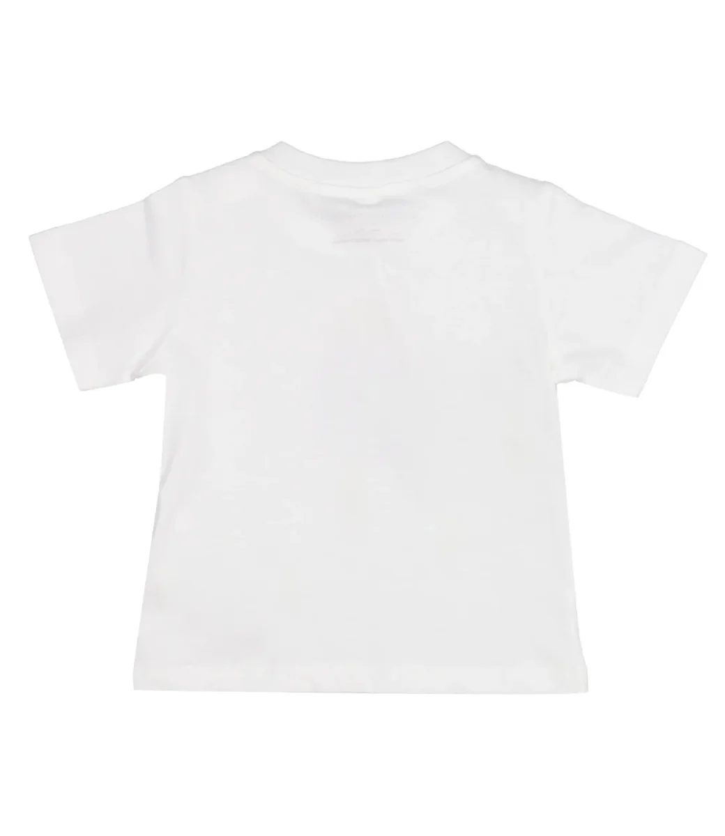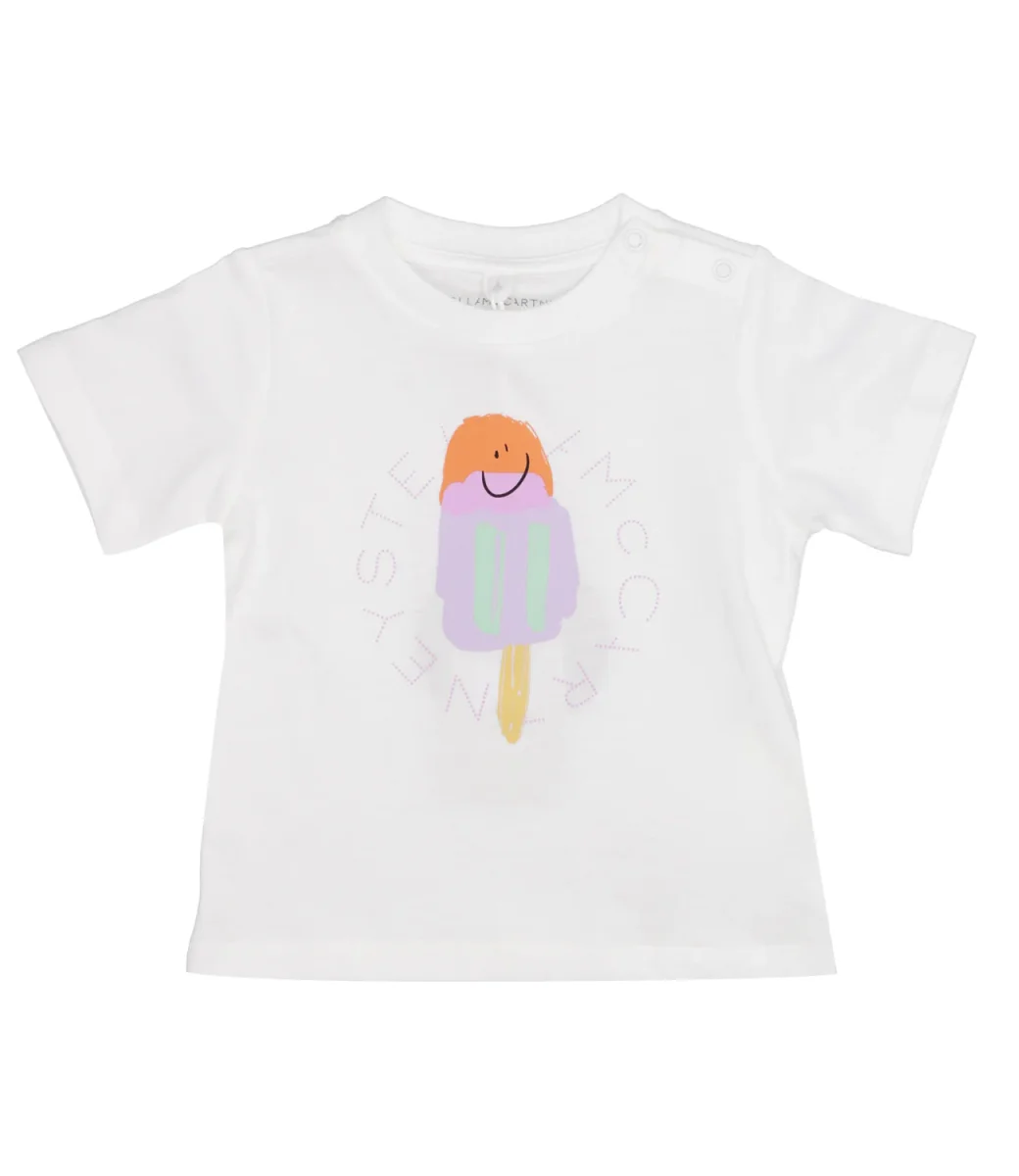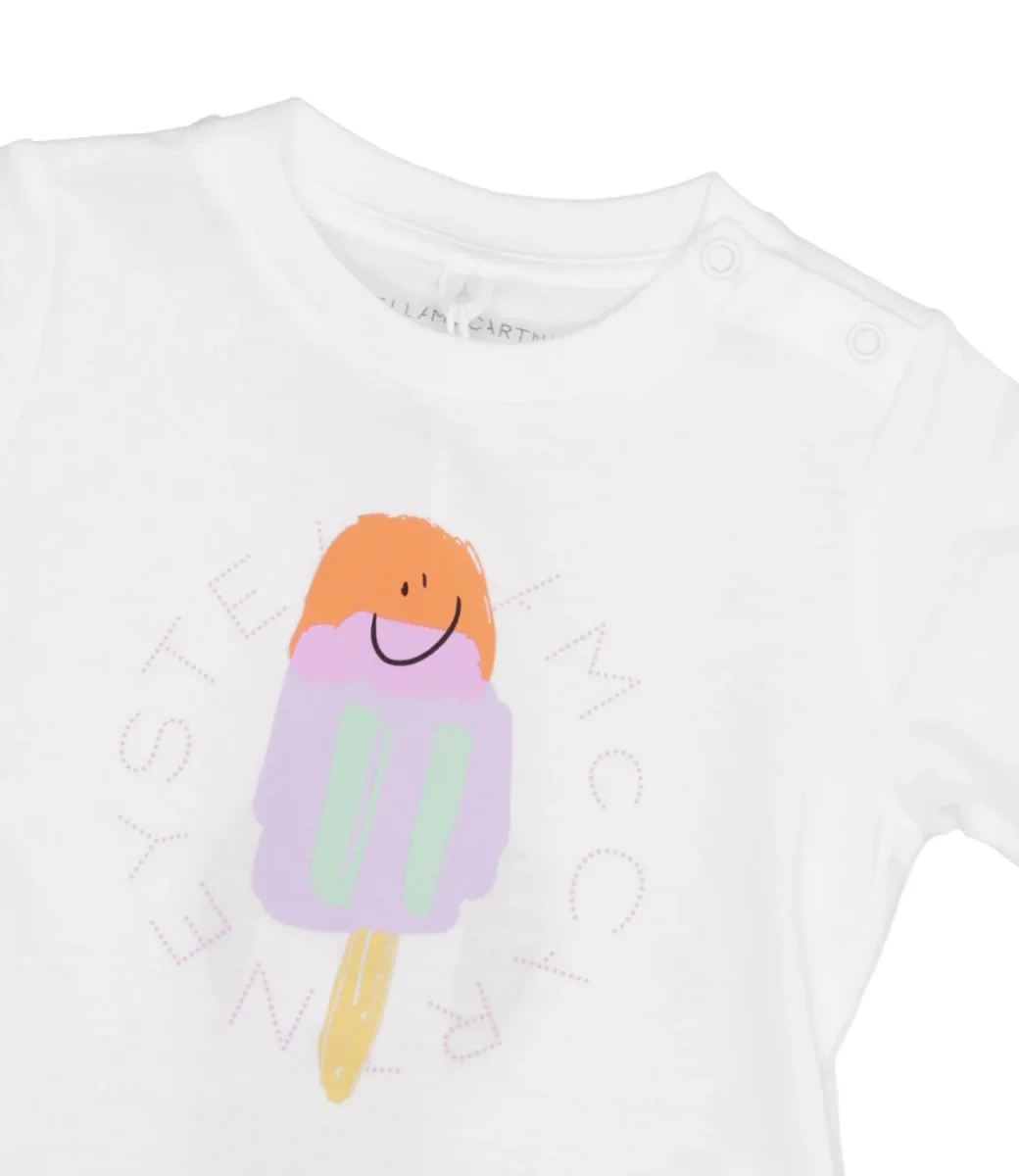 T-Shirt Stella McCartney Kids in morbido cotone organico, stampa con logo e gelato multicolor sul davanti. La t-shirt completa l’abbinamento con felpa e pantalone nella stessa fantasia.