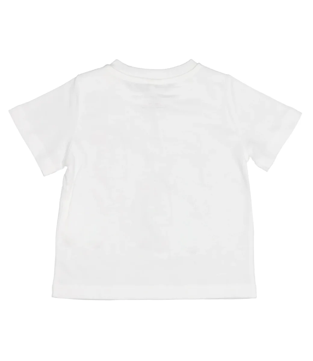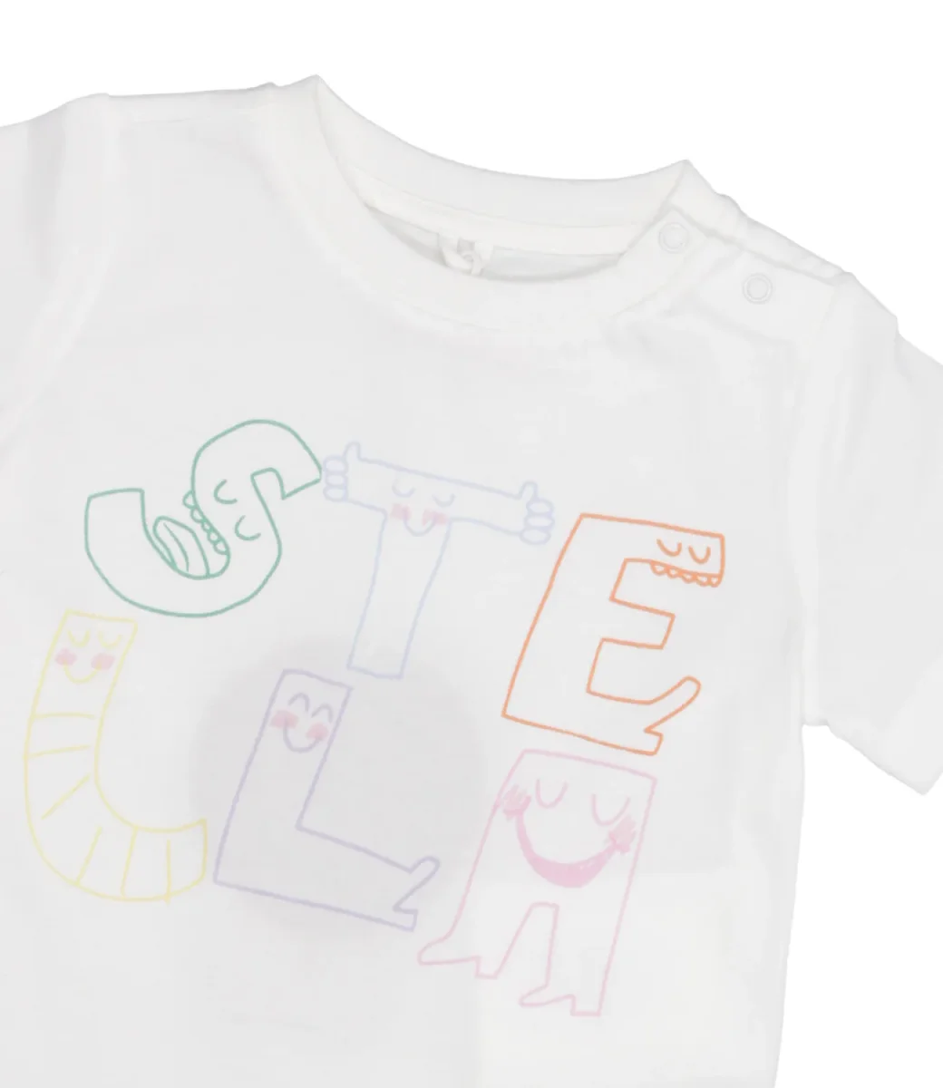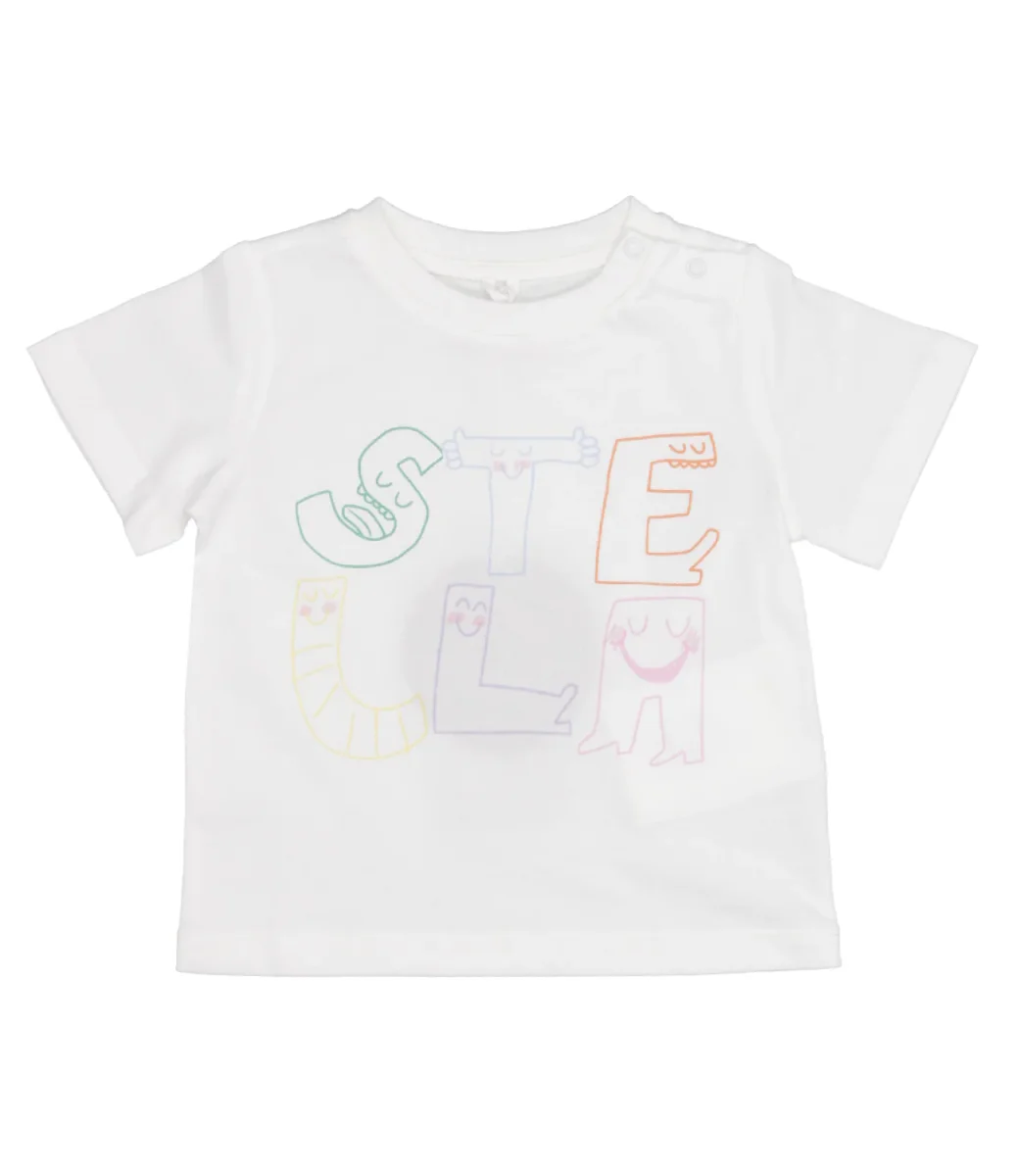 T-Shirt Stella McCartney Kids in morbido cotone organico, stampa con logo multicolor sul davanti. La t-shirt completa l’abbinamento con felpa e pantalone nella stessa fantasia.