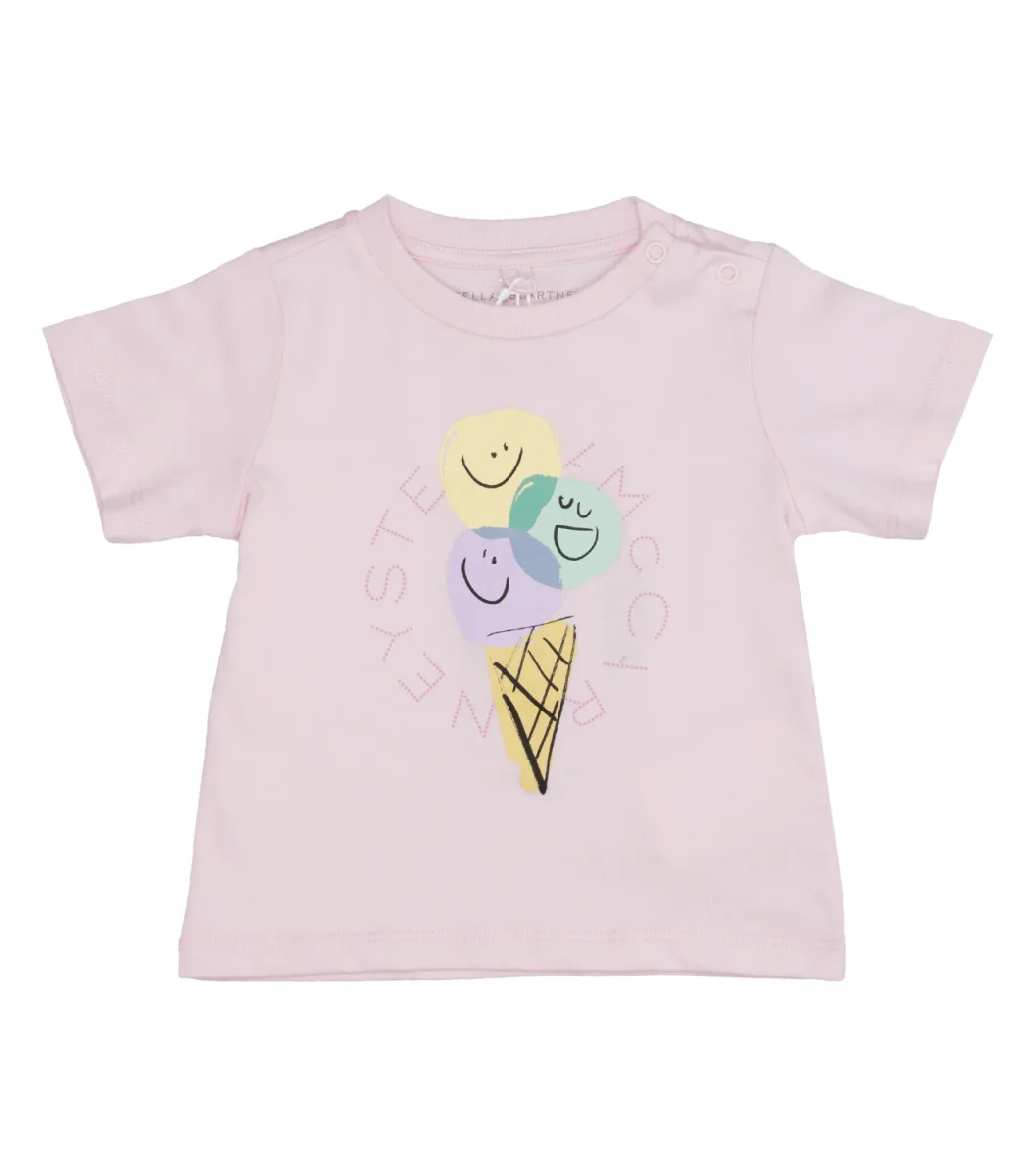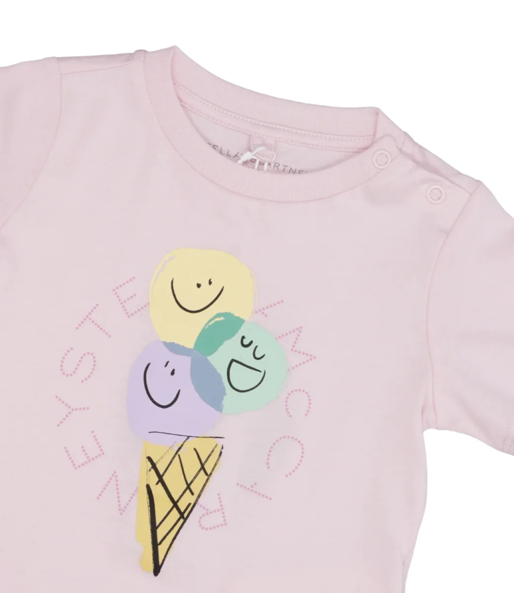 T-Shirt Stella McCartney Kids in morbido cotone organico, stampa con logo e gelato multicolor sul davanti. La t-shirt completa l’abbinamento con felpa e pantalone nella stessa fantasia.