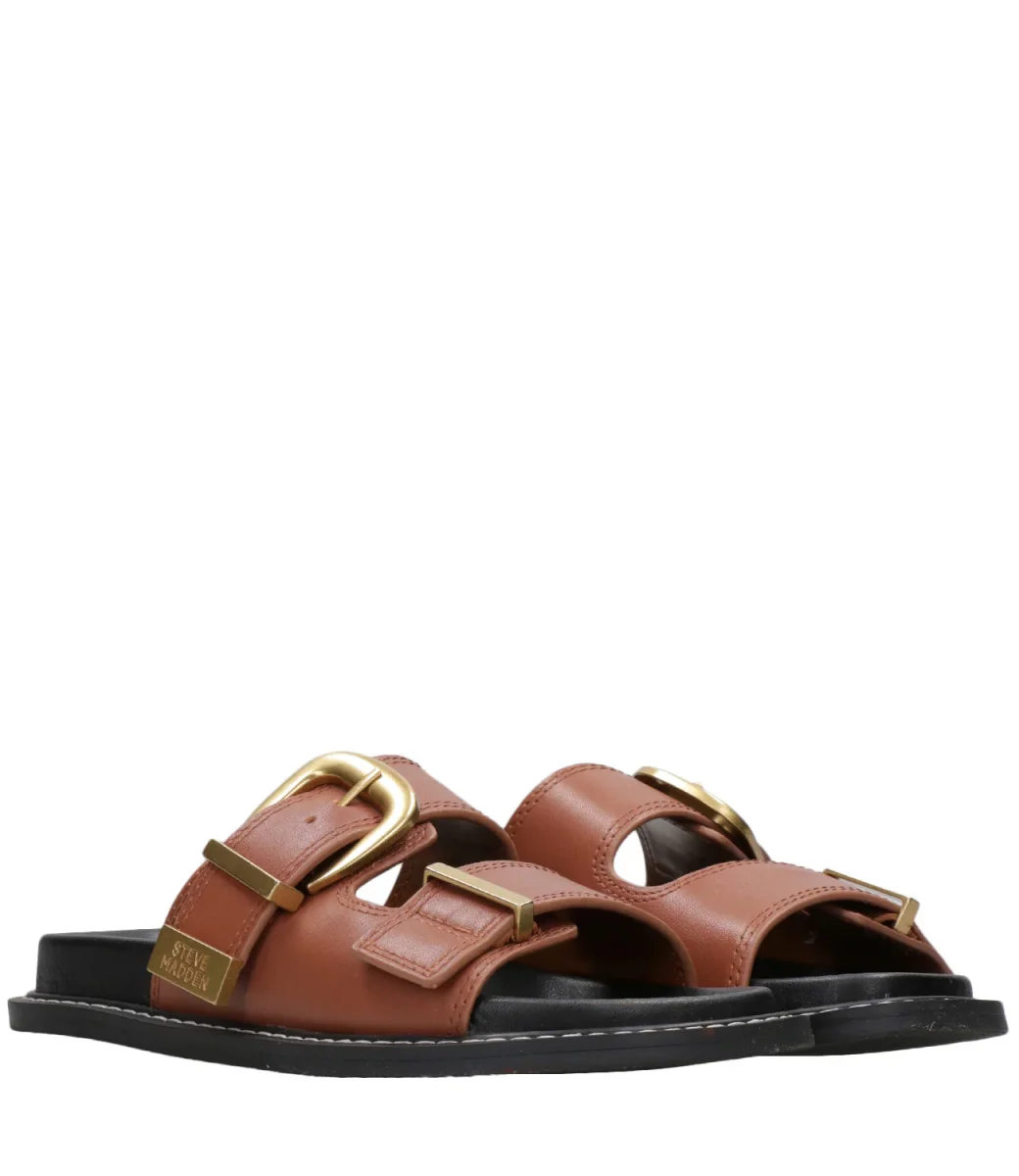 Ciabatta Steve Madden Arch realizzata in pelle, modello a doppia fascia superiore con fibbia in metallo dorato che ne permette di regolare la misura, fondo ergonomico, suola in gomma.