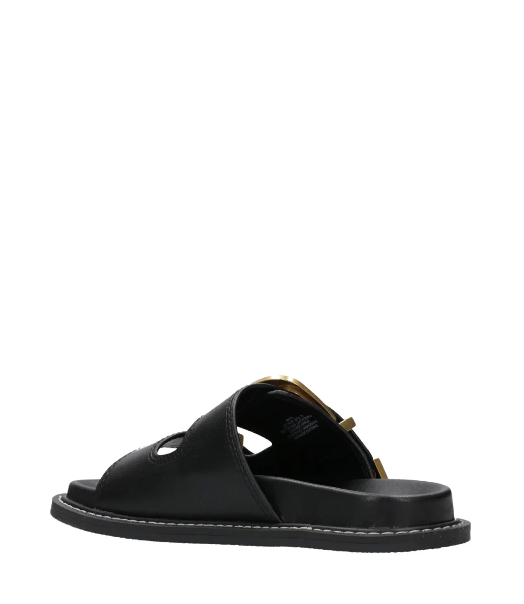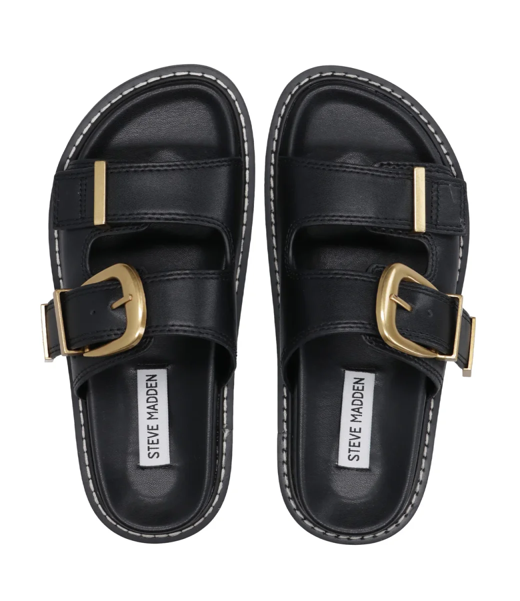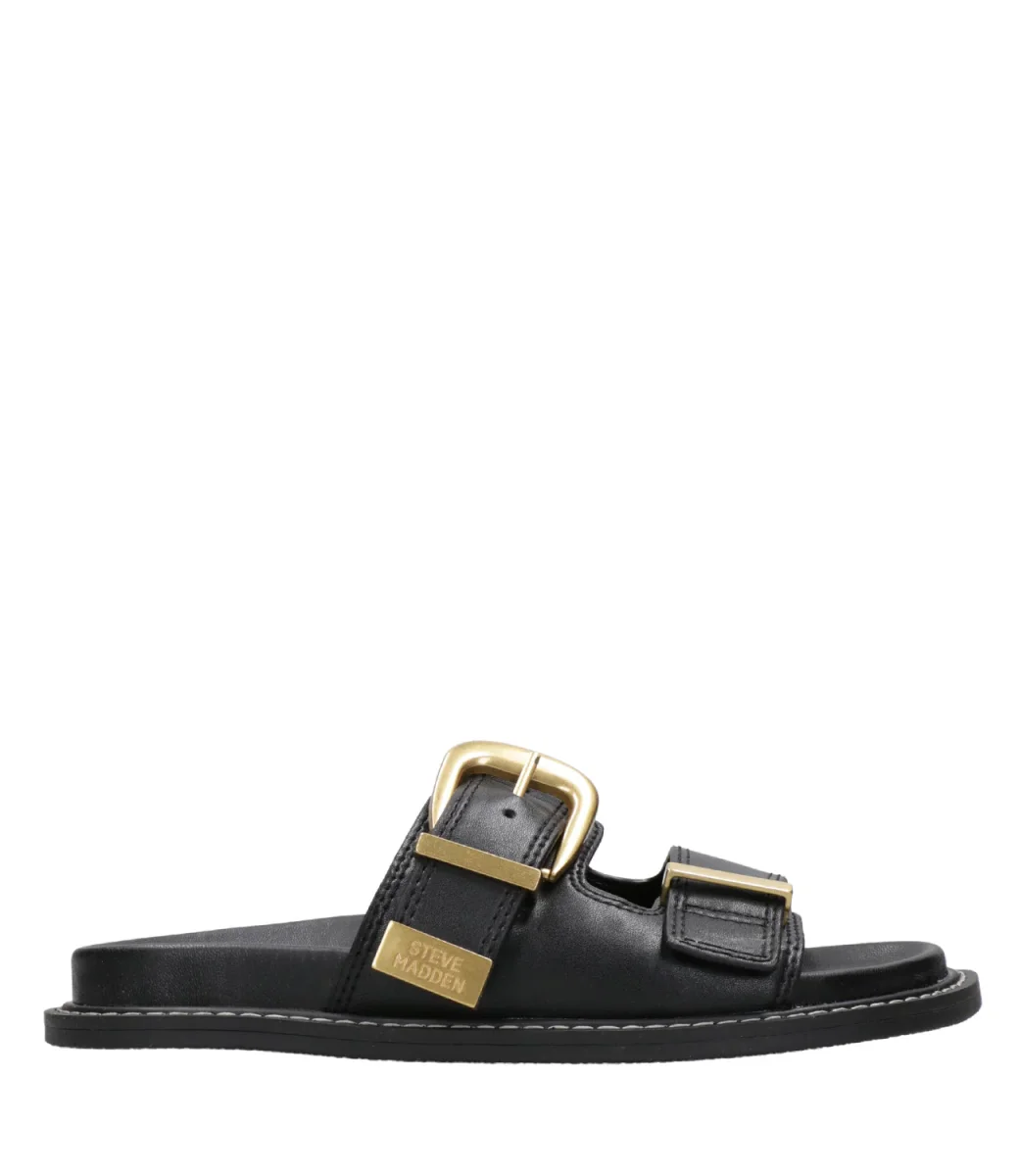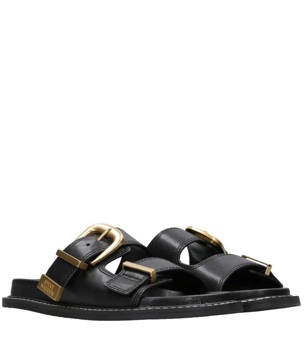 Ciabatta Steve Madden Arch realizzata in pelle, modello a doppia fascia superiore con fibbia in metallo dorato che ne permette di regolare la misura, fondo ergonomico, suola in gomma.