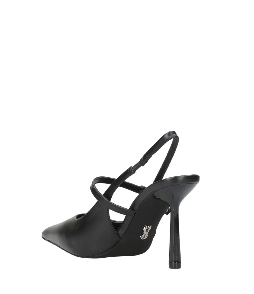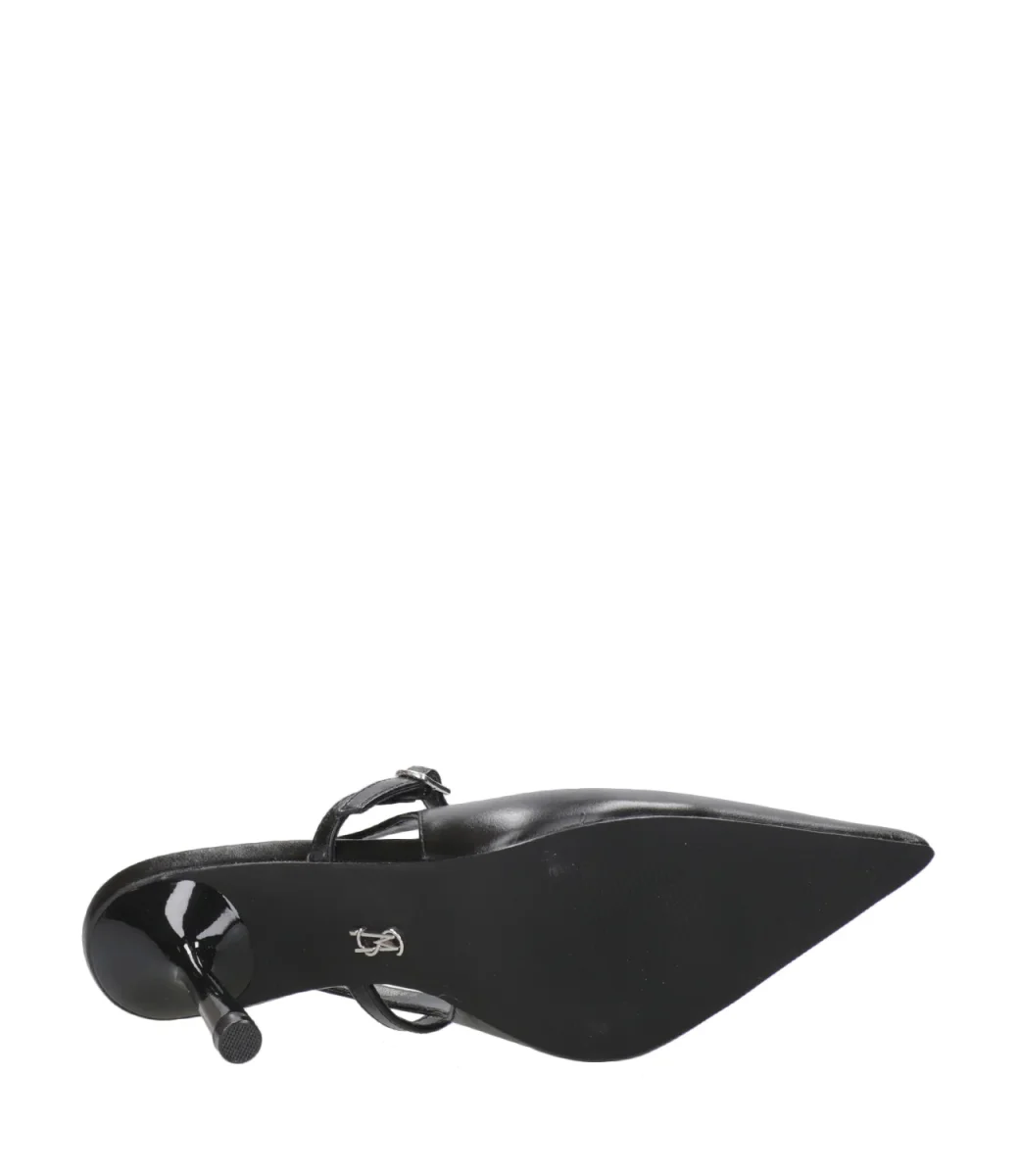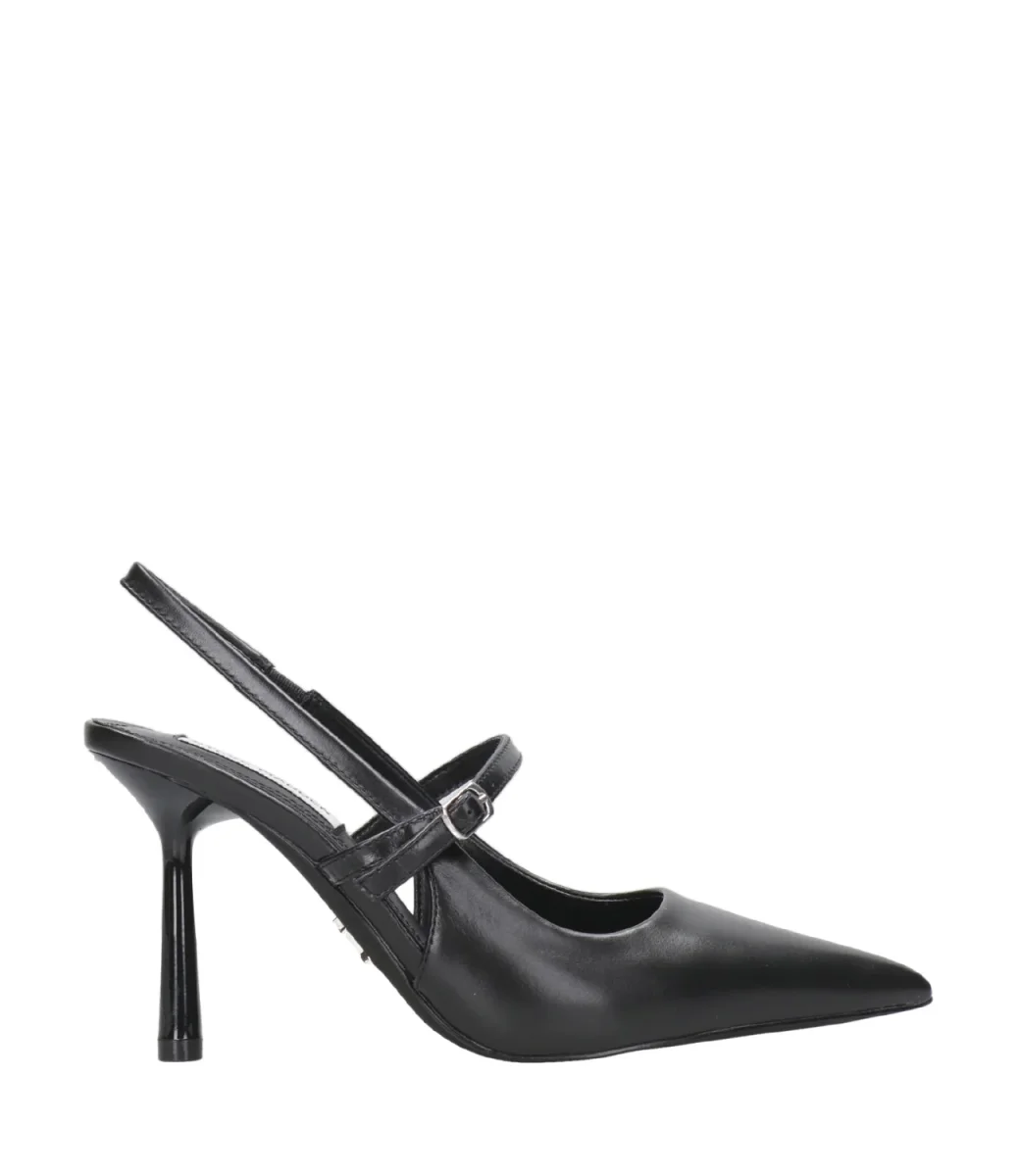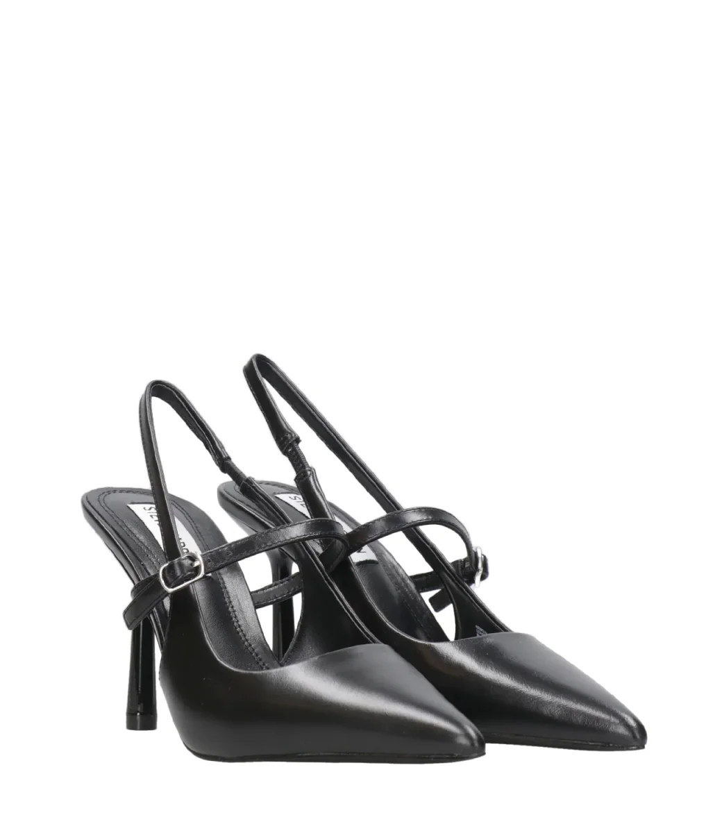 Decolletè Steve Madden Armour in pelle, slingback a punta presenta, fascetta retrotallone in pelle con inserto elastico, con cinturino con fibbia regolabile sul collo del piede, modello a punta, tacco a rocchetto sottile, logo in metallo sotto la suola.