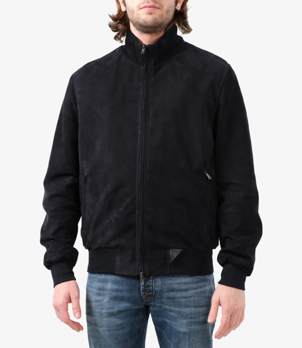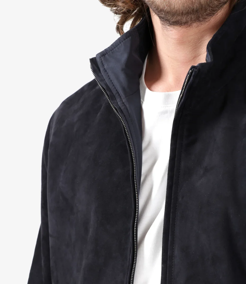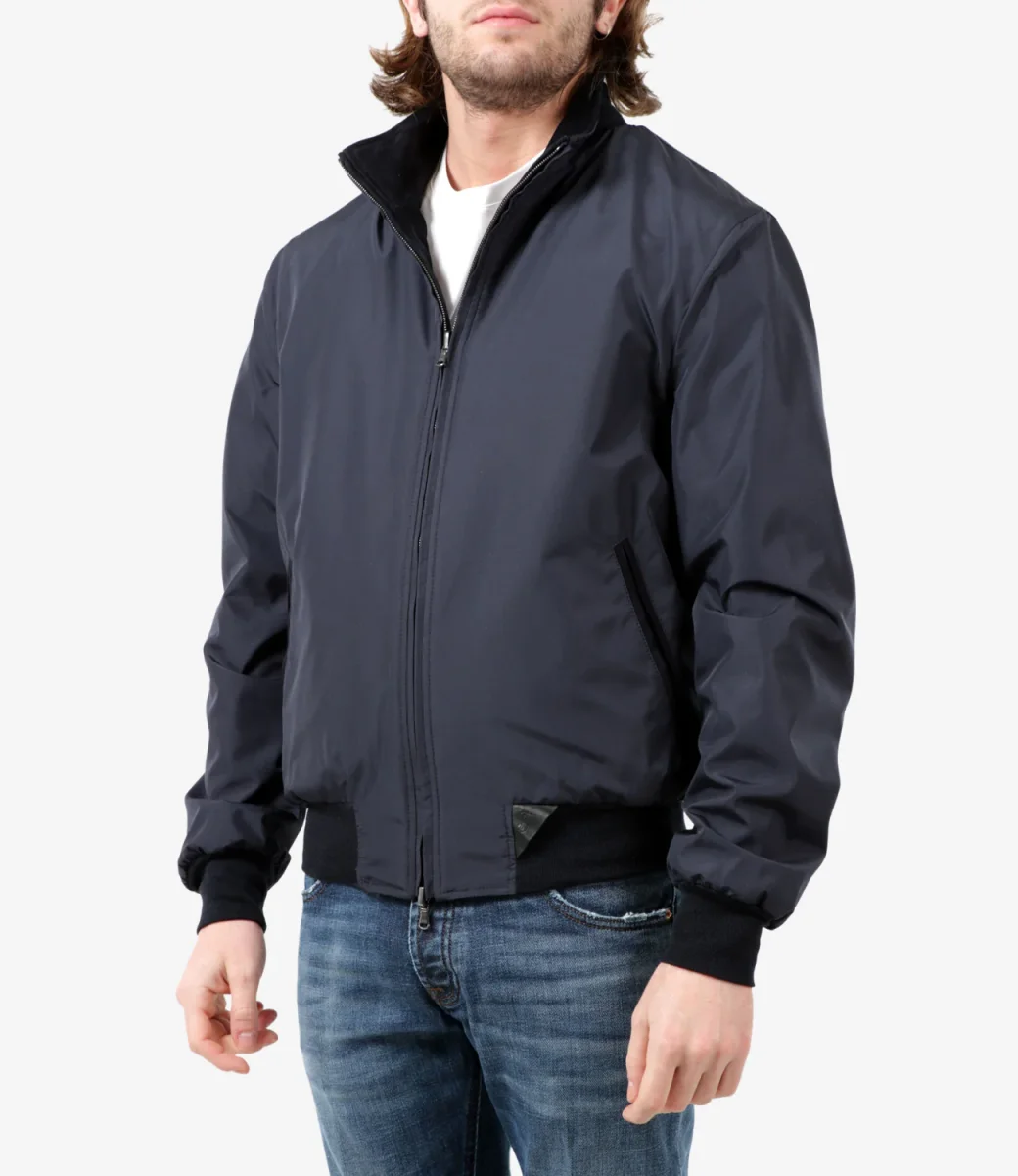 Giubbotto Stewart Furio in suede blu reversibile in nylon, collo dritto con interno in maglia, chiusura frontale con zip a doppio cursore, tasche a filo laterali con zip, maniche lunghe, orlo e polsini a coste.