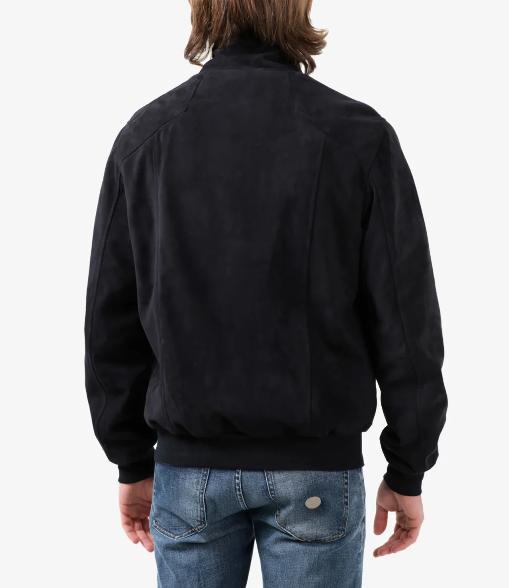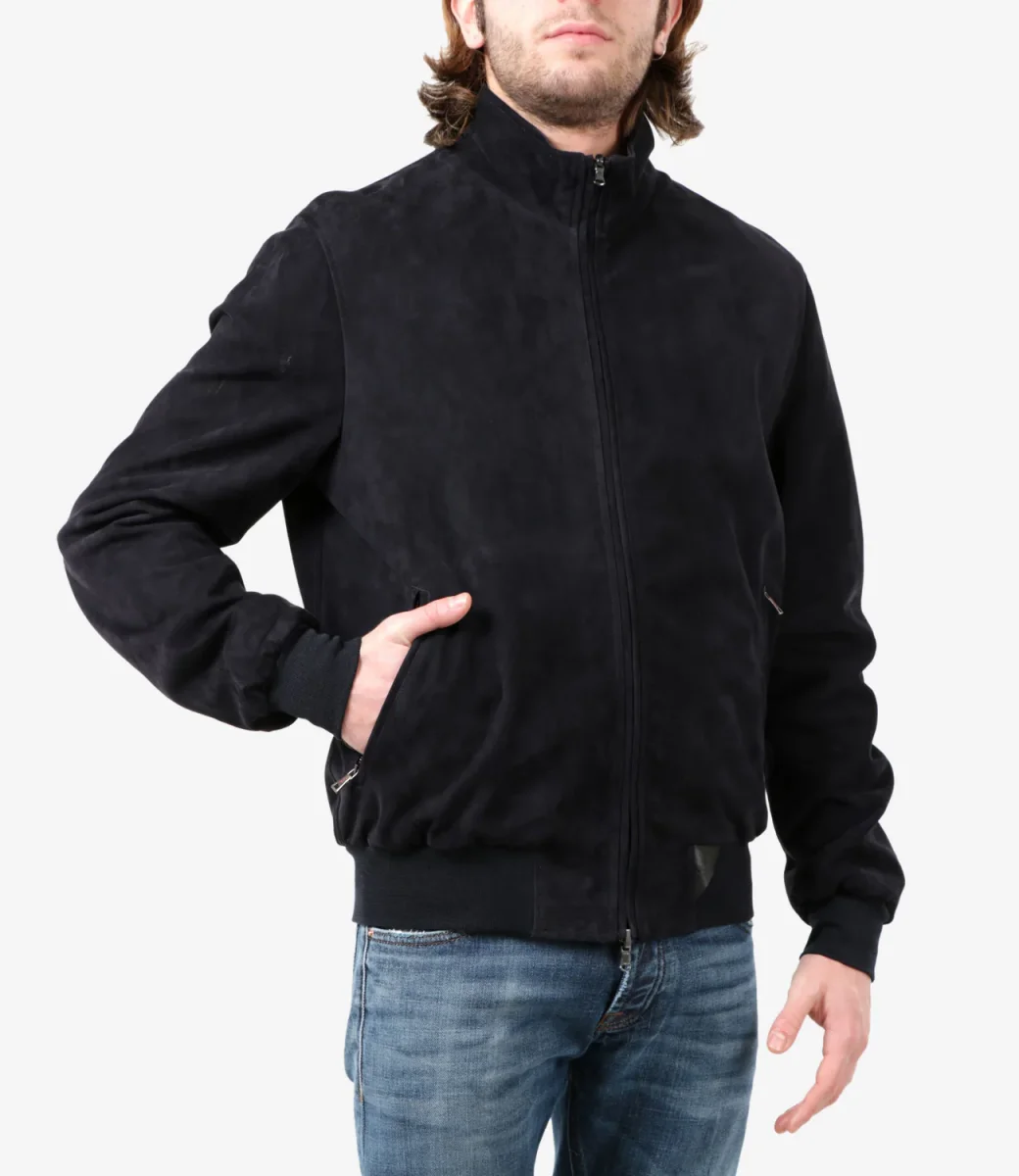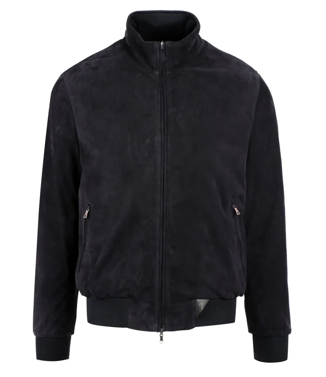 Giubbotto Stewart Furio in suede blu reversibile in nylon, collo dritto con interno in maglia, chiusura frontale con zip a doppio cursore, tasche a filo laterali con zip, maniche lunghe, orlo e polsini a coste.
