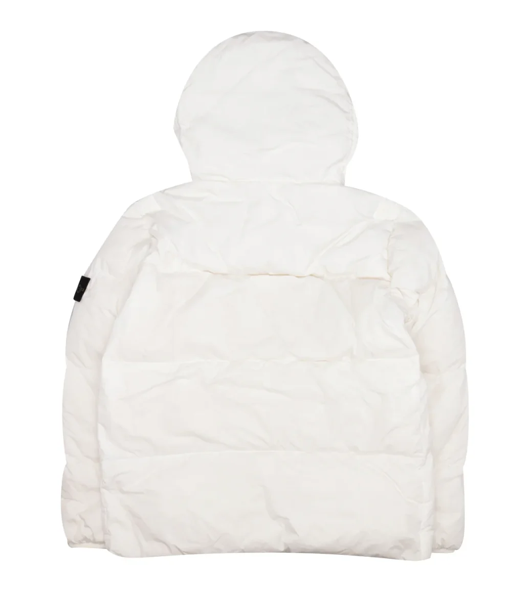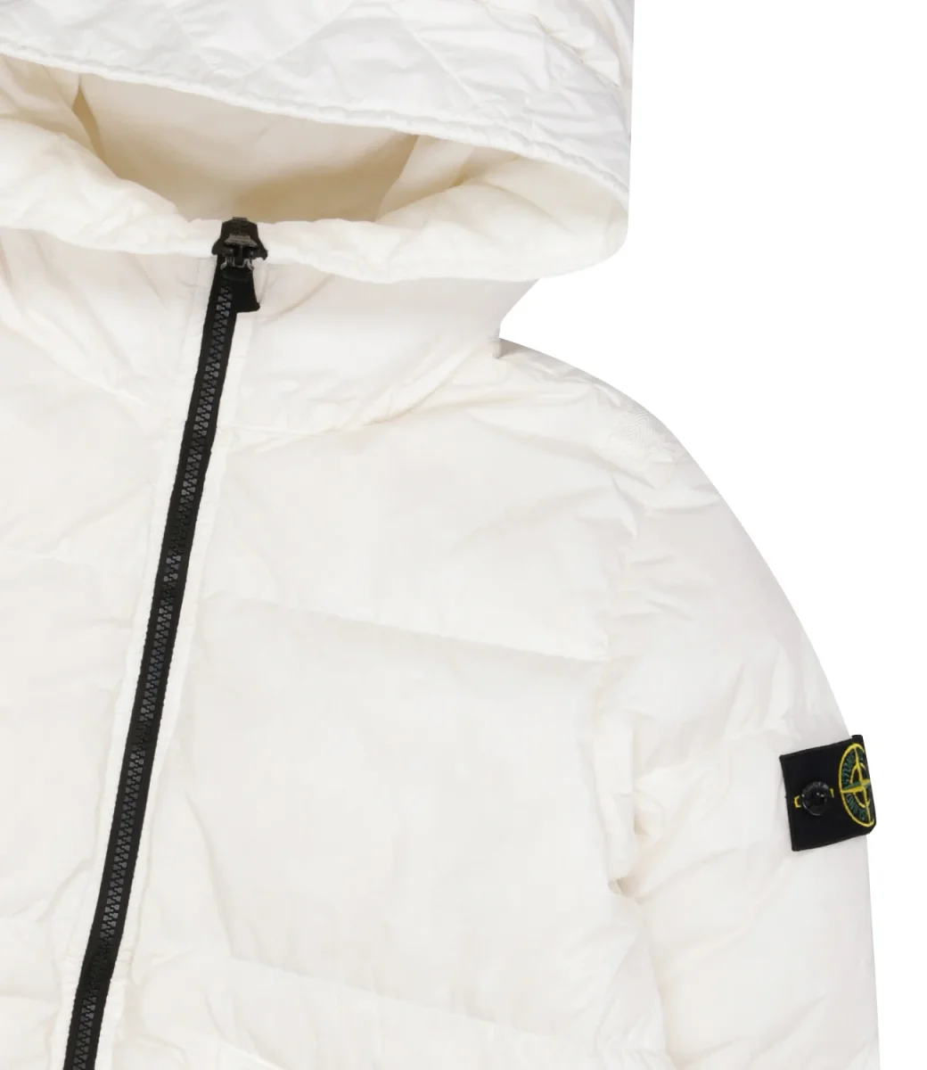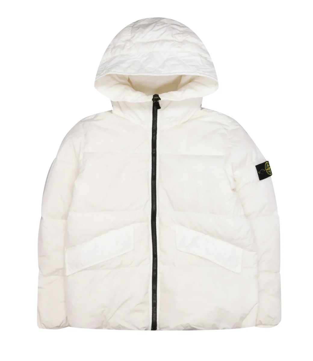 Piumino Stone Island Junior con cappuccio realizzato in reps di nylon leggero riciclato ultra battuto. Resinato all’interno per un’azione antivento e moderatamente antipioggia. A causa della resinatura, il colore penetra in modo non uniforme nel materiale, conferendo un aspetto increspato alla superficie. L’aggiunta di uno speciale agente alla ricetta di tintura rende il capo antigoccia.