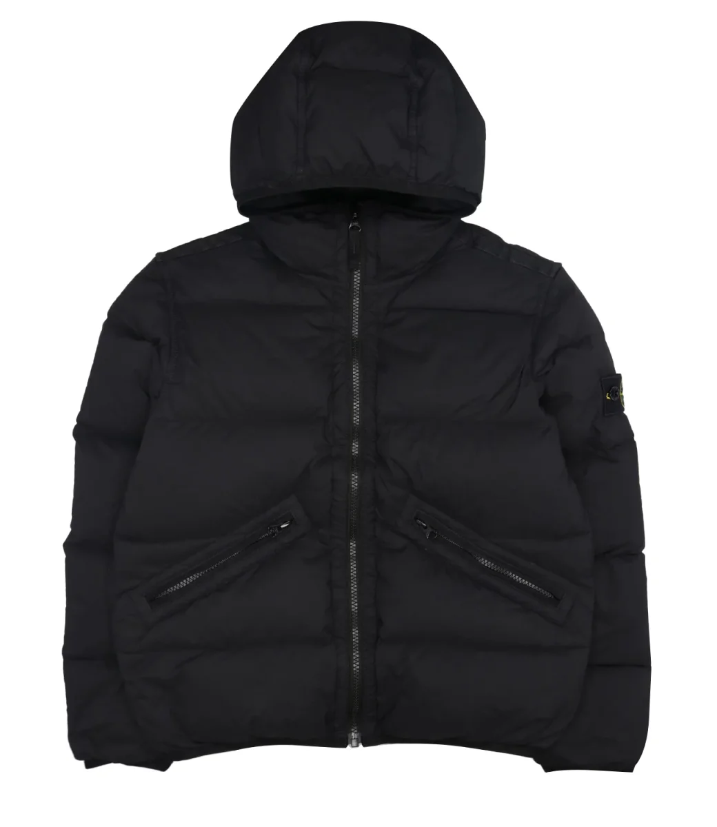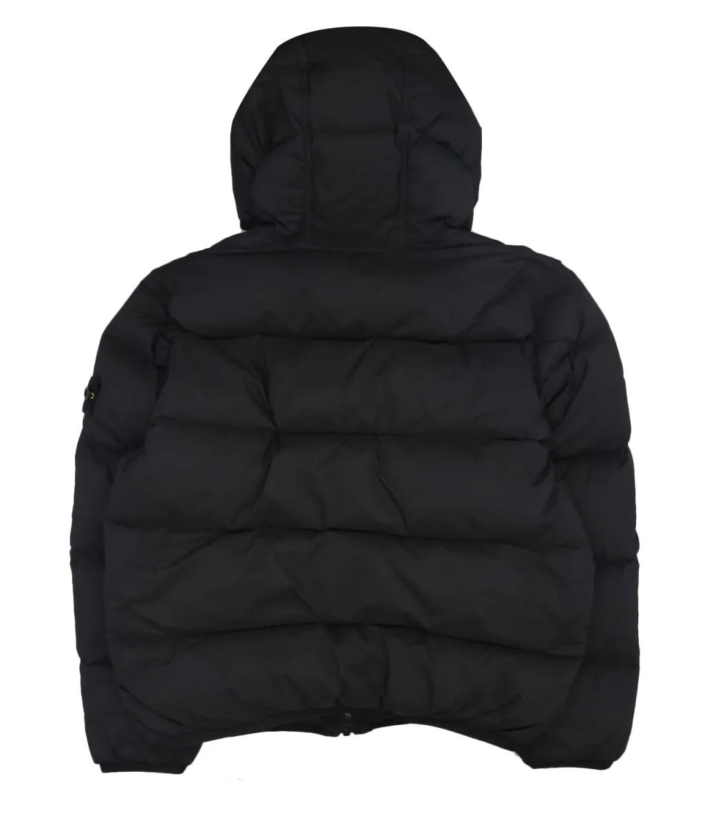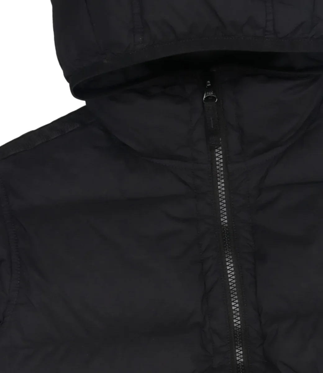Piumino Stone Island Junior in tessuto tecnico, cappuccio, canali senza cuciture per massima tenuta, imbottitura in piuma d’anatra 90/10 a iniezione diretta, tinto in capo con trattamento antigoccia, chiusura con zip, tasche con zip, badge su manica.