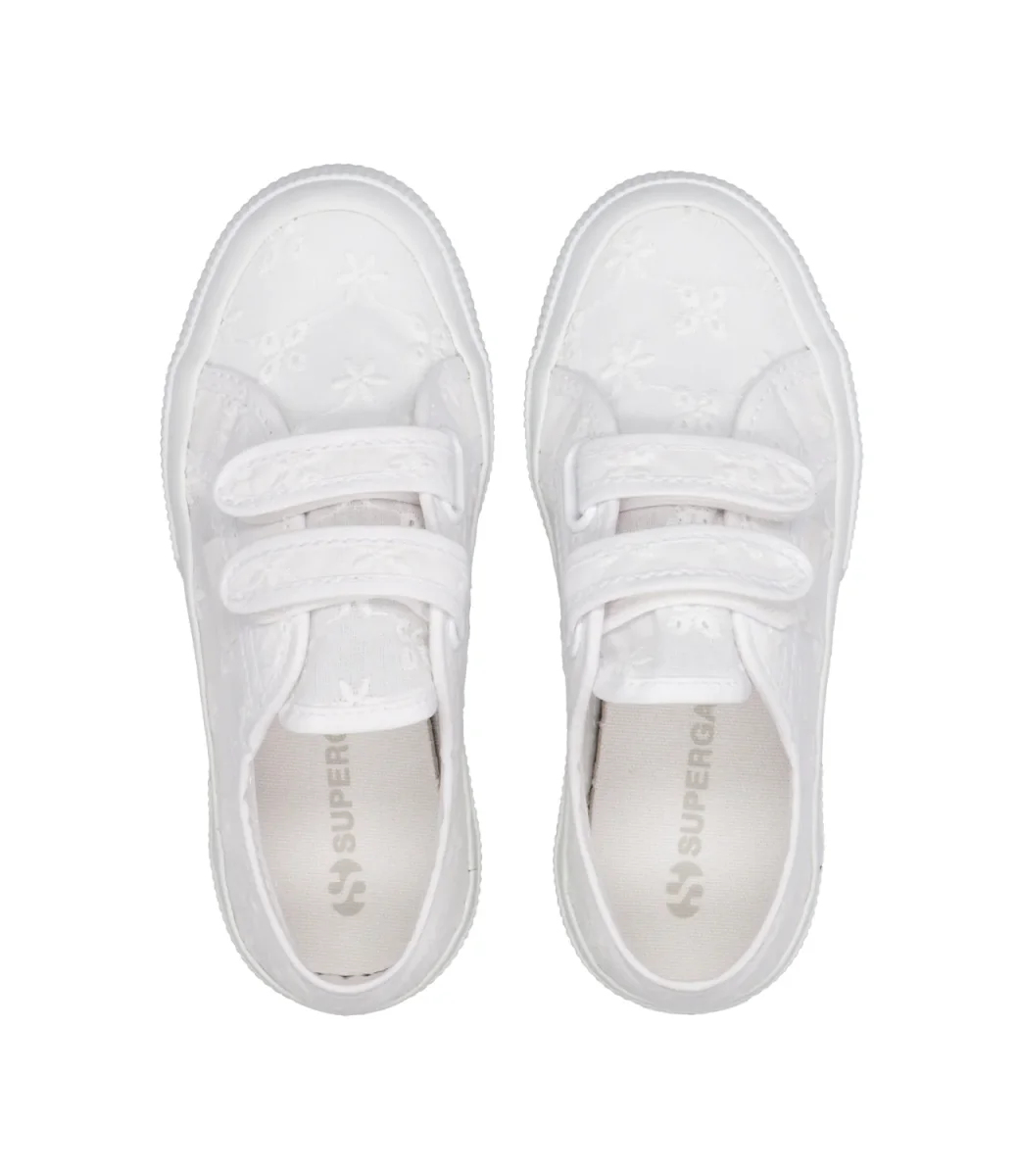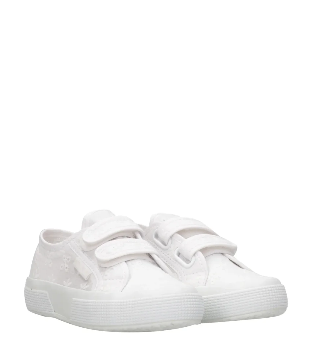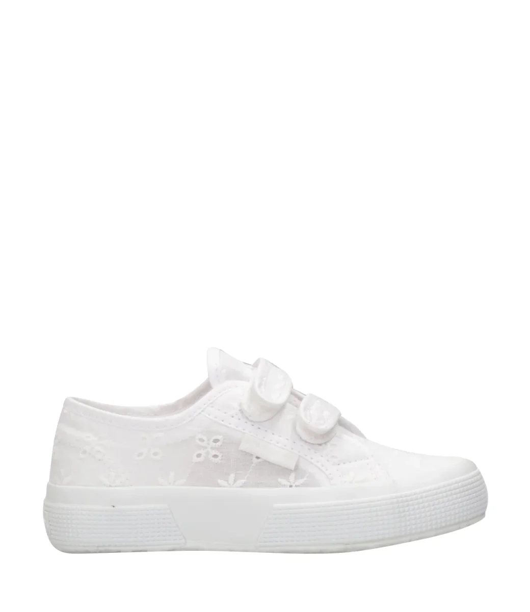 Sneakers Superga Kids 2750 Kids Straps Flower con tomaia in cotone sangallo dal motivo floreale ricamato. Modello dalla classica silhouette classica low top rivisitato con chiusura superiore a strappo con velcro, ideale per completare outfit speciali.