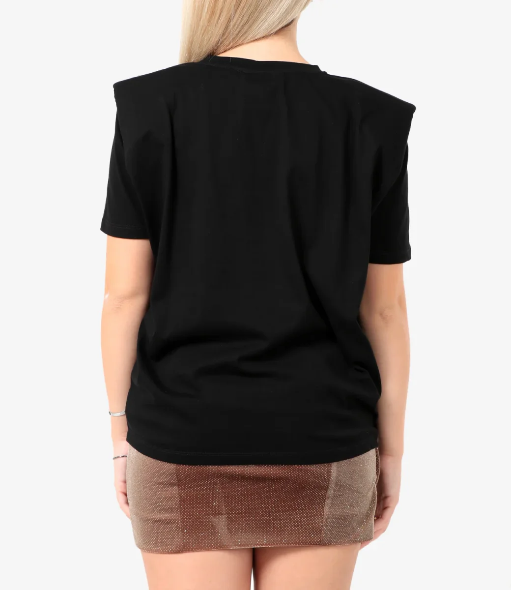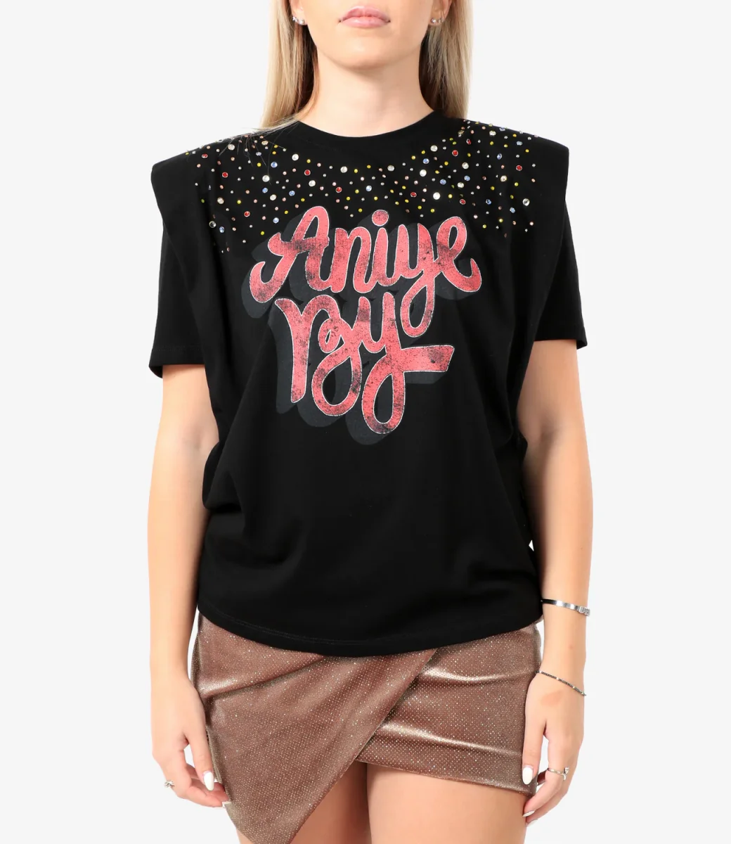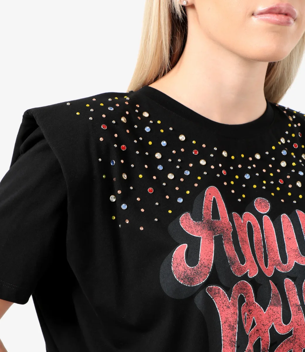 T-Shirt Aniye By Kristal in cotone nero, girocollo, spalline, stampa frontale con decorazioni borchie e strass