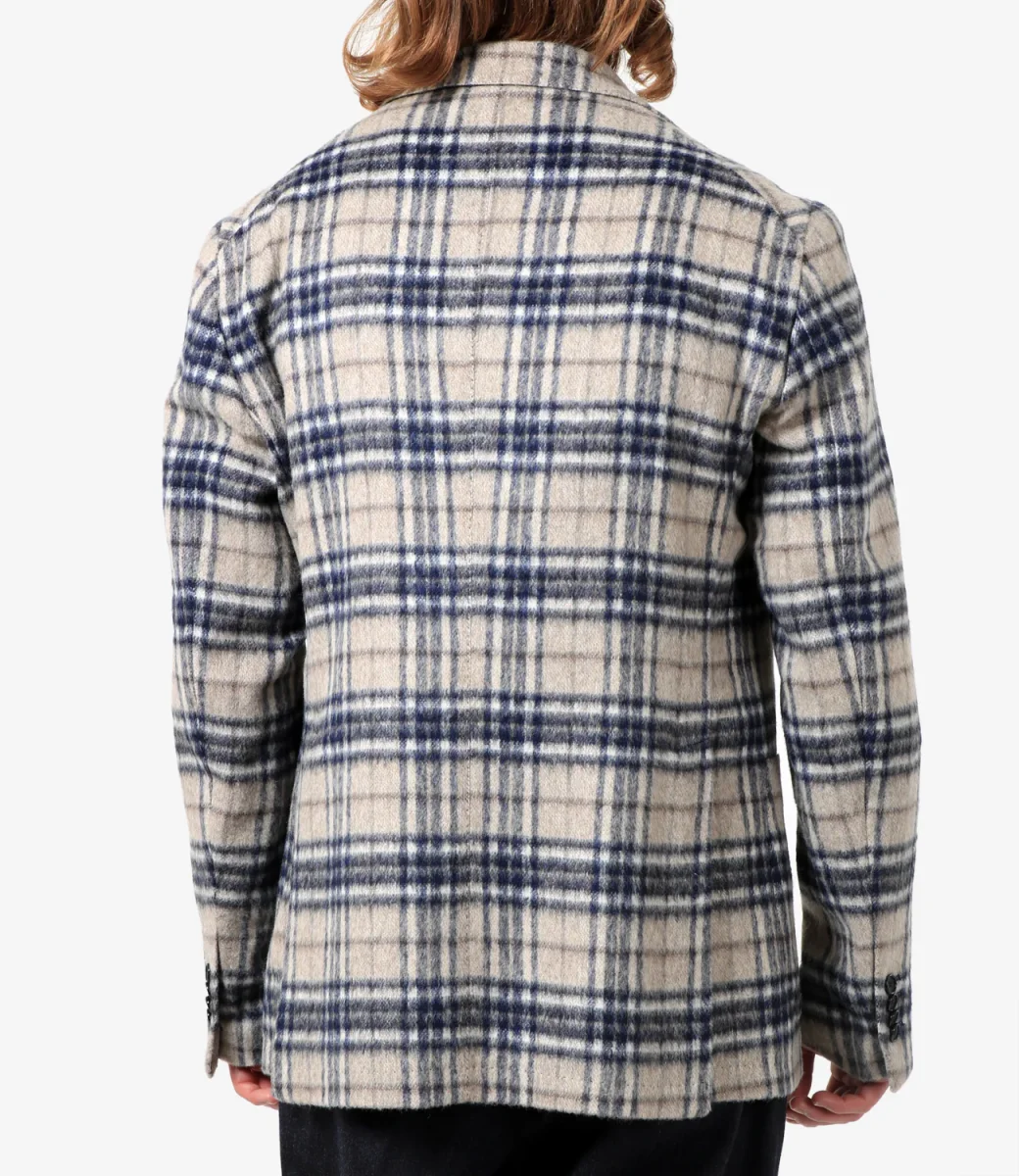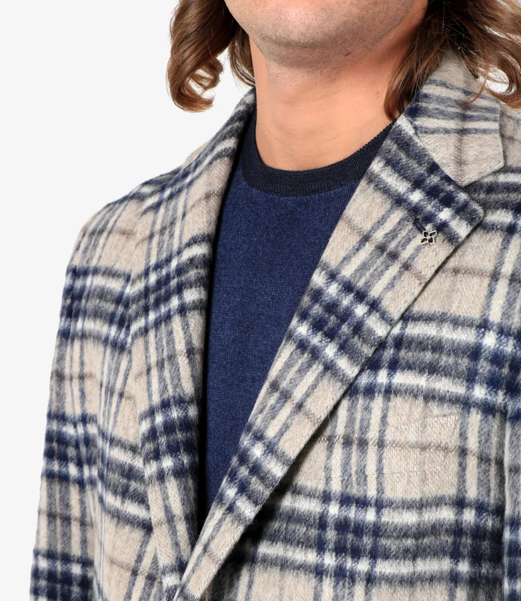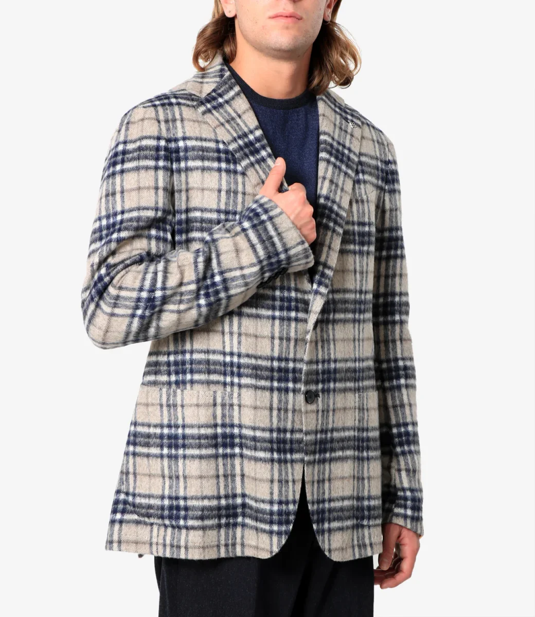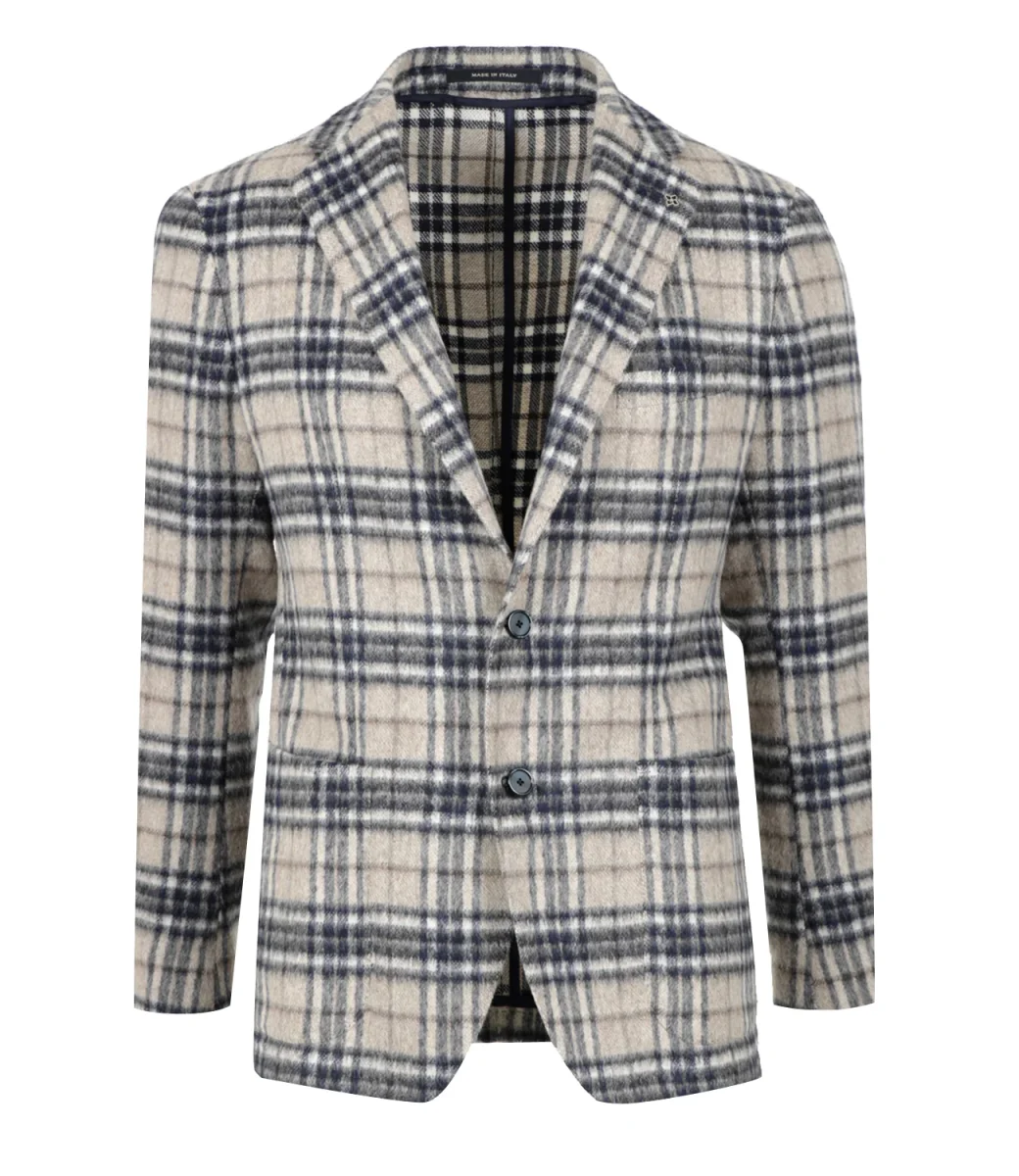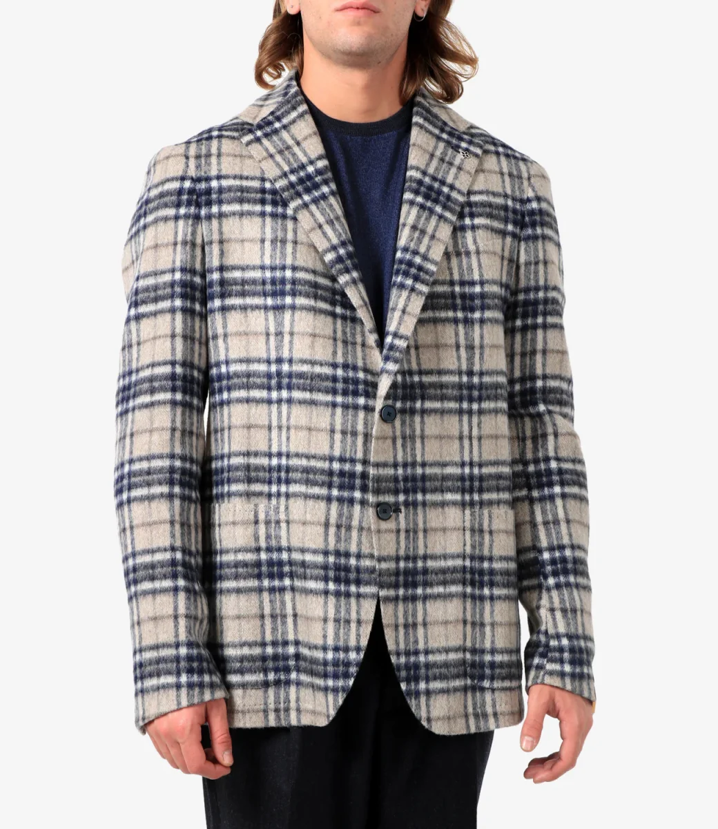 Giacca Tagliatore in lana vergine a quadri sui toni del beige e blu, revers classici, abbottonatura monopetto, taschino sul torace, tasche a patta applicate e maniche lunghe.