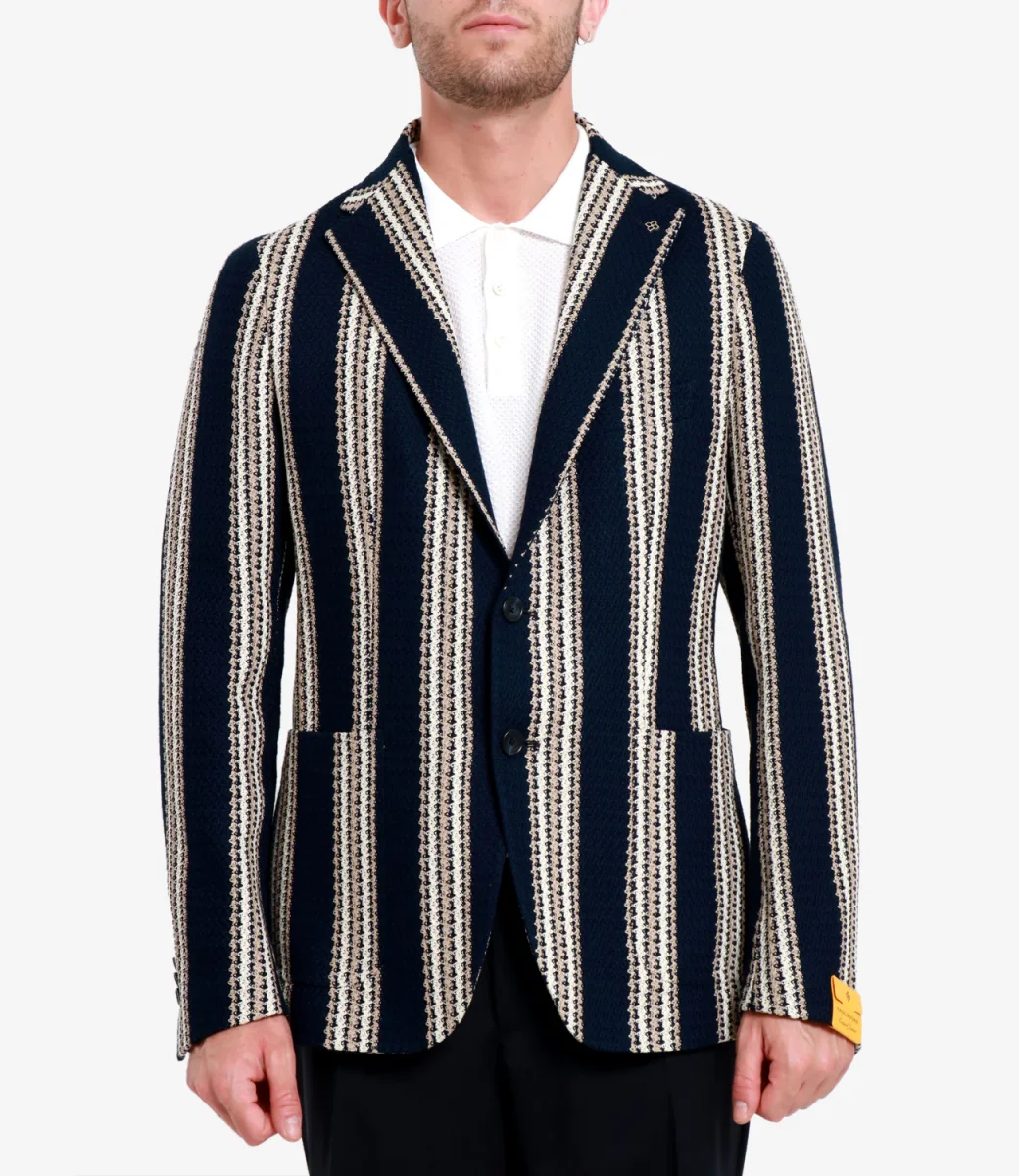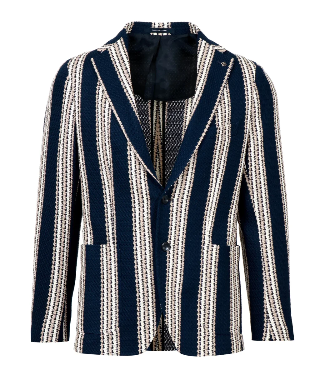 Giacca Tagliatore in cotone con fantasia verticale in colore alternato. Modello monopetto, taschino sul petto, tasche applicate sul davanti e maniche lunghe.