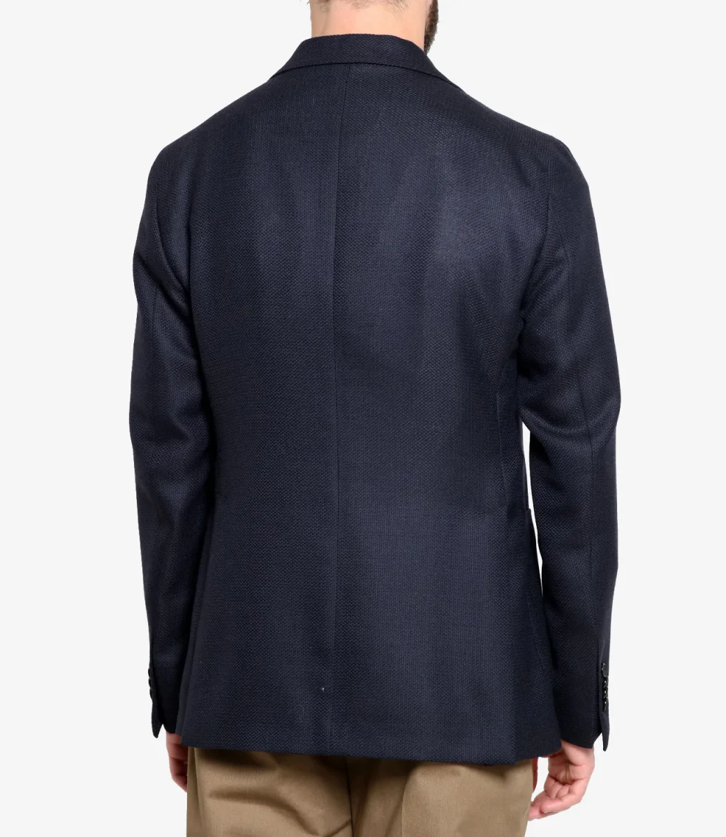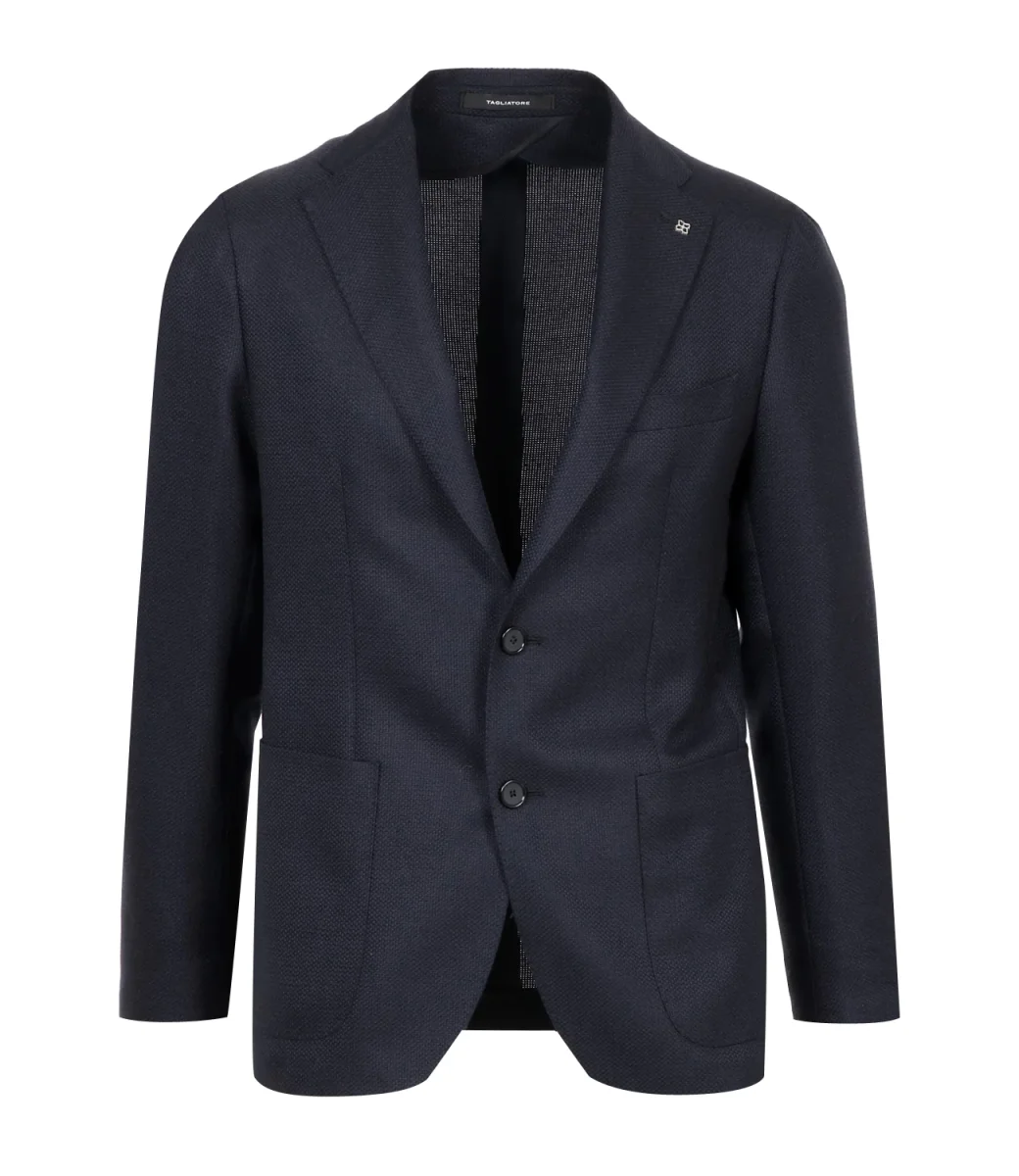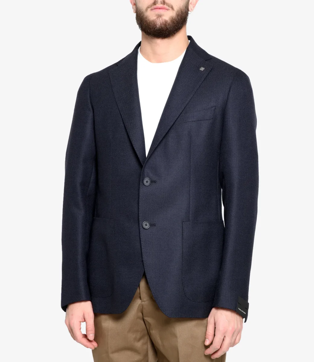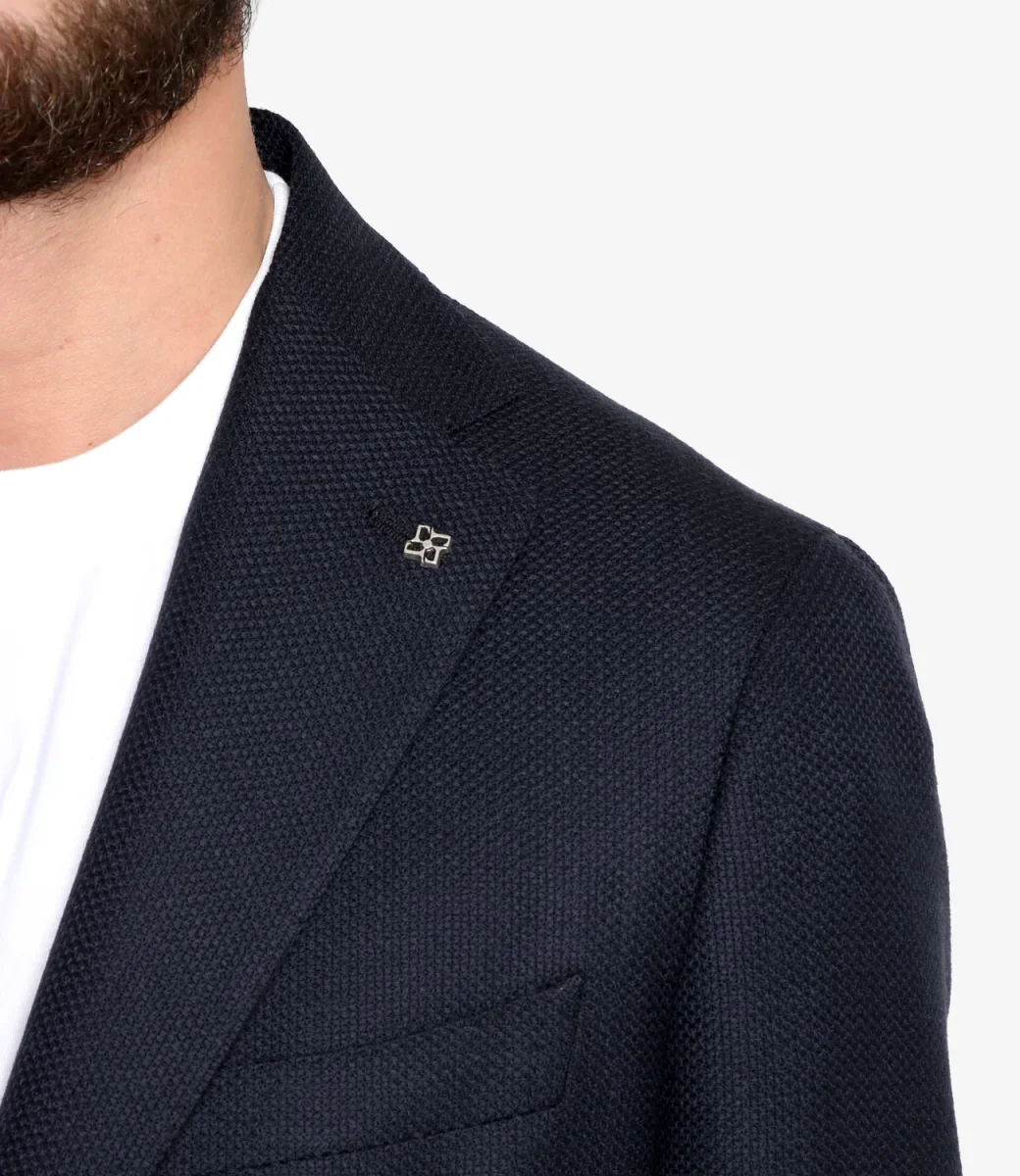 Giacca monopetto in lana vergine con revers classici e chiusura frontale con bottoni.