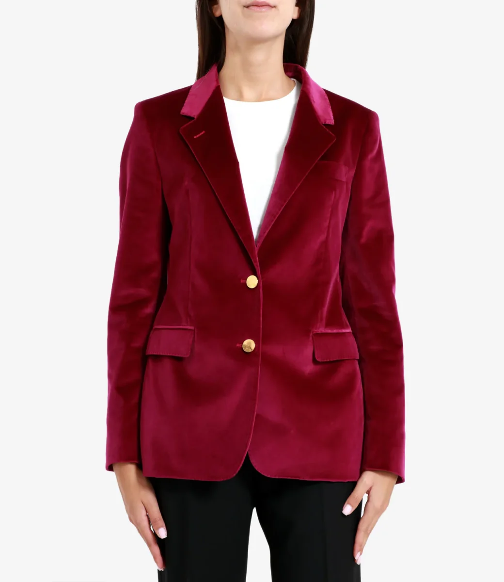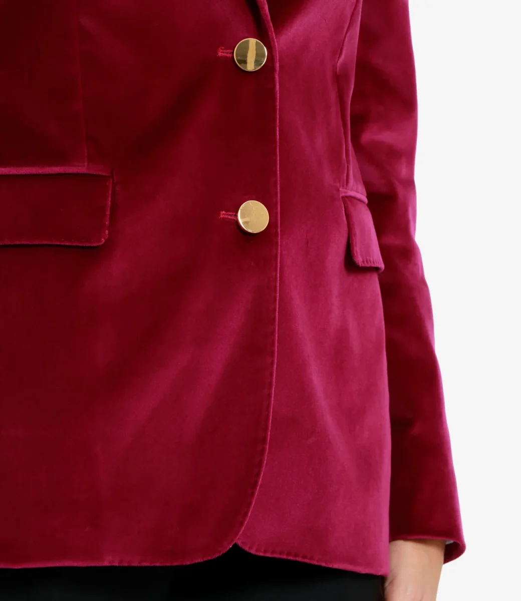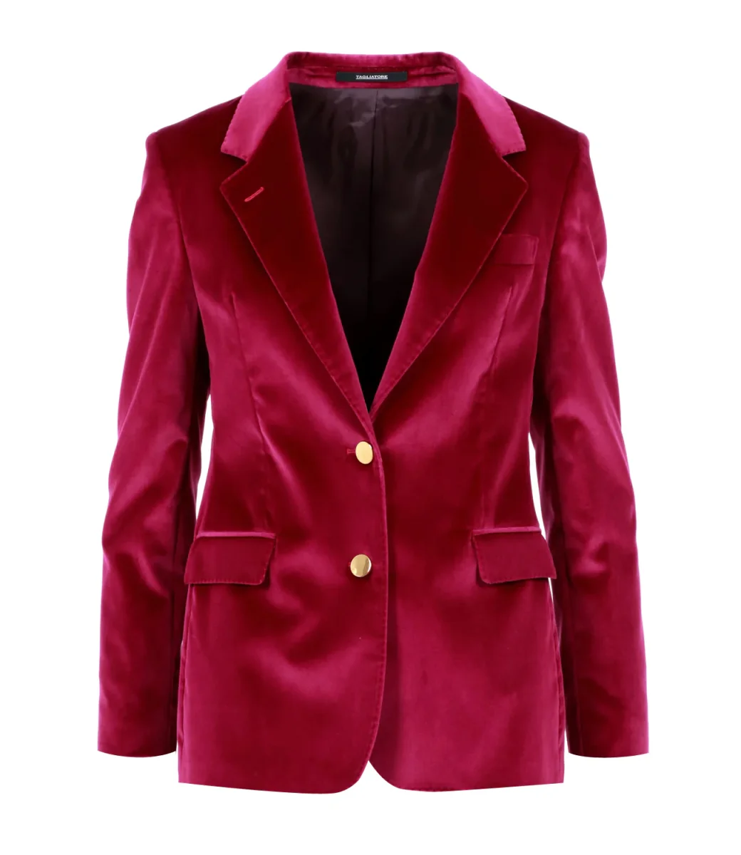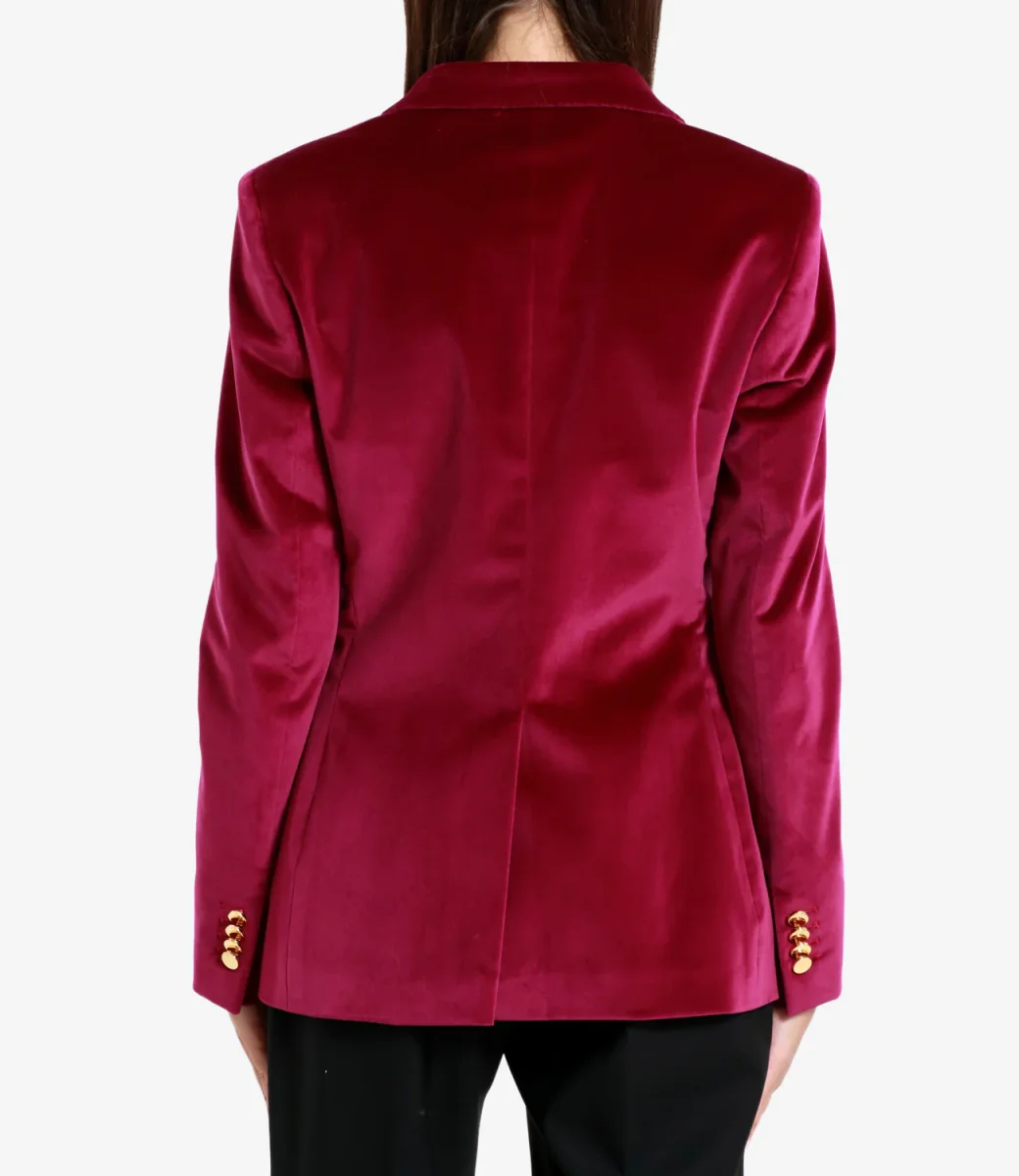 Giacca Tagliatore in velluto fuxia con scollo a doppio petto, bottoni e tasche frontali.